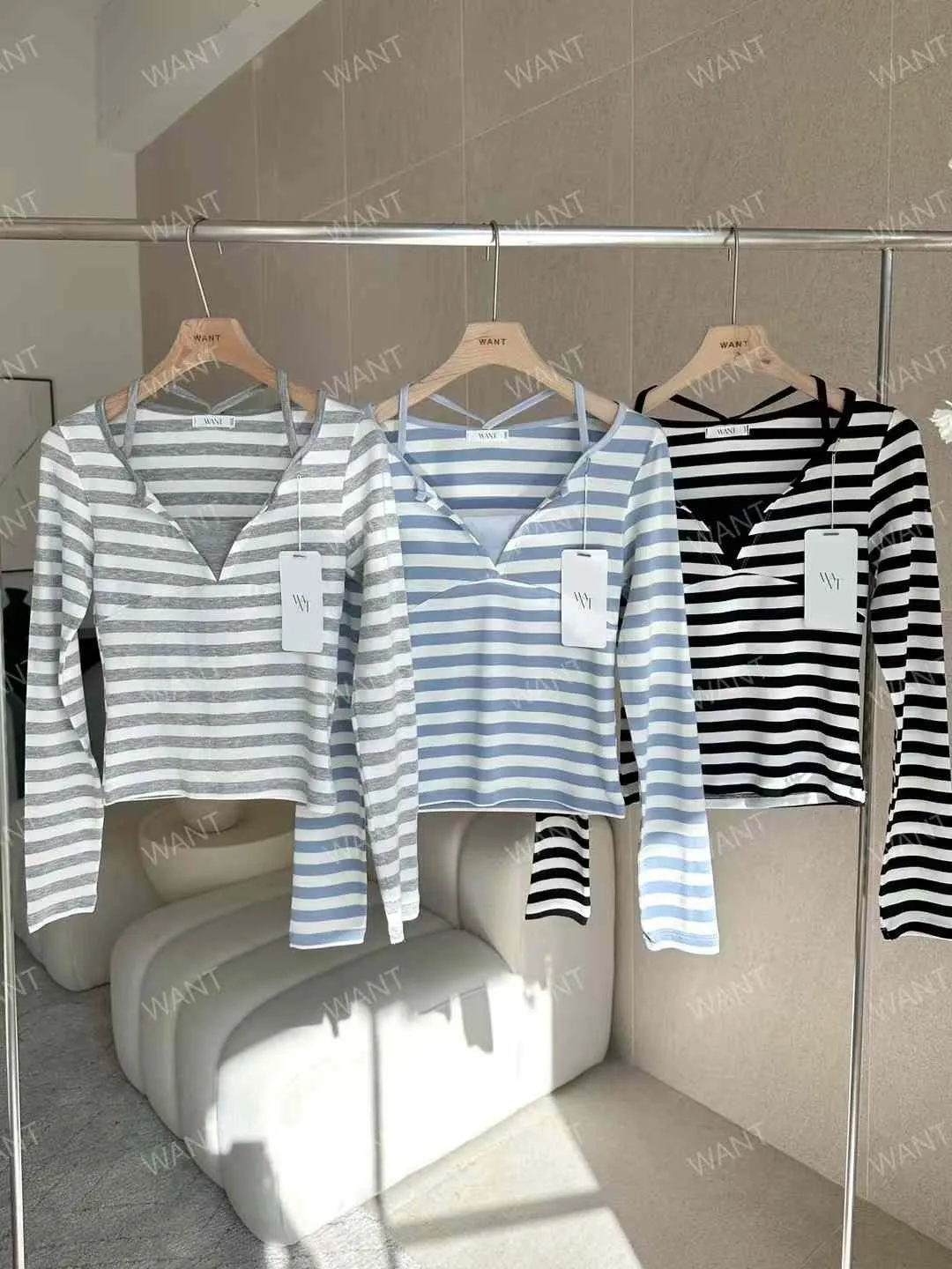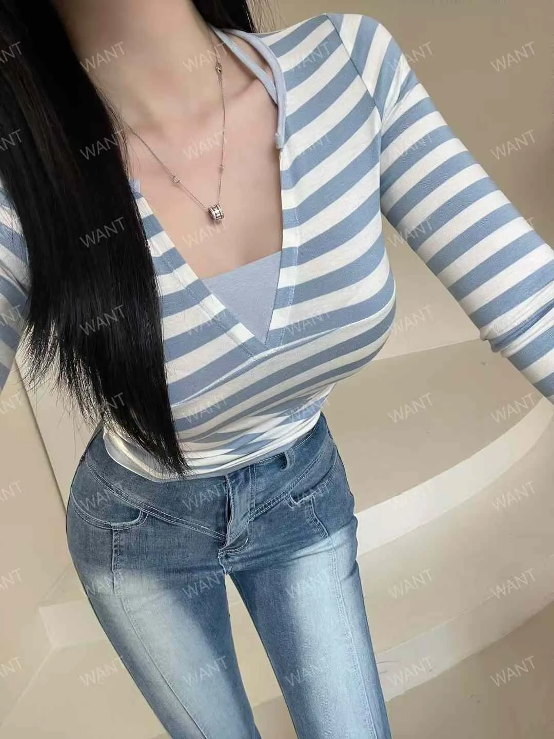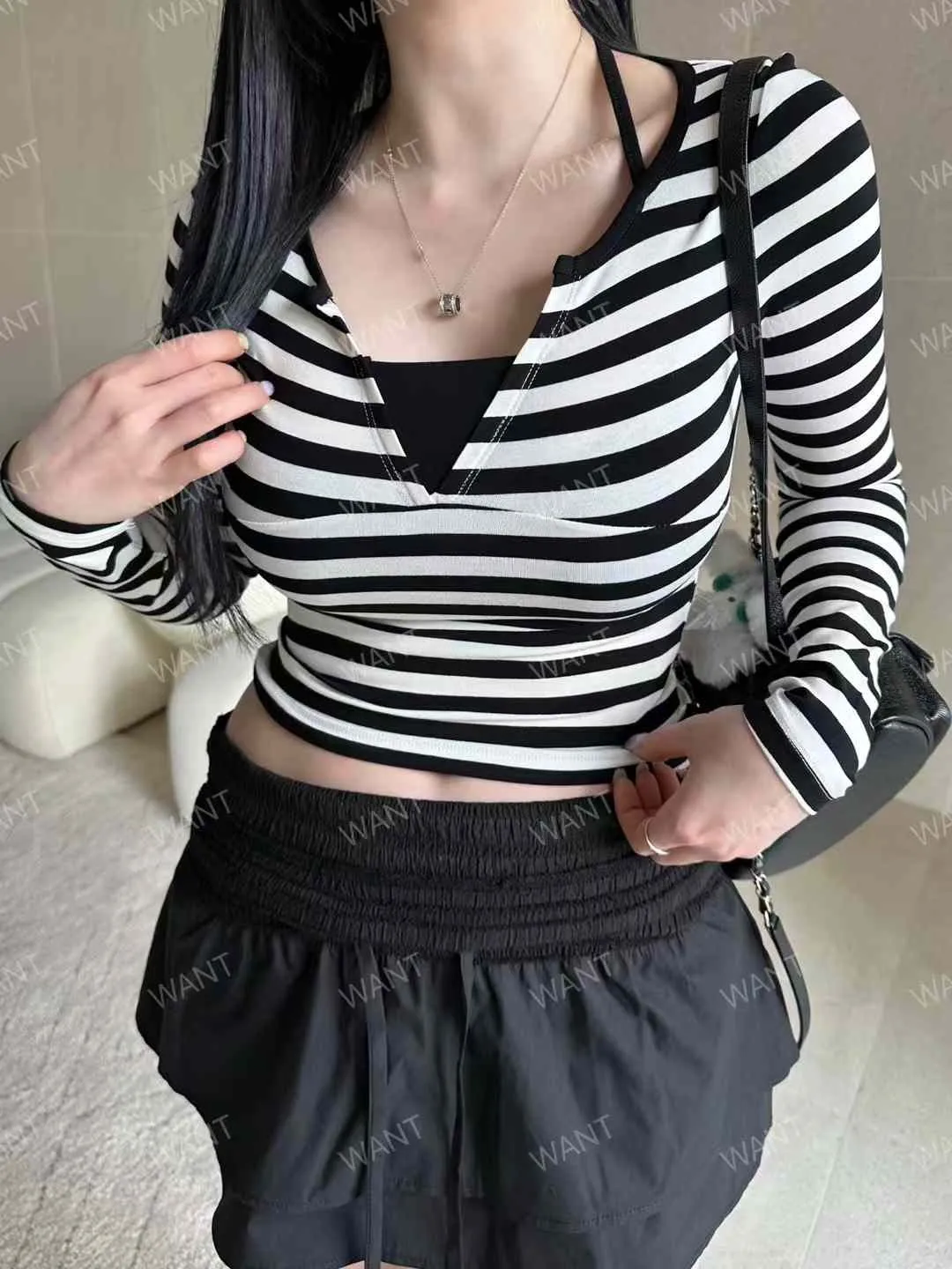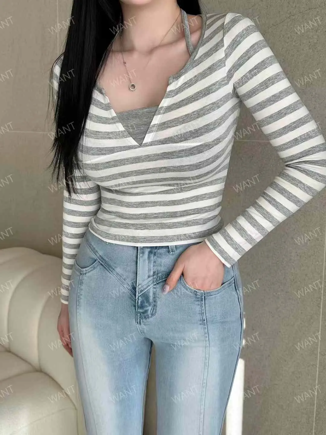 25BA13 條文拚細肩帶V領合身長T 3色