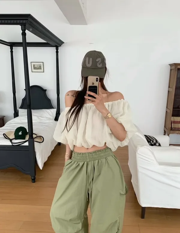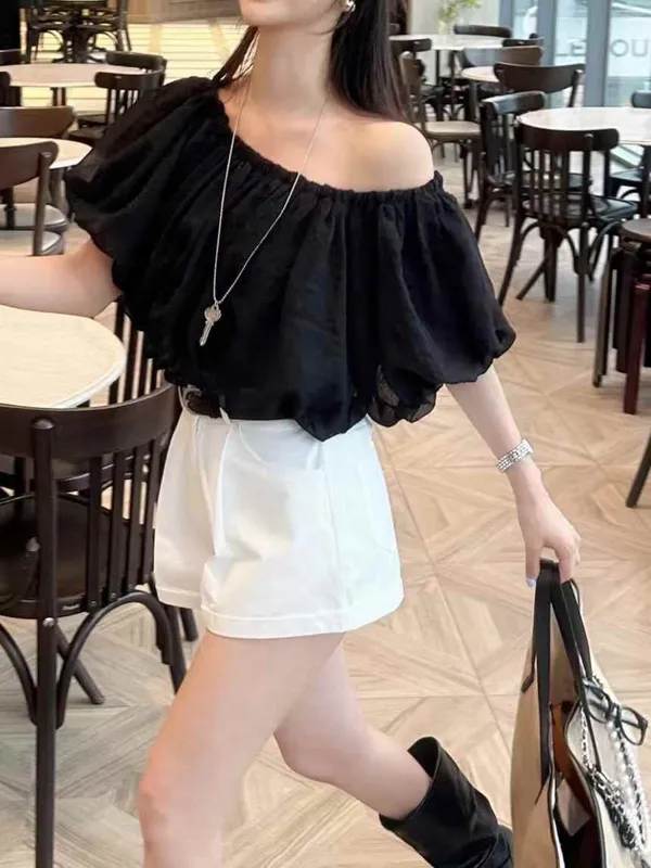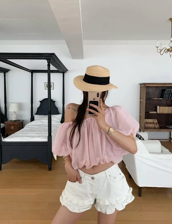 25EK05 透紗雲朵綁帶船領短版上衣 4色