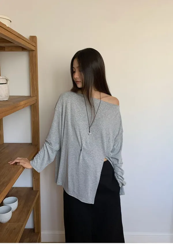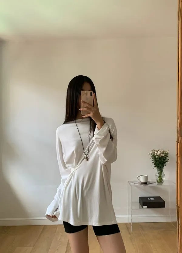 25HE17 兩穿側扣素面寬鬆長T 3色
