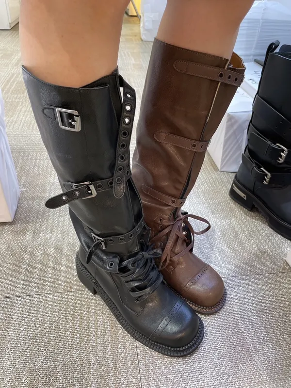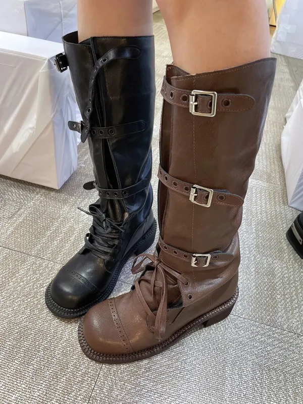 25HG14 闆娘自留)英倫小方頭排扣高筒長靴 2色