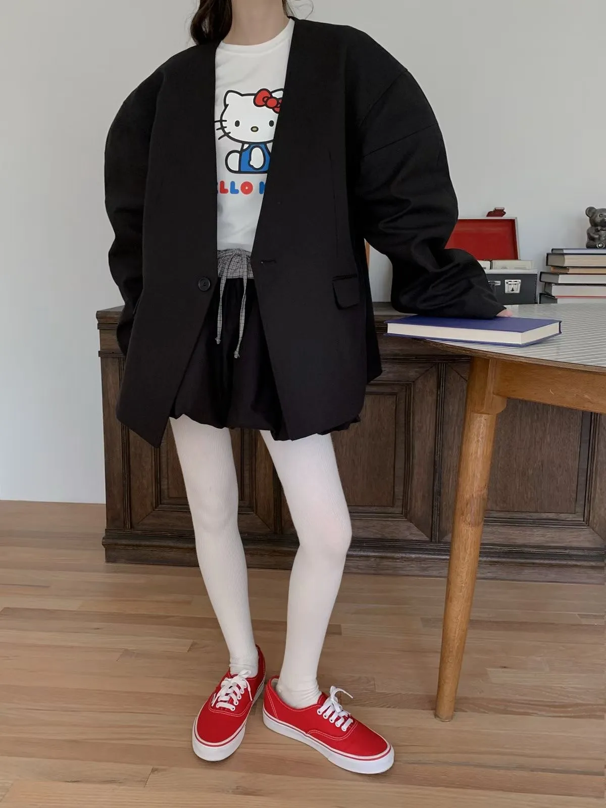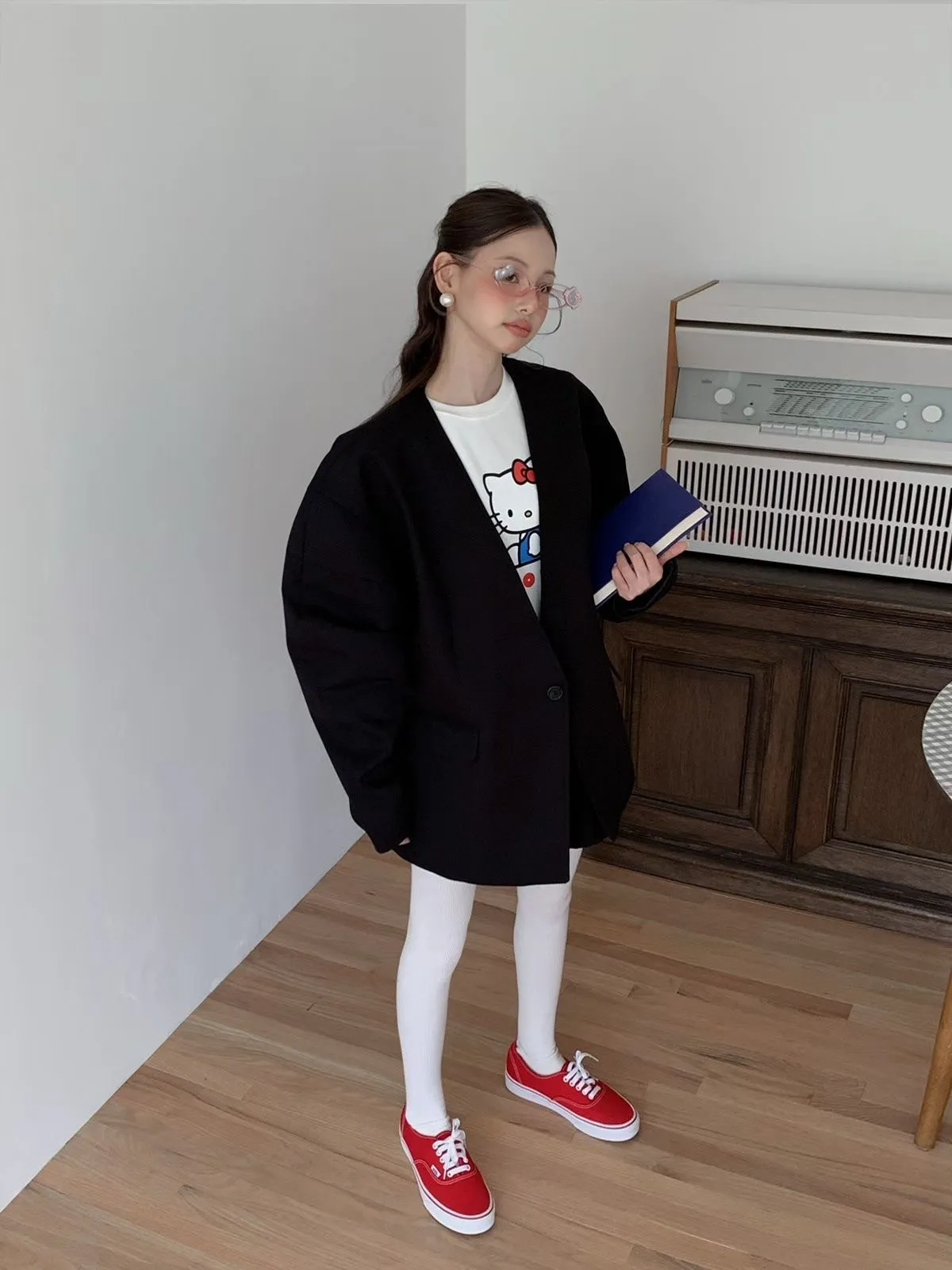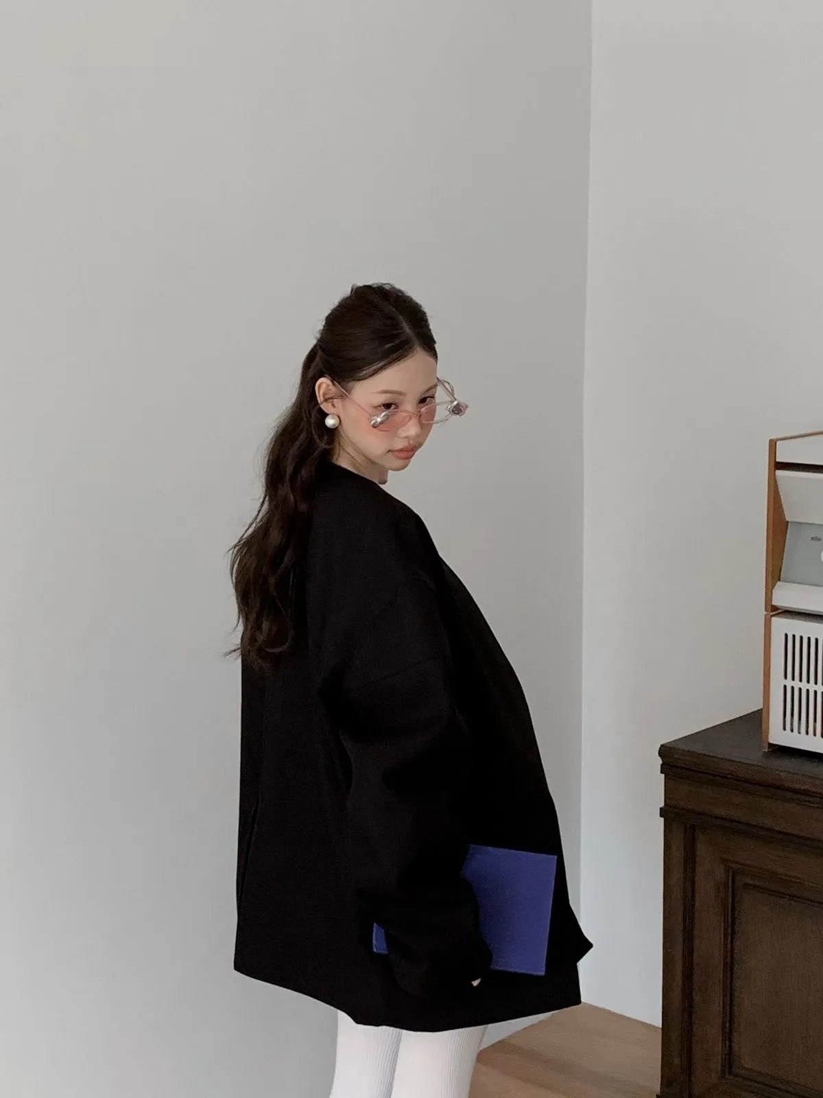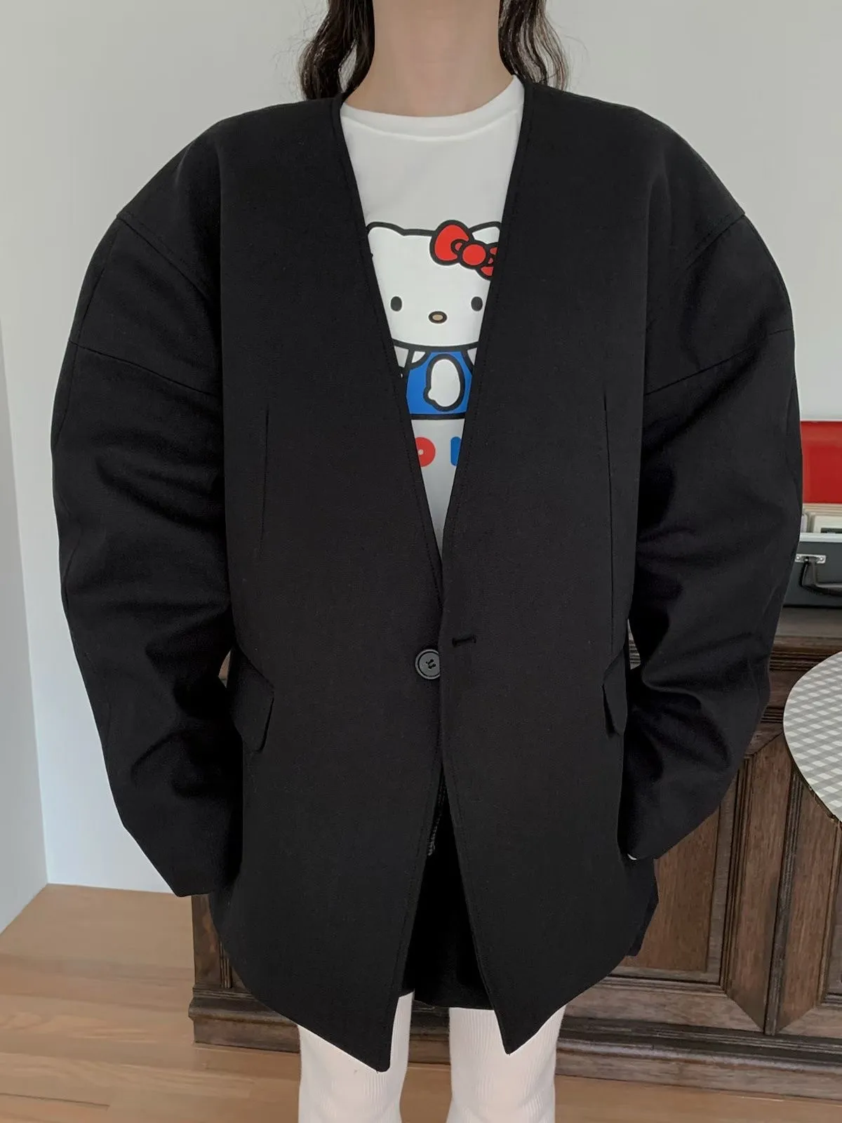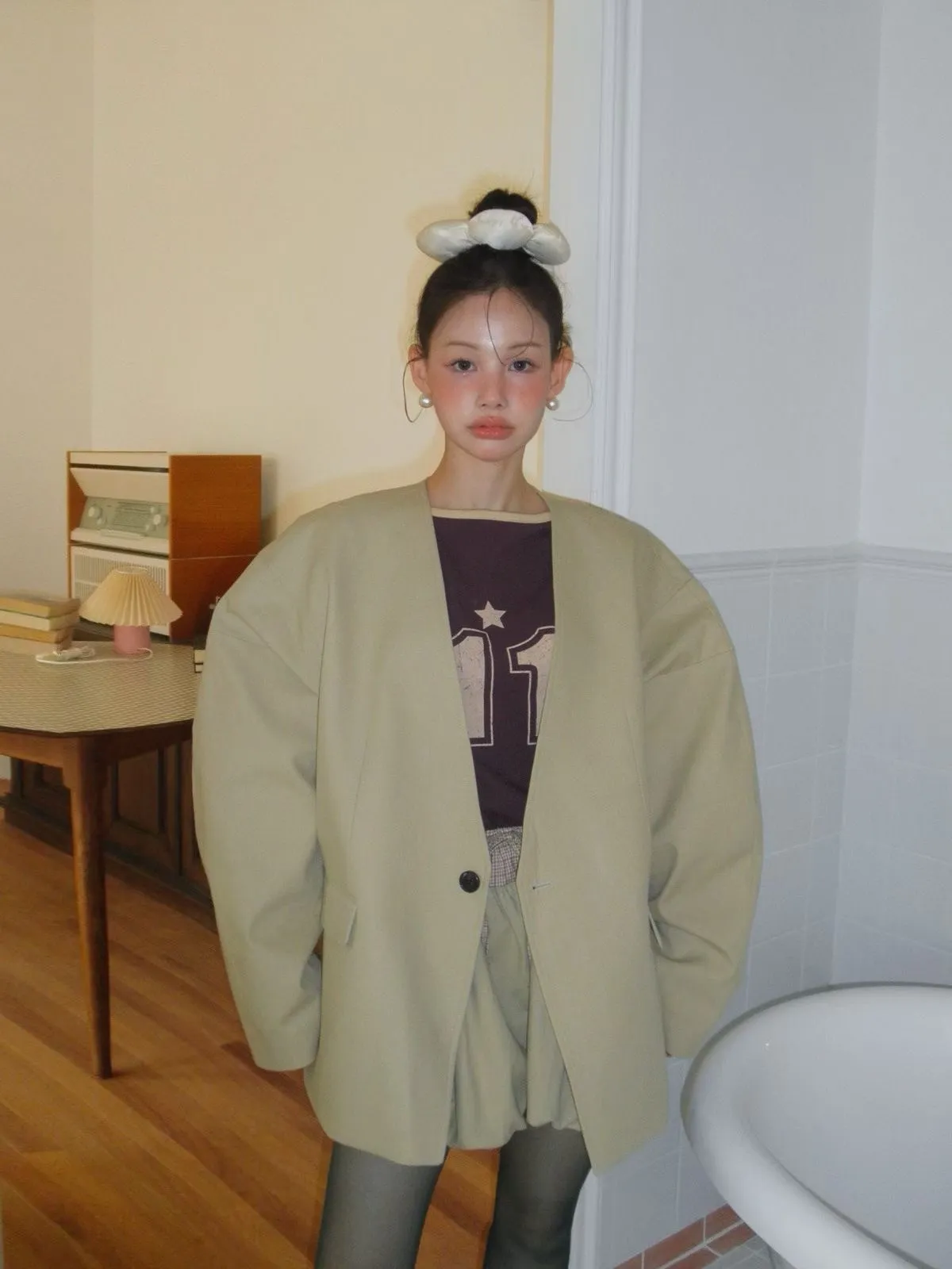 25HH06 一釦挺料卡其棉無領中長版彎袖西裝外套 2色