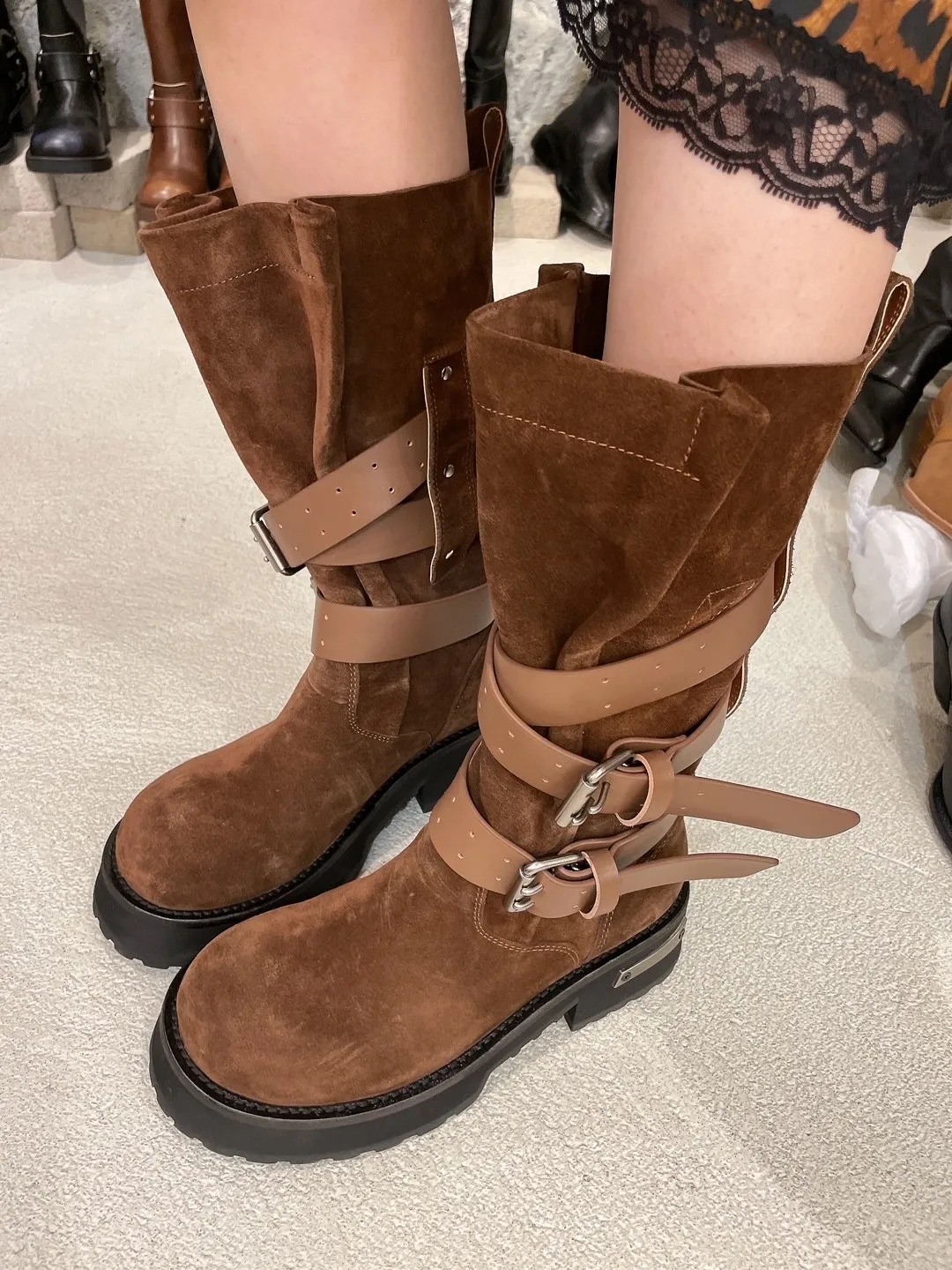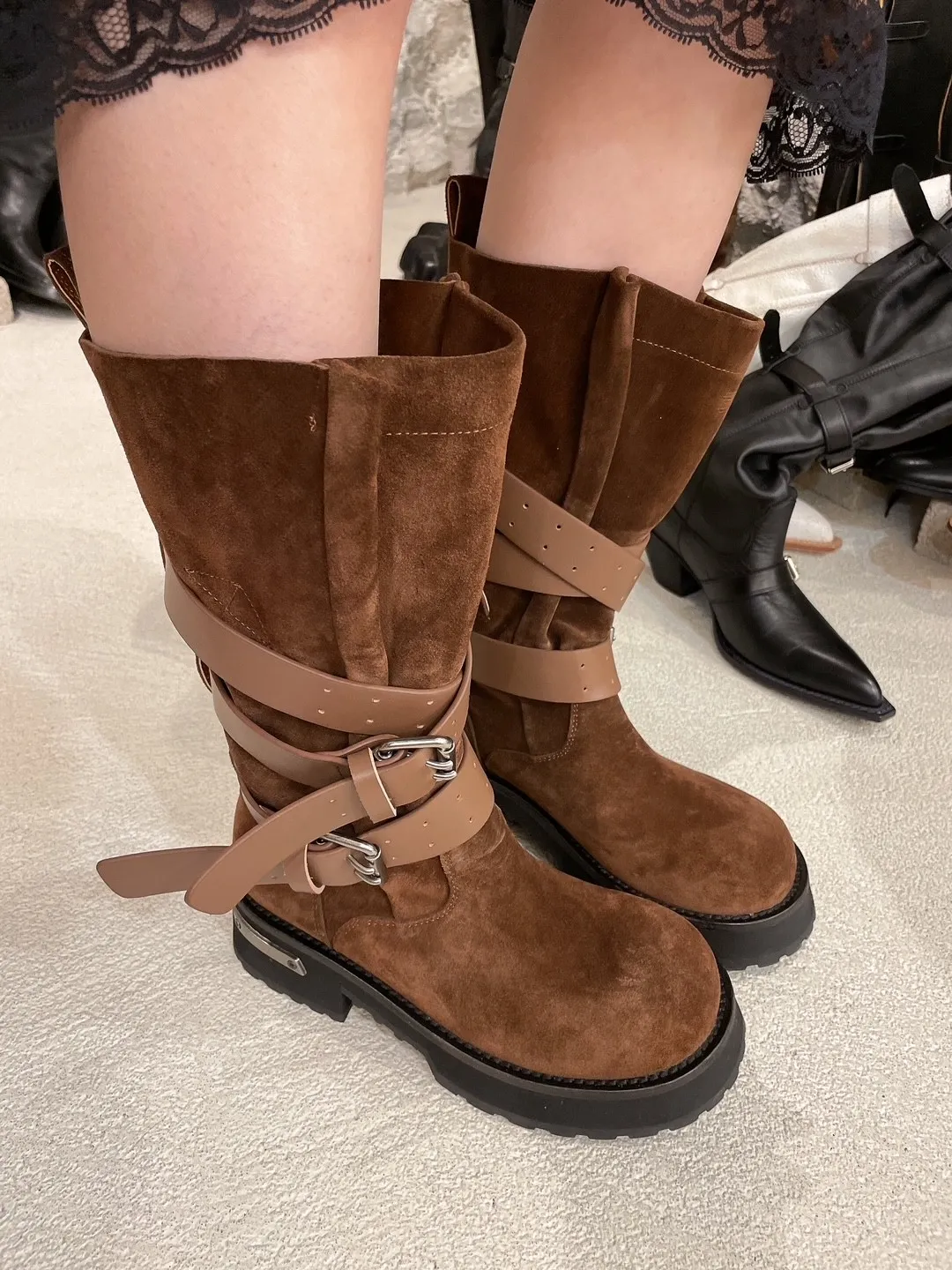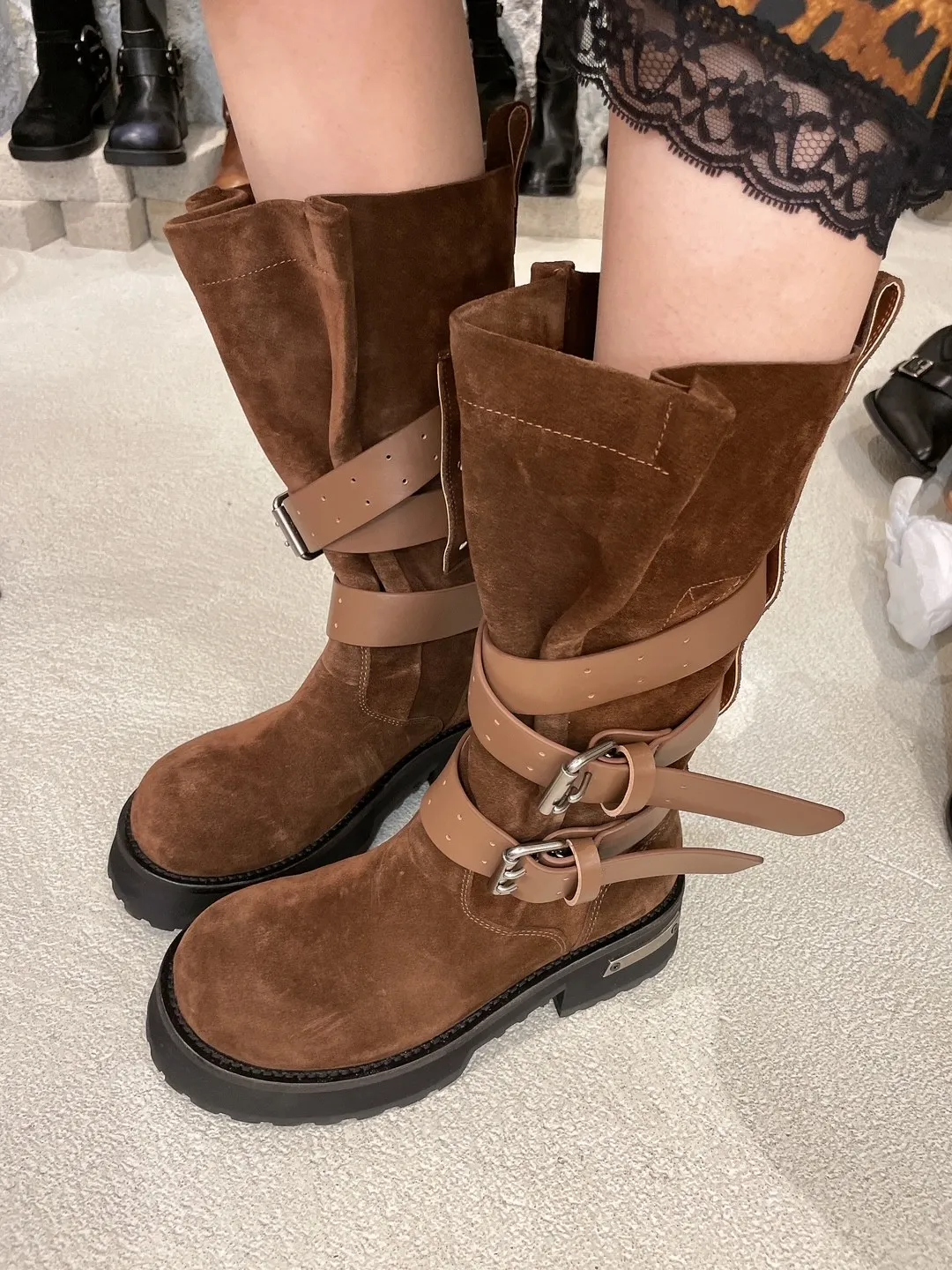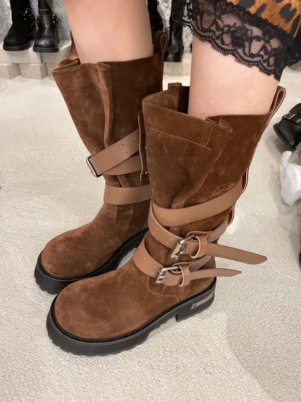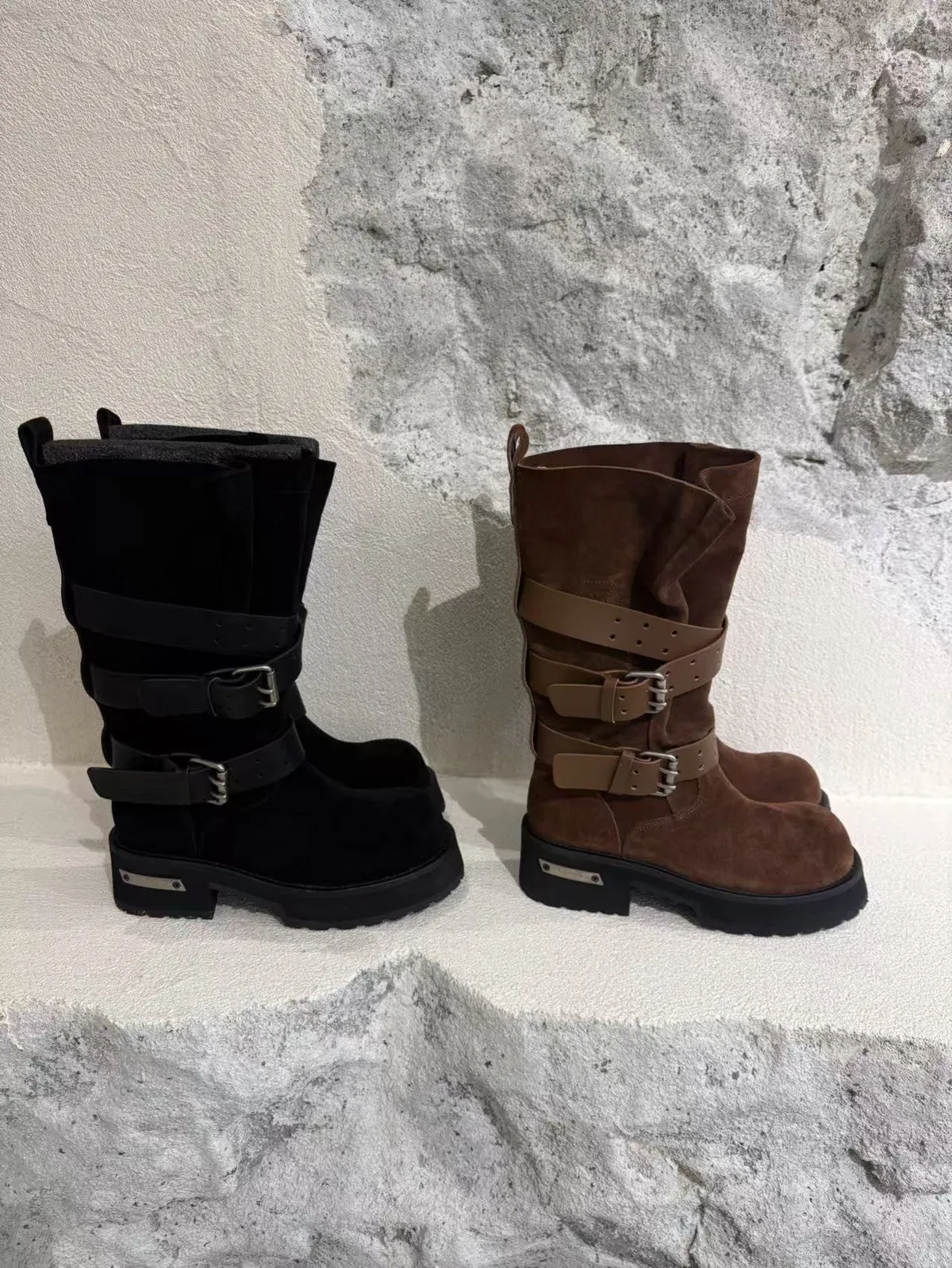 25HJ02 手工真皮)品牌款寬鬆筒牛皮麂皮靴 2色