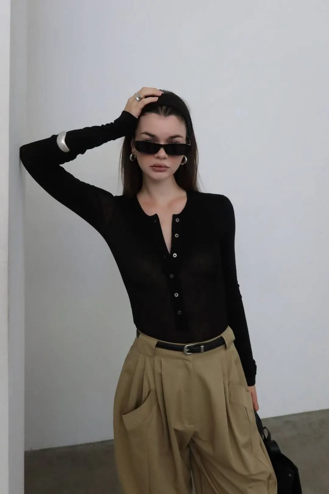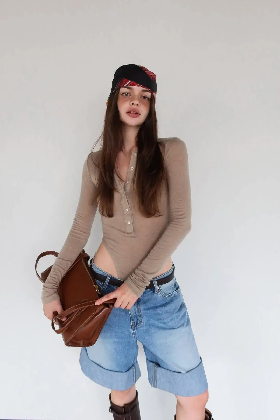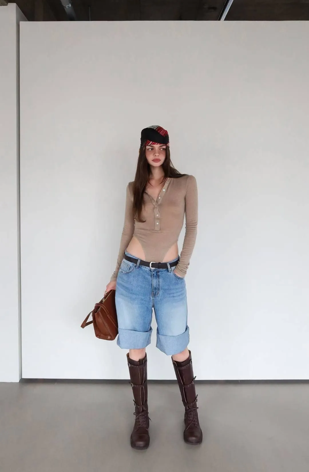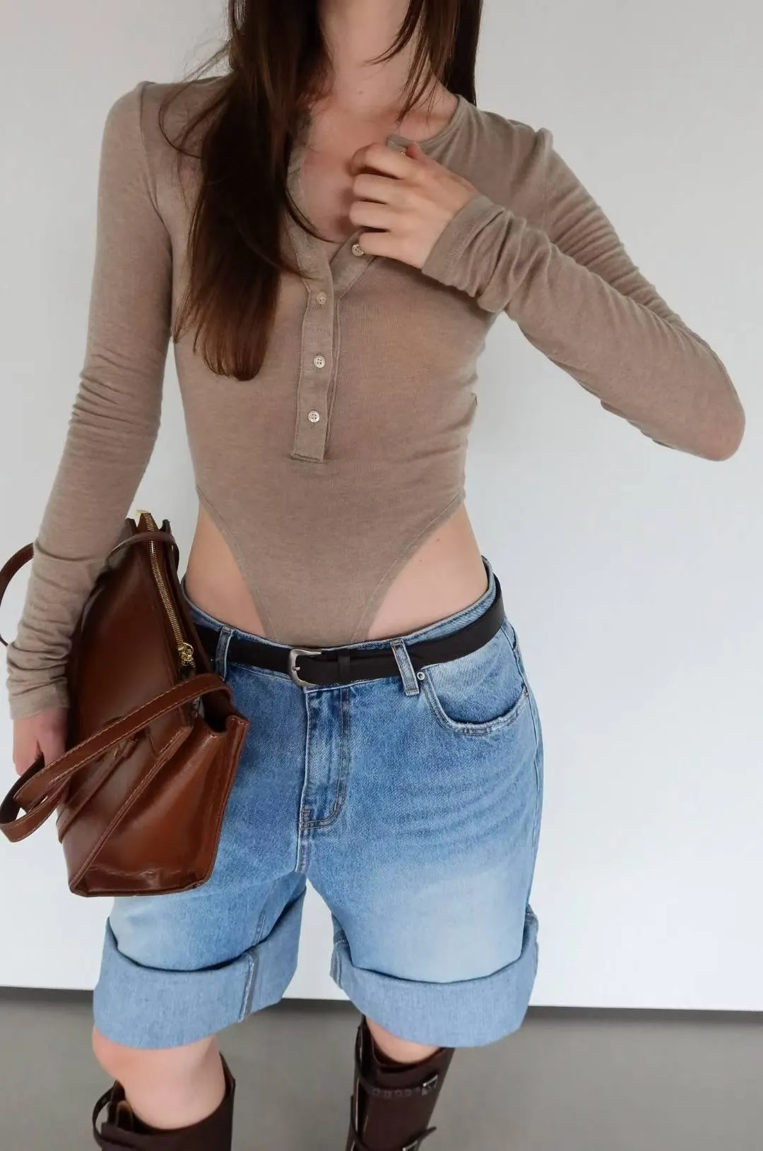25HS15 合身彈力排釦造型挖腰長T 5色