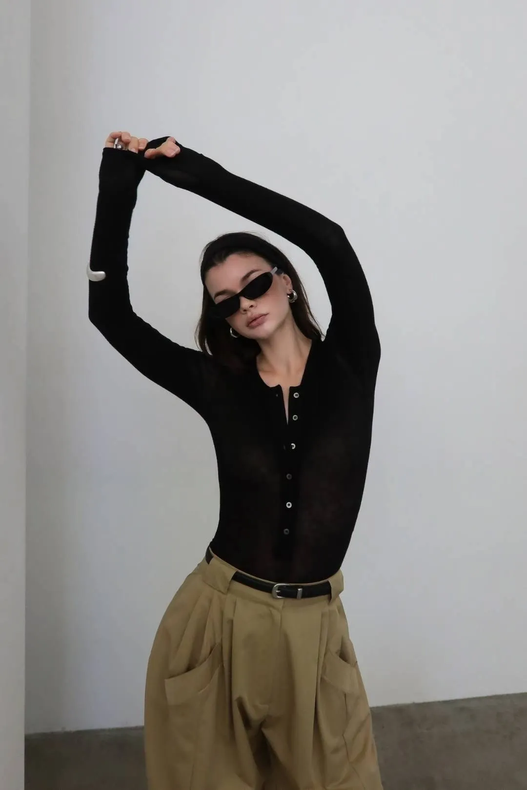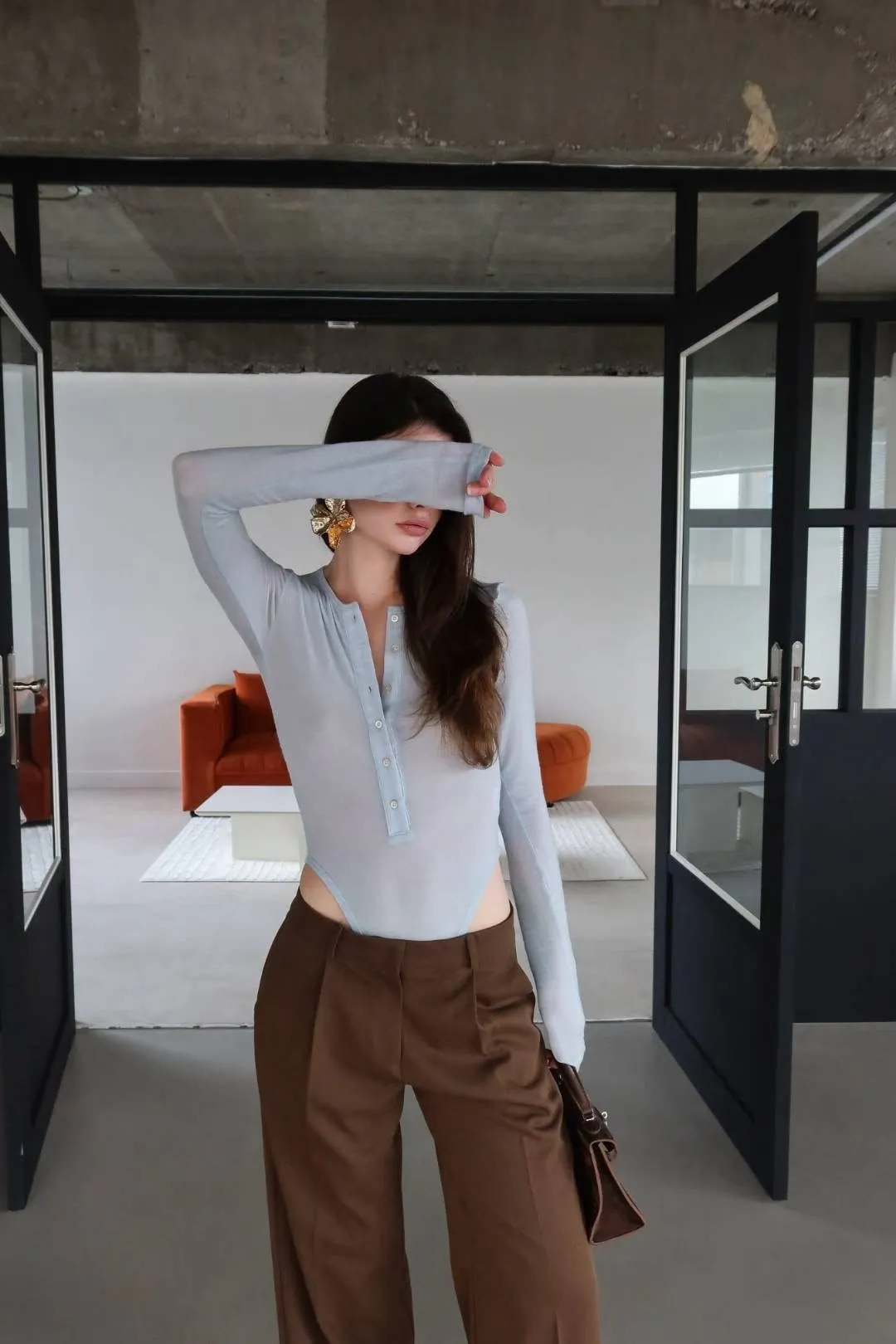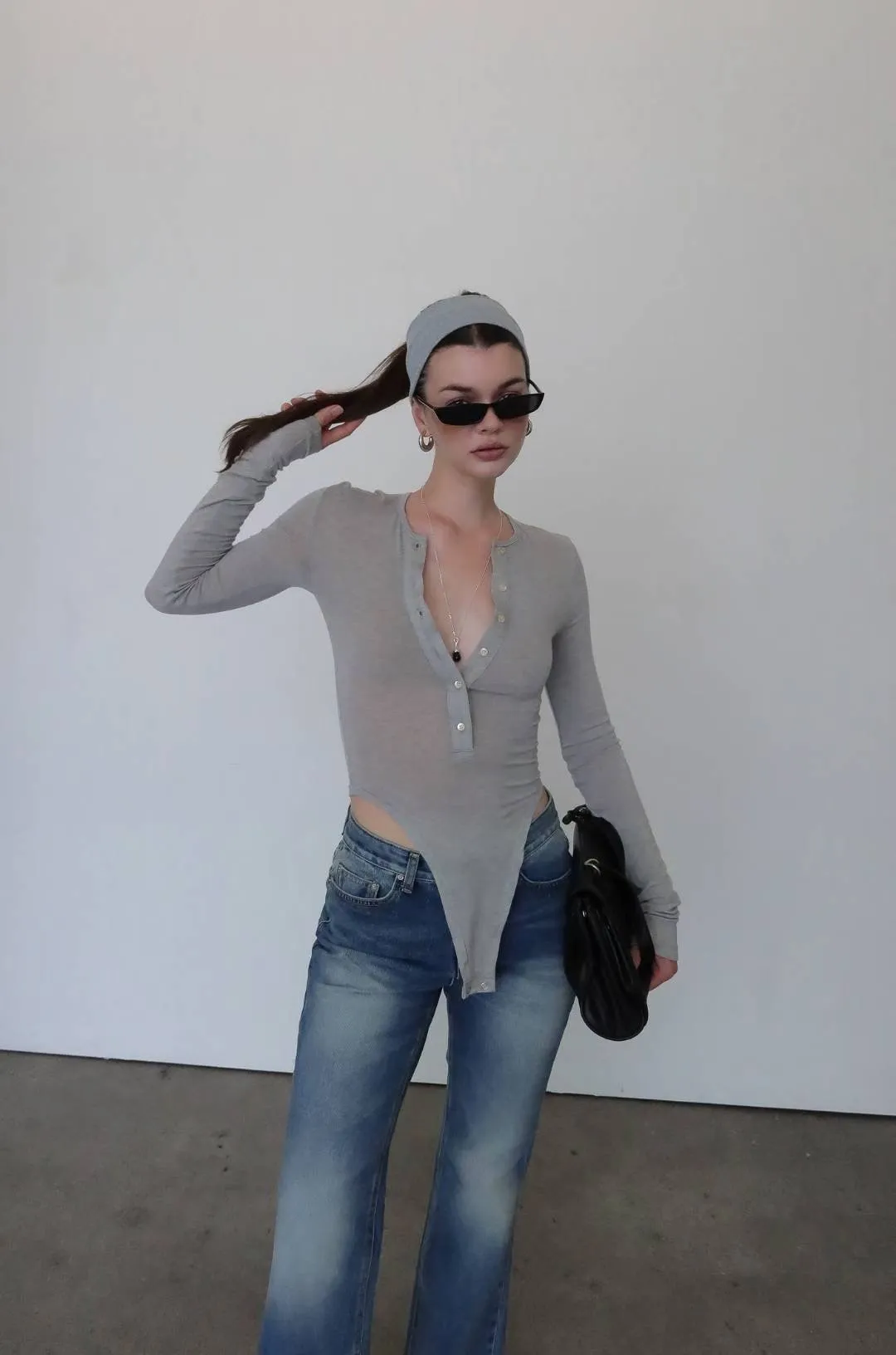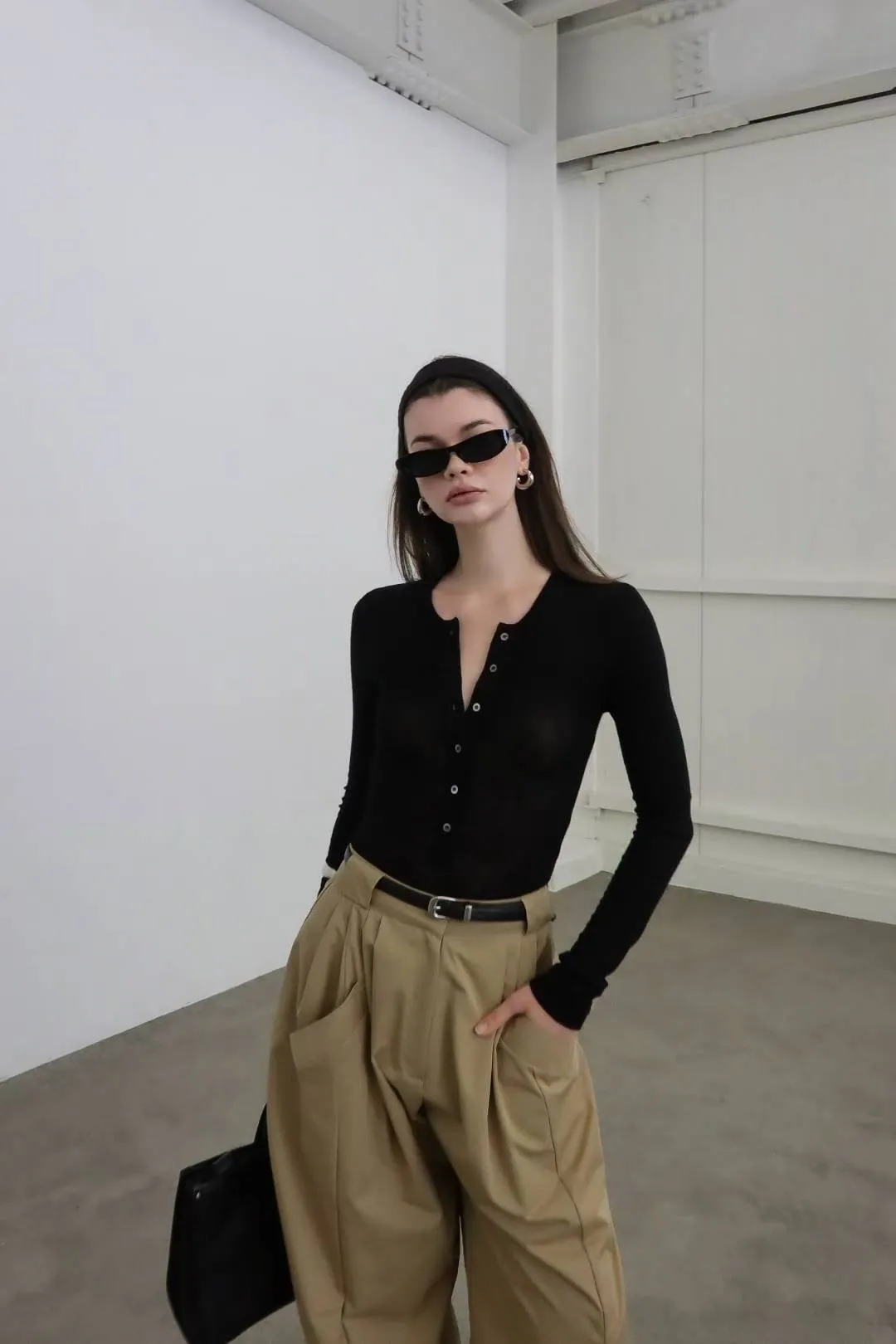 25HS15 合身彈力排釦造型挖腰長T 5色