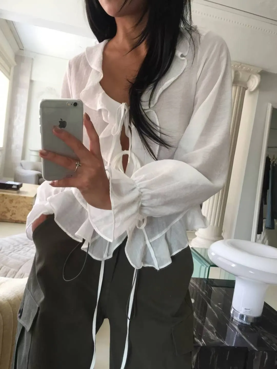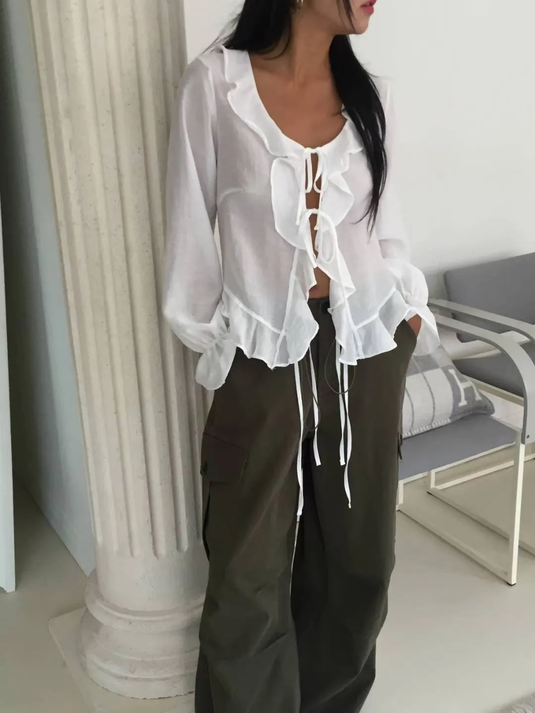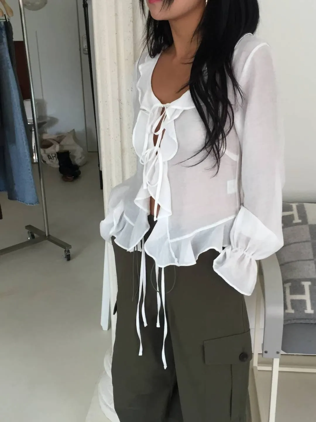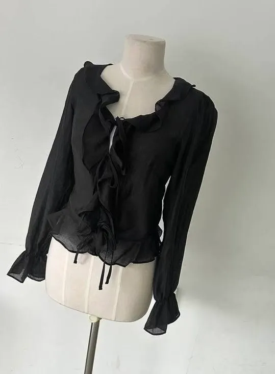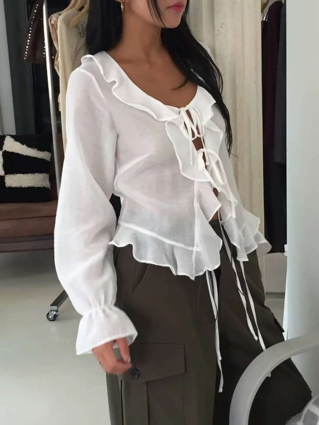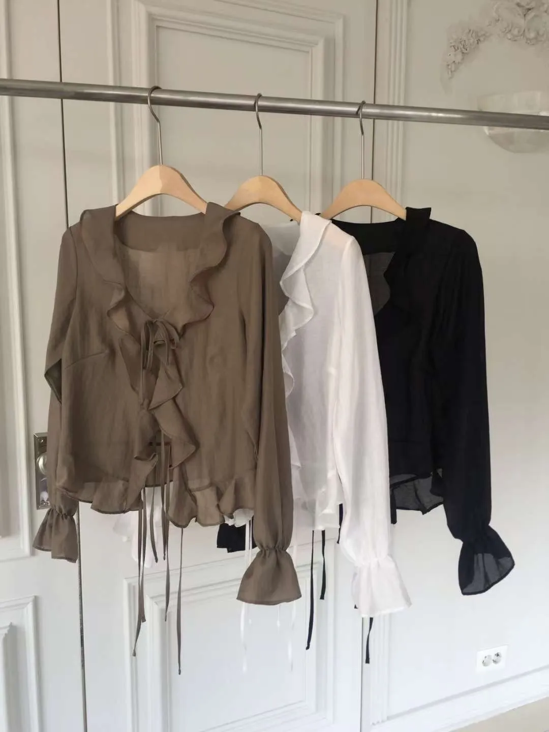 25HS18 荷葉雪紡綁帶法式上衣 3色
