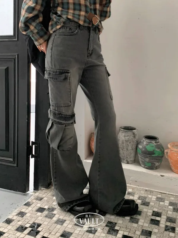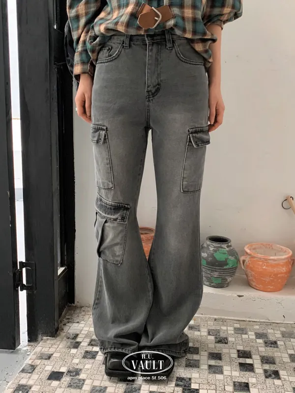 25IA04 中高腰煙灰洗色工裝喇叭褲 SML