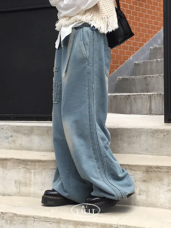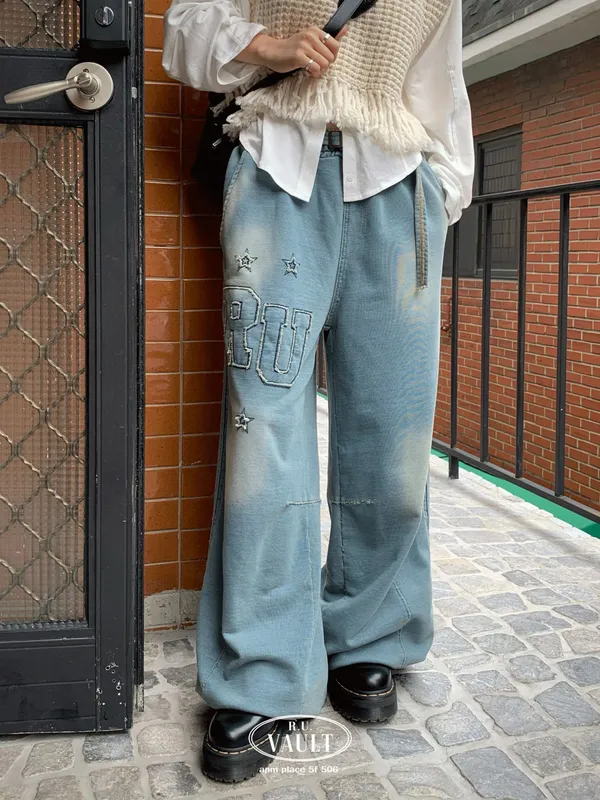 25IA14 星星RU牛仔洗色鬆緊棉兩穿縮腳長褲