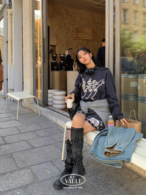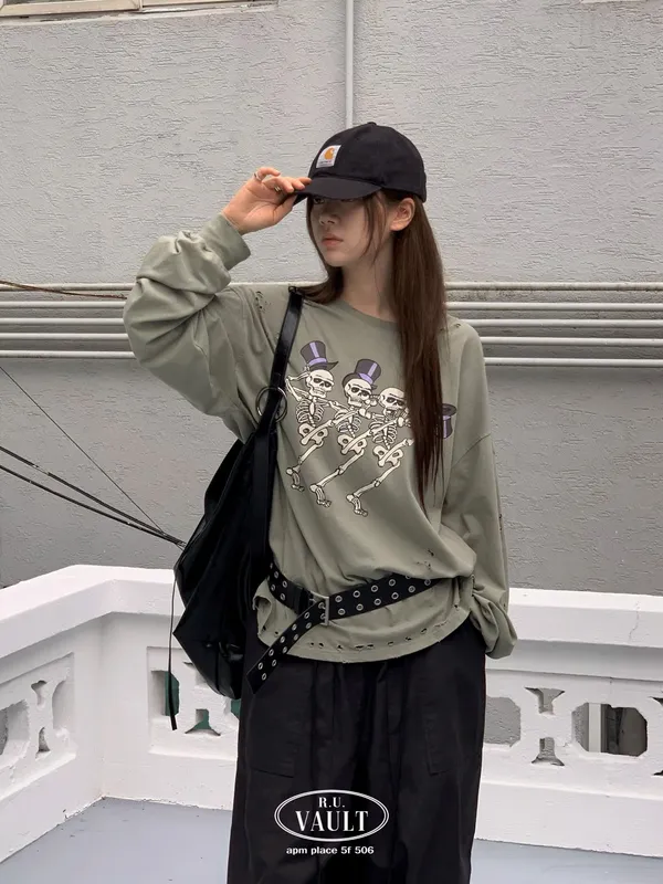 25IA16 割破壞骷髏頭跳舞薄棉長T 3色