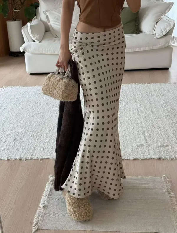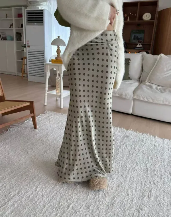 25IB02 點點中低腰緞面抓褶魚尾長裙 2色 SM