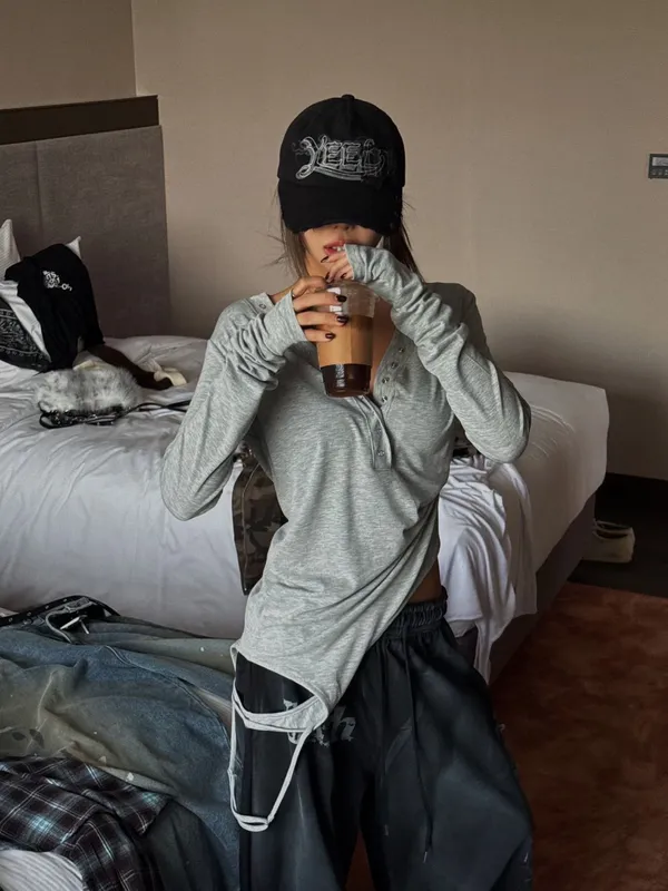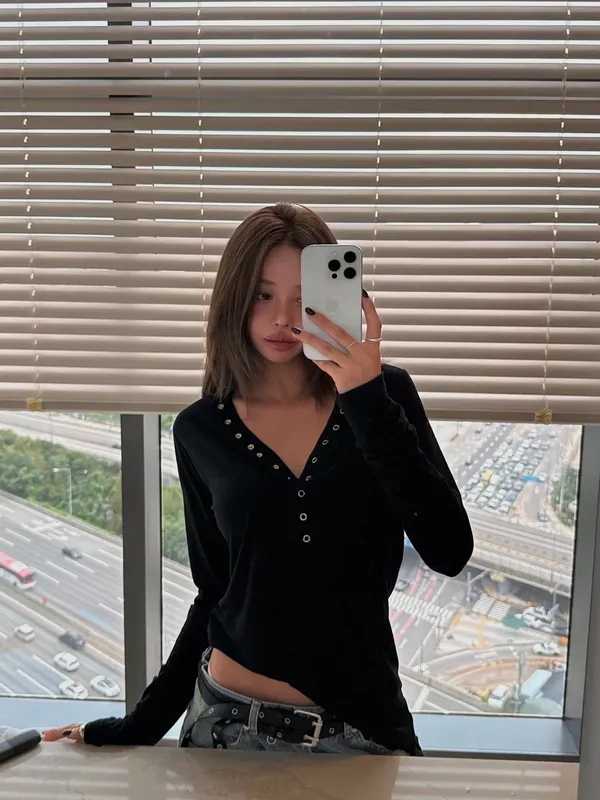 25IC04 V領排扣不對稱特殊造型上衣 3色