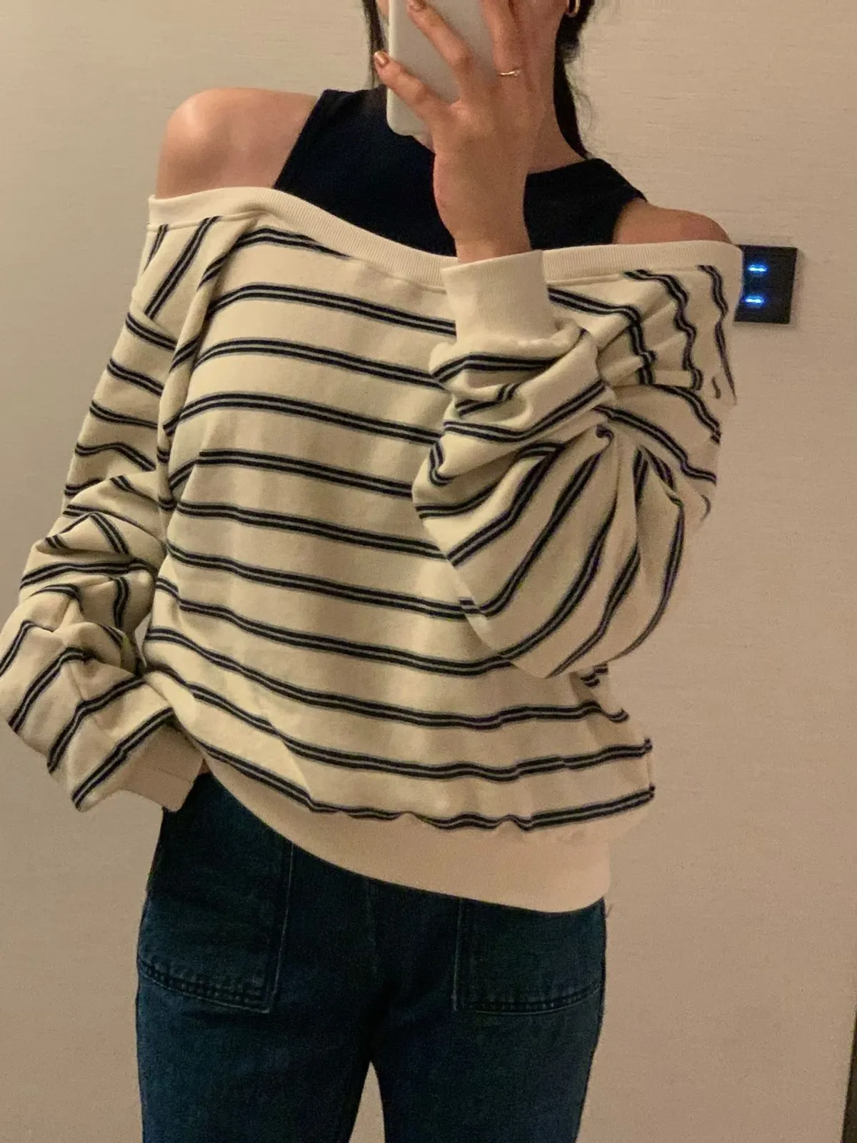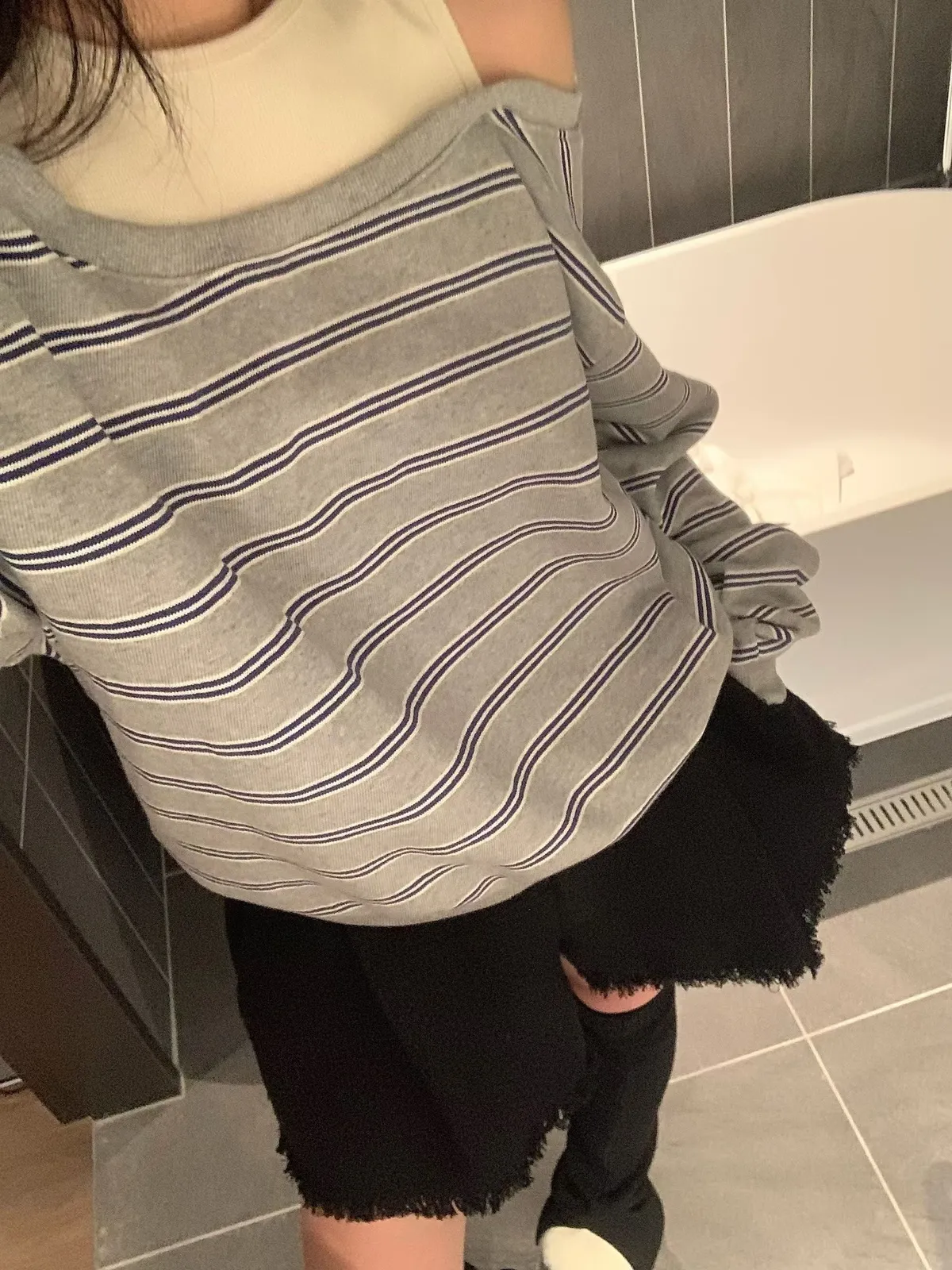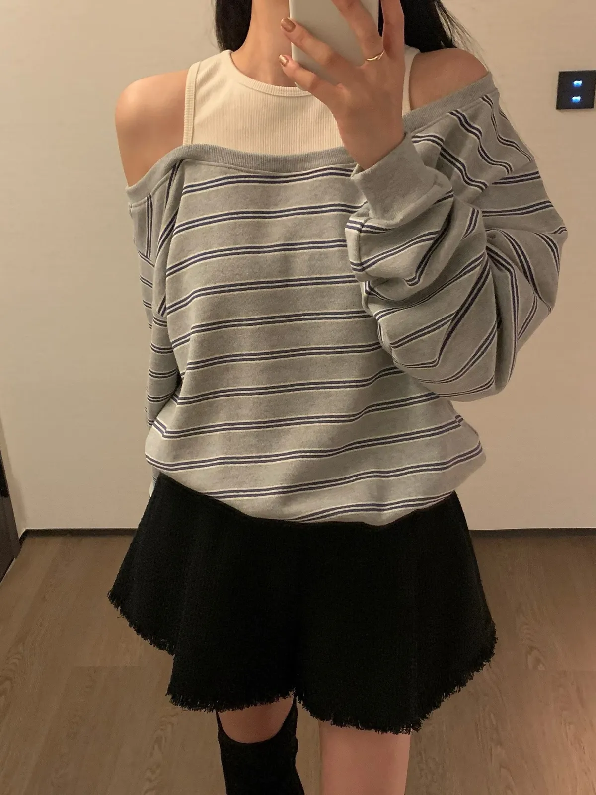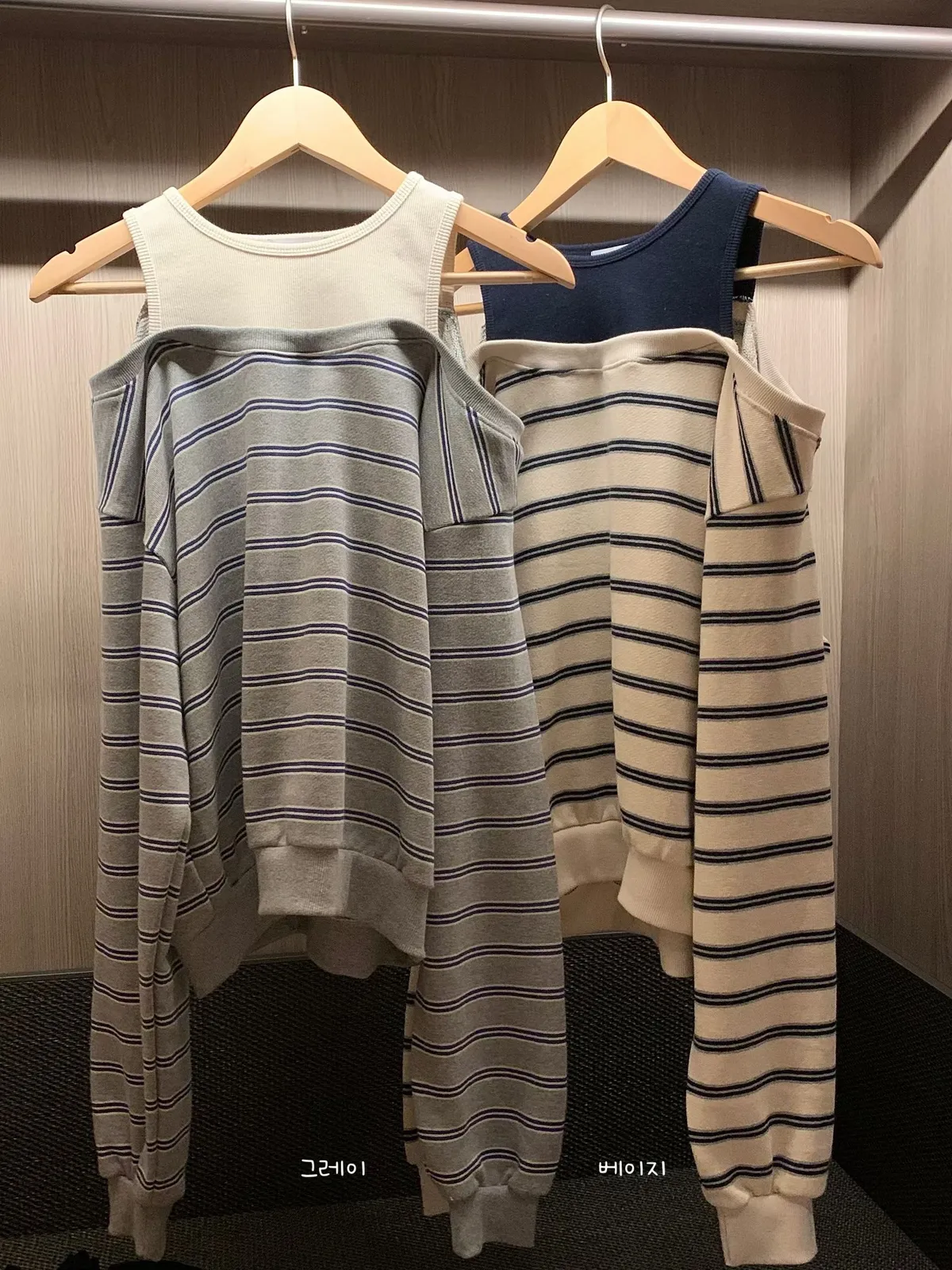 25ID22 假兩件背心條紋薄毛巾大學T 2色