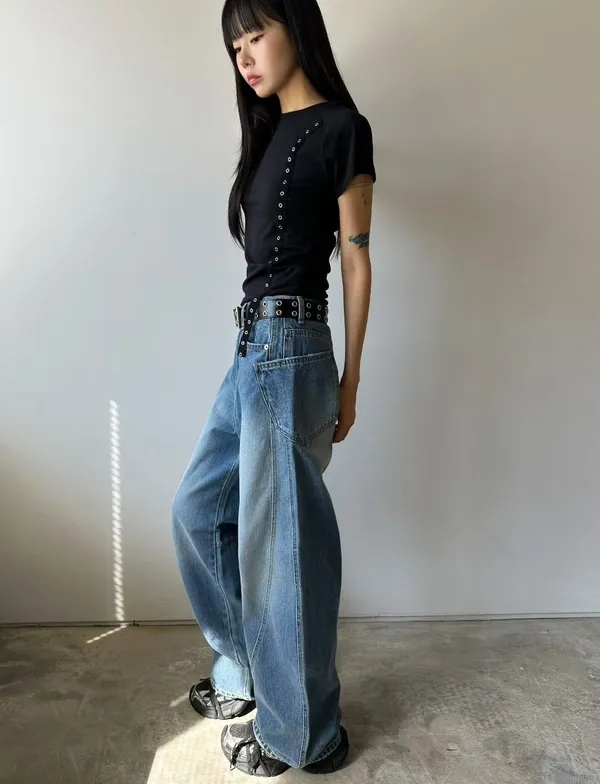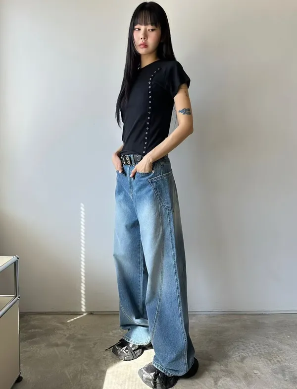 25IE11 拼接側口袋剪裁圓弧牛仔長褲 SML