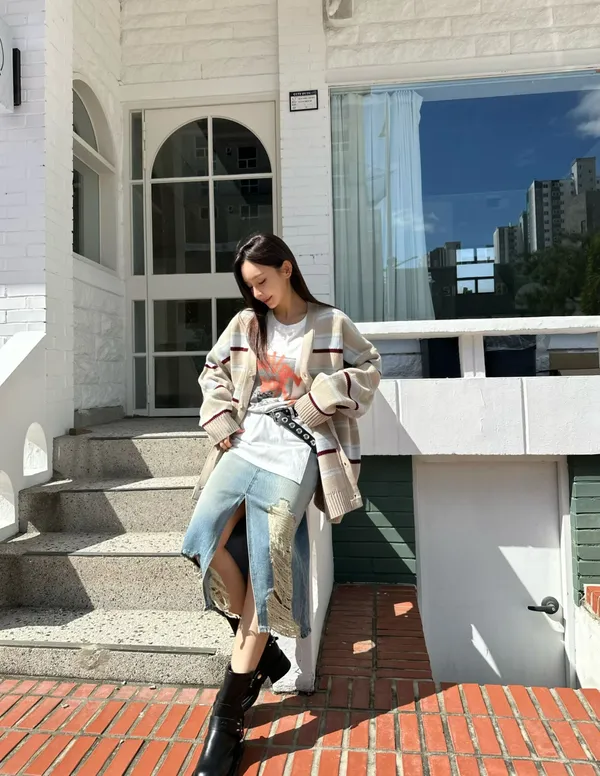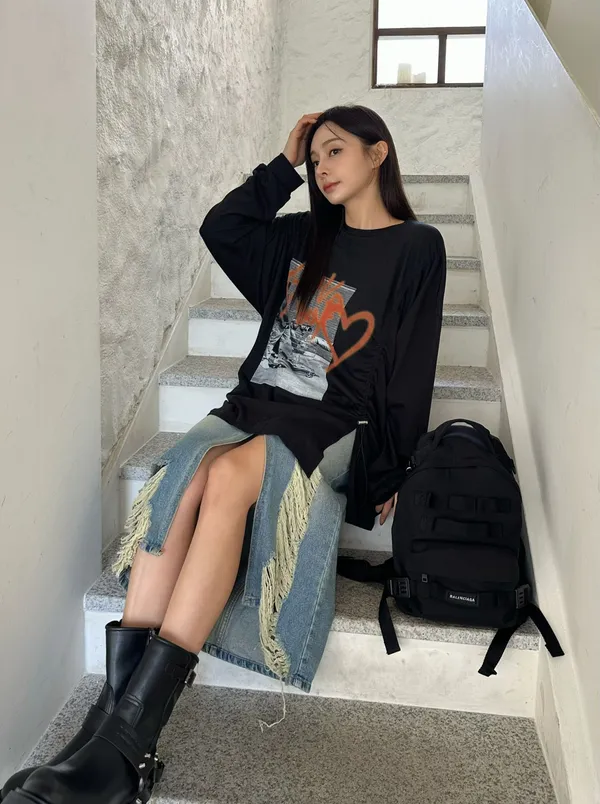 25IE19 割破壞開叉牛仔長裙 SML