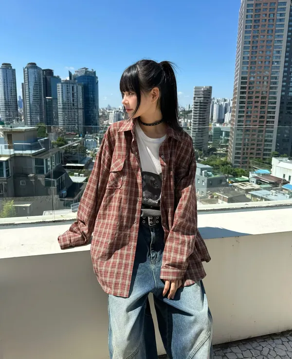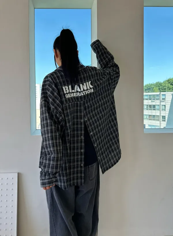 25IE23 壓扣後開叉噴漆英字格紋襯衫 2色
