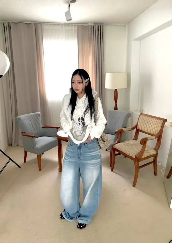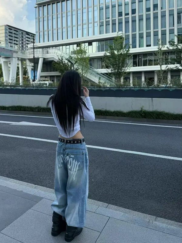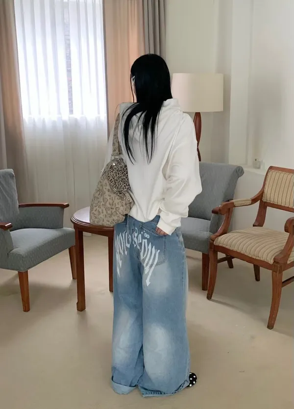 25IG08 必買)中低腰後臀噴英字洗色牛仔長褲 SM