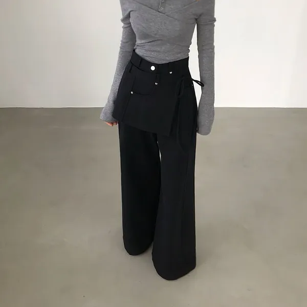 25II07 斜紋假兩件綁帶遮裙款直筒長褲 2色 SM