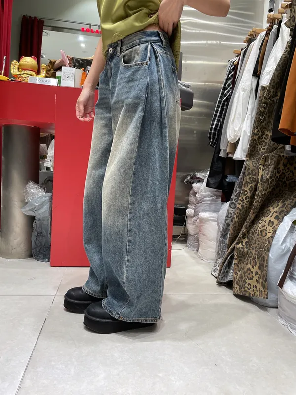 25IJ03 側邊打褶洗色低腰牛仔長褲 SML
