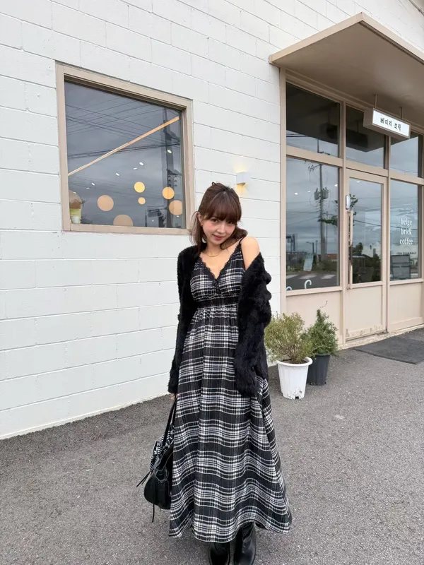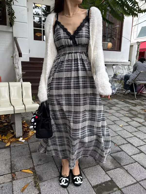 25IJ07 V領格紋細肩帶連身長洋裝 2色
