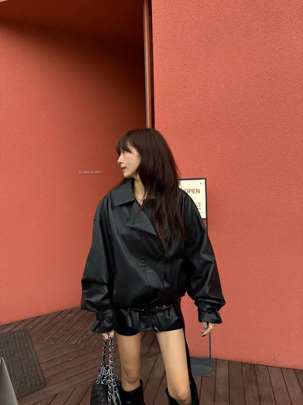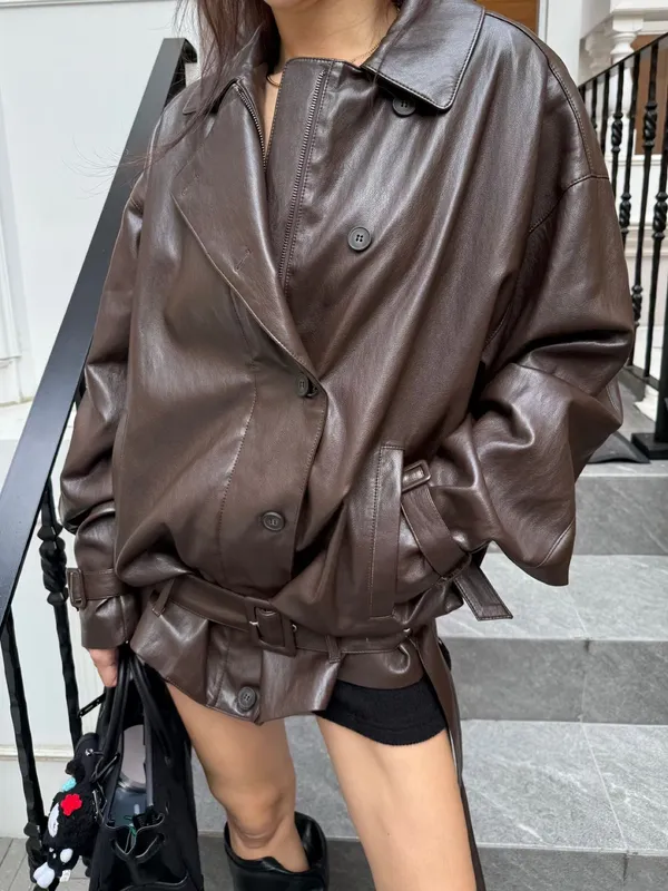 25IJ14 小羊皮感中長版下擺腰扣皮革風衣外套2色
