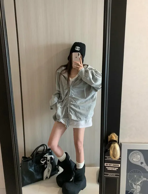 25IK01 薄毛巾抓皺中長版連帽外套 3色