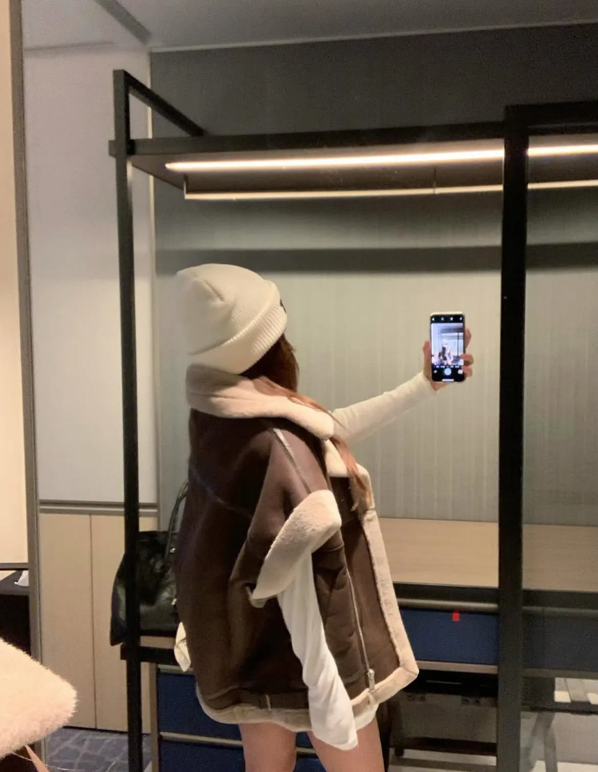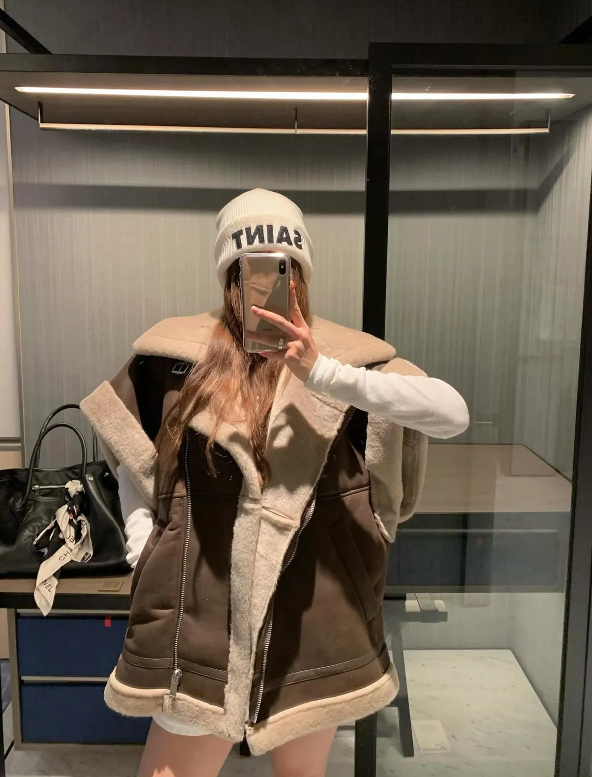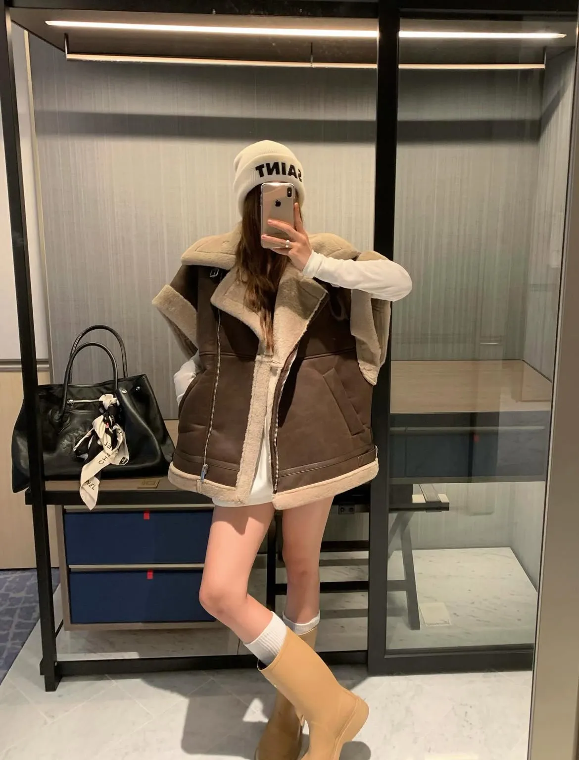 25IK26 中長版麂皮內毯絨毛毛騎士背心