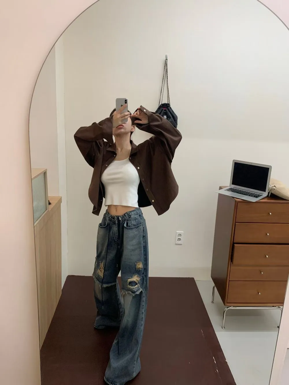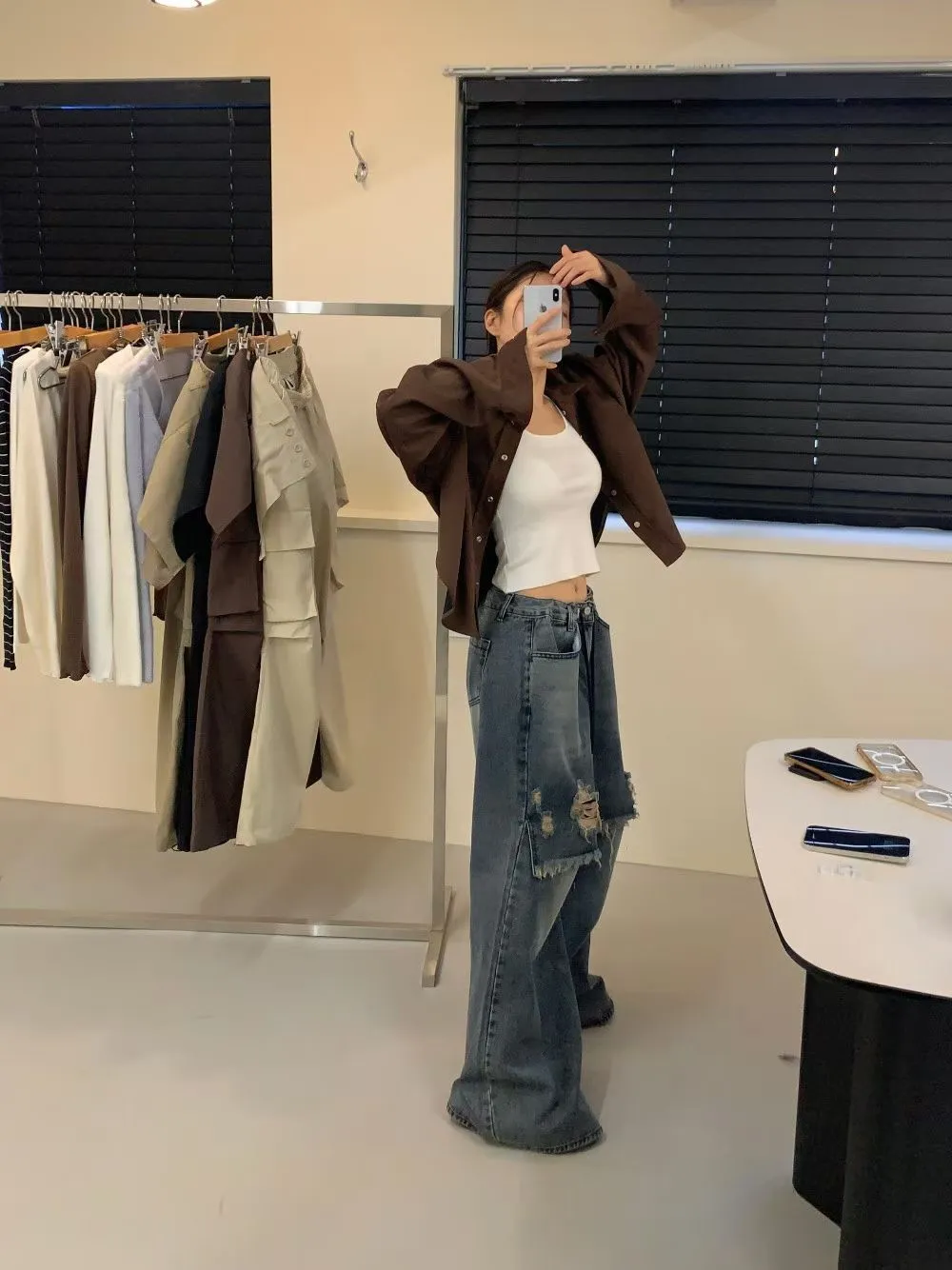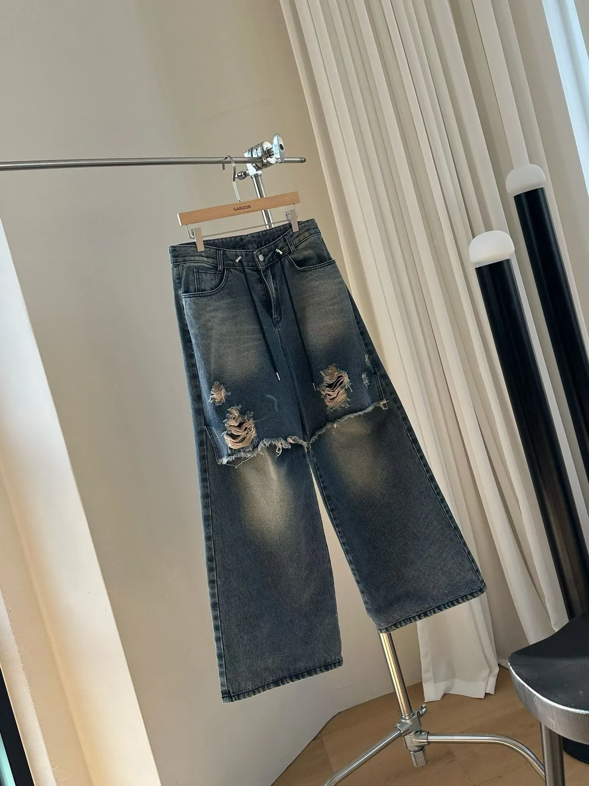 25JA07 假兩件感割破膝快調腰牛仔長褲