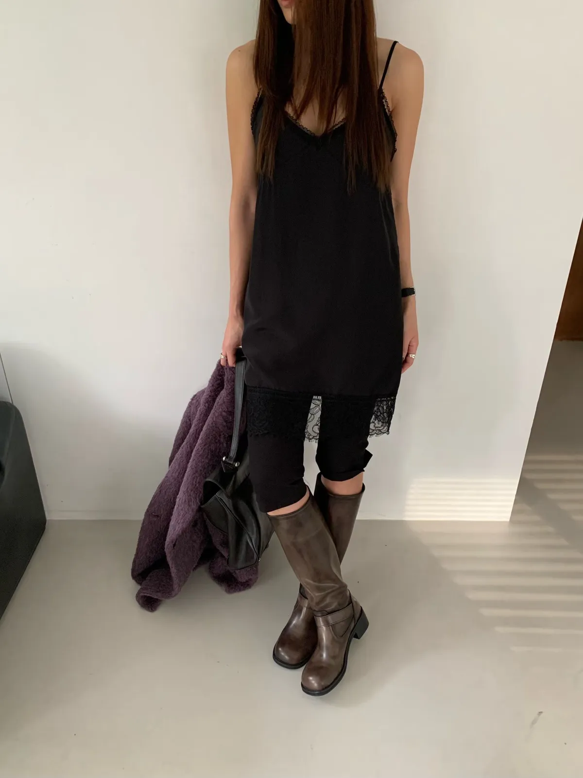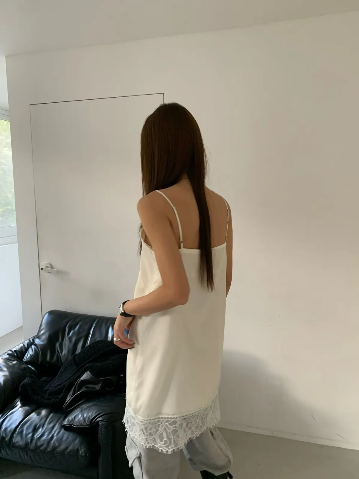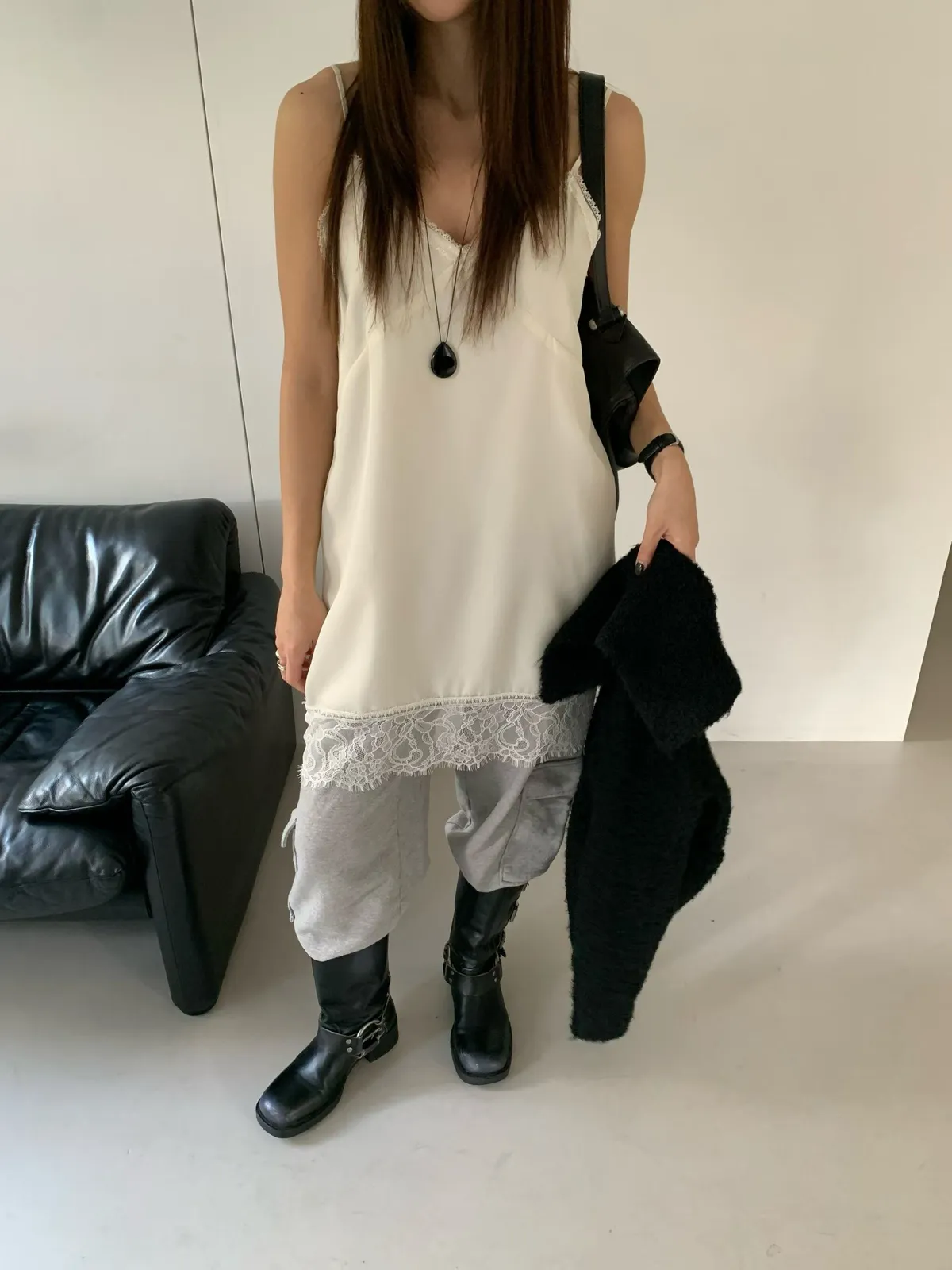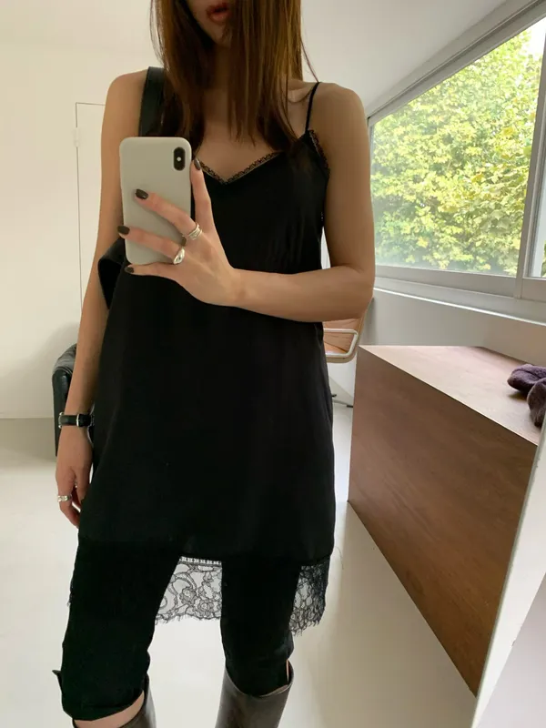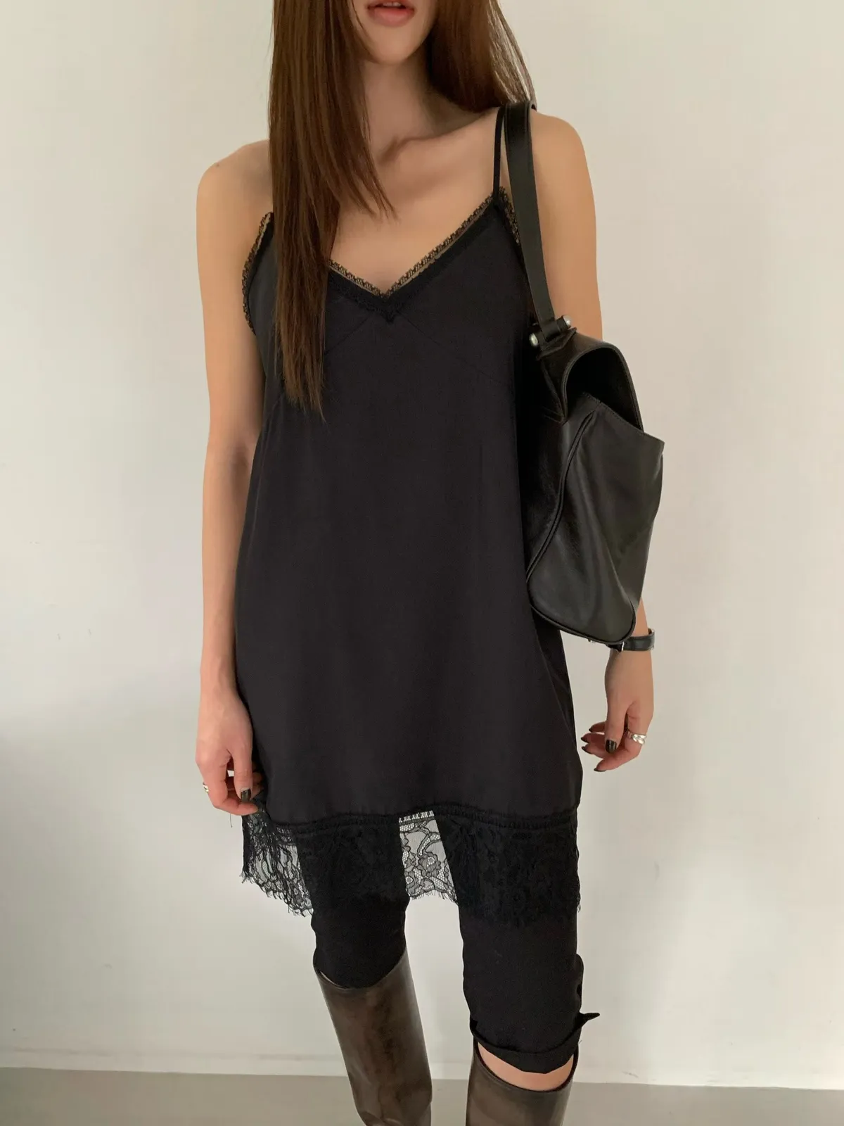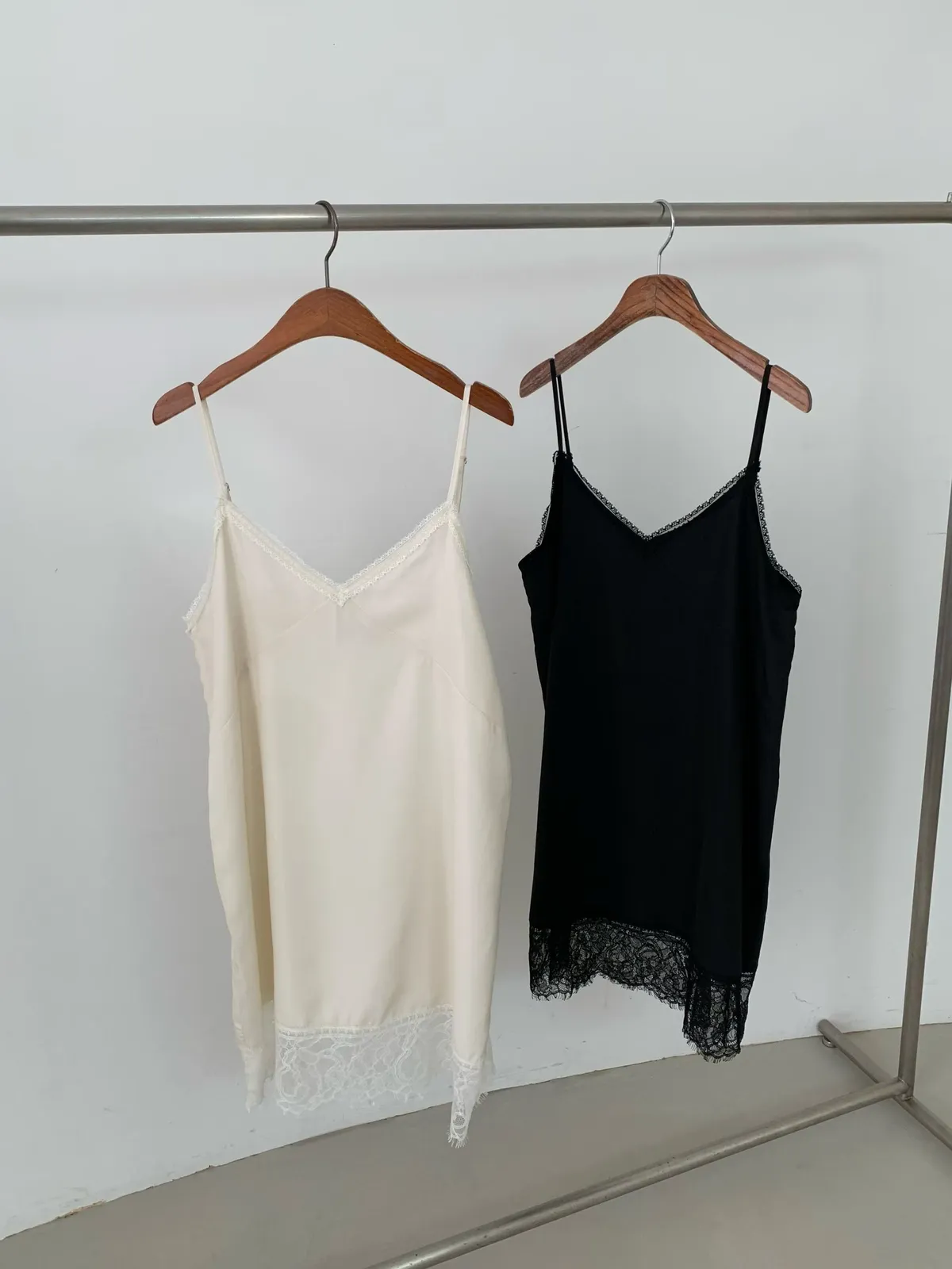 25JB20 緞面拼蕾絲背心短洋裝 2色