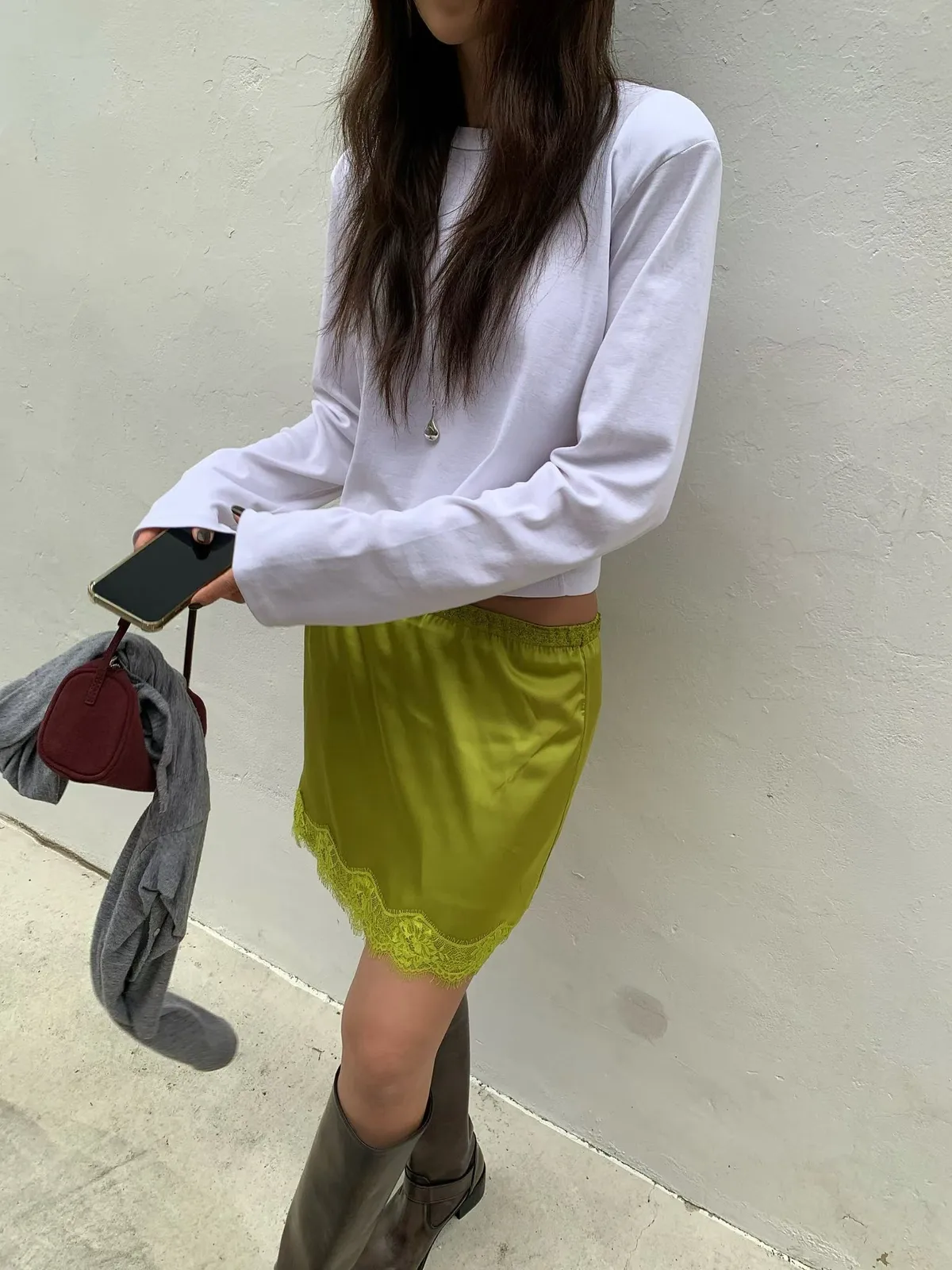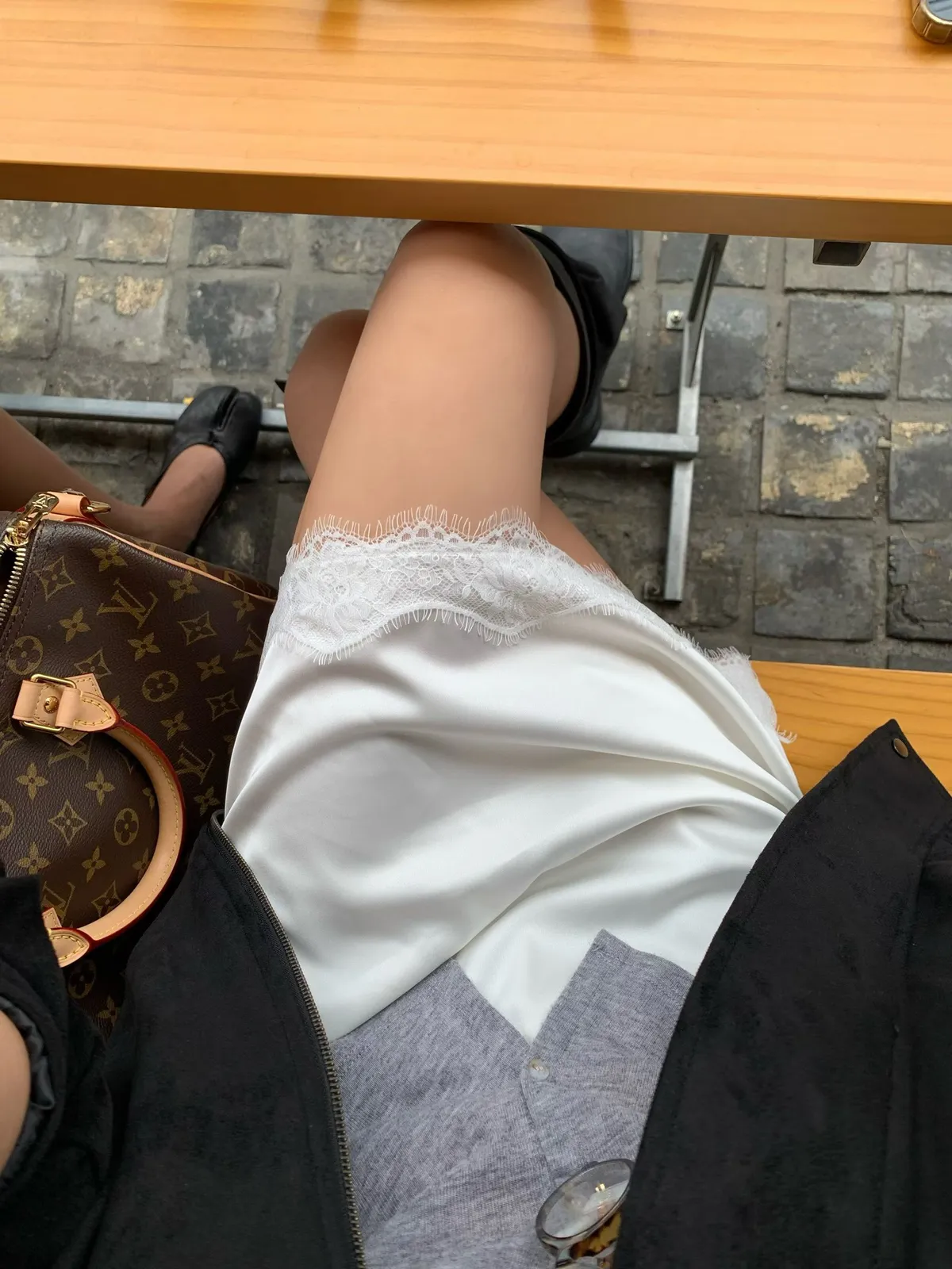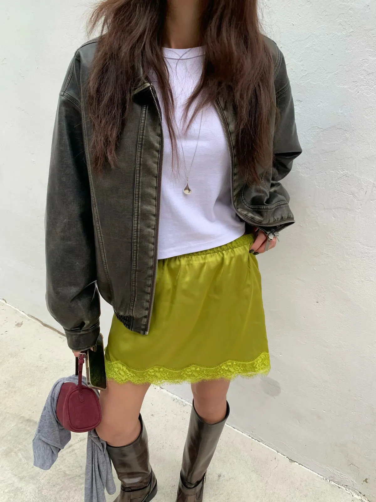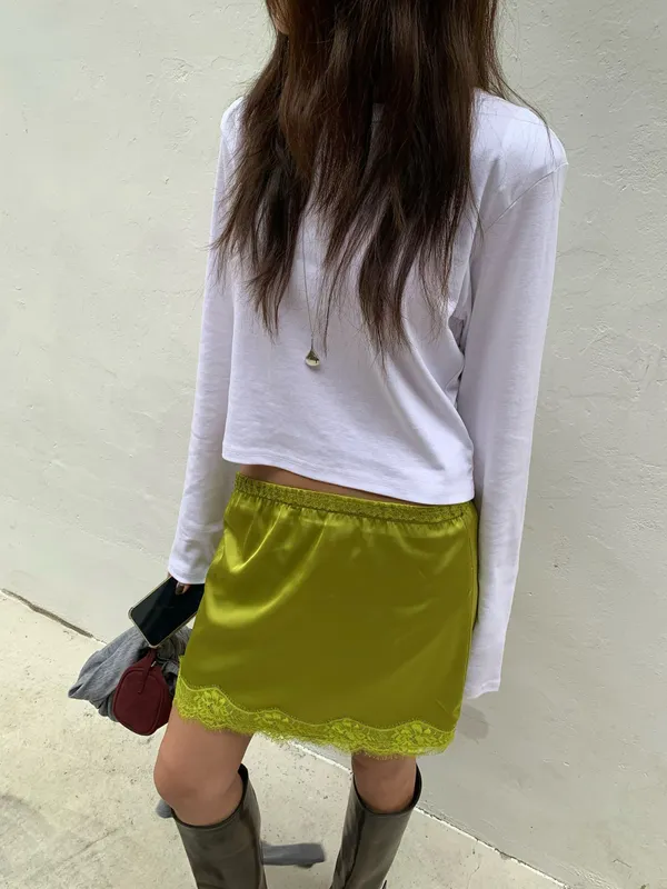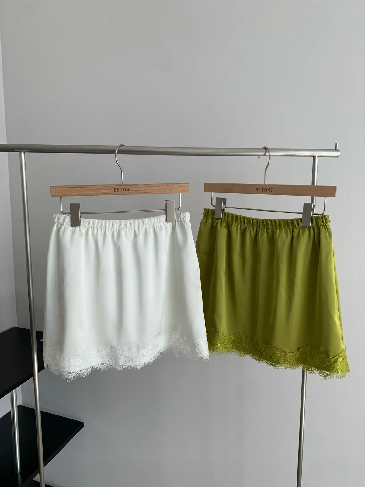 25JB23 緞面拼蕾絲鬆緊腰短裙 2色