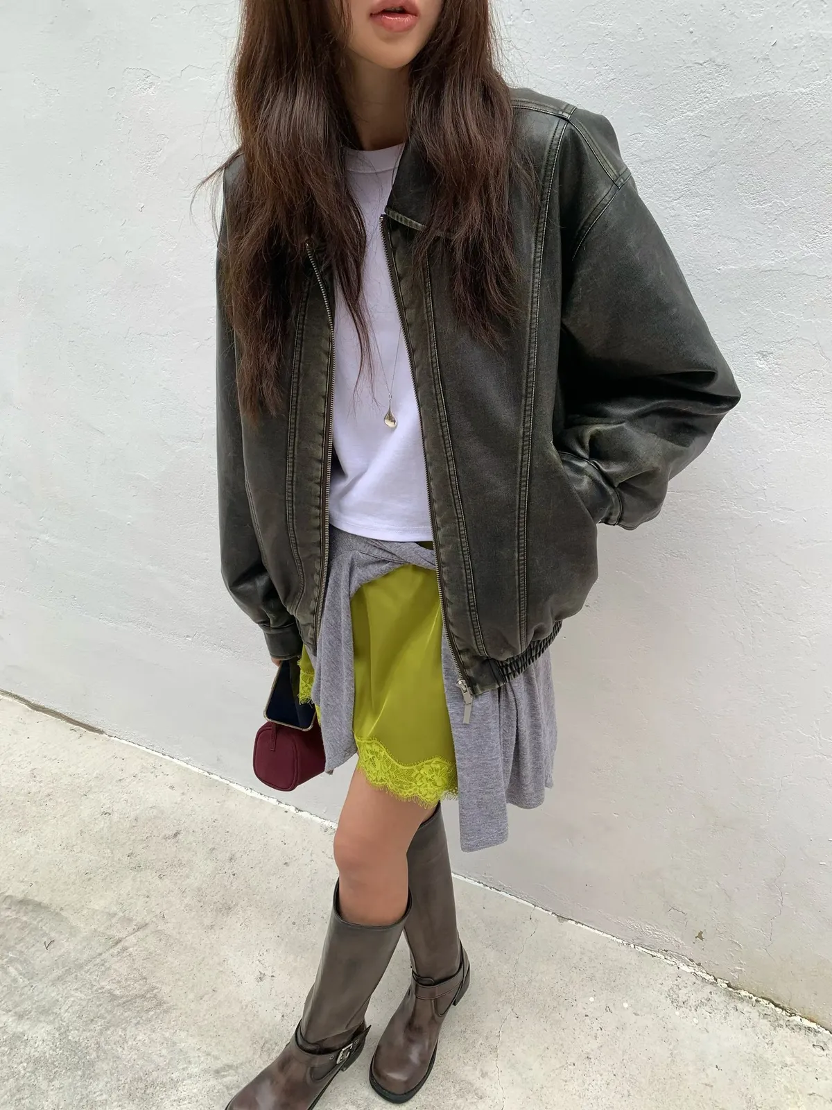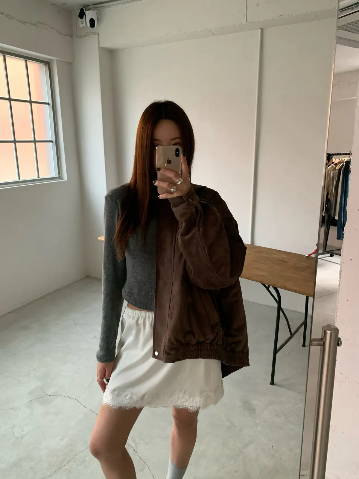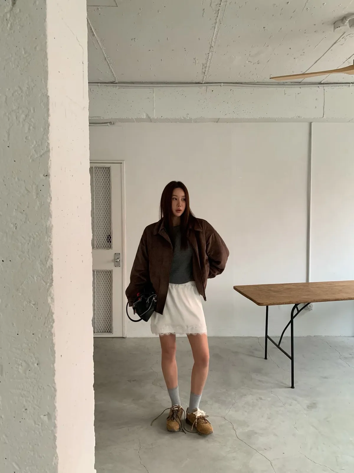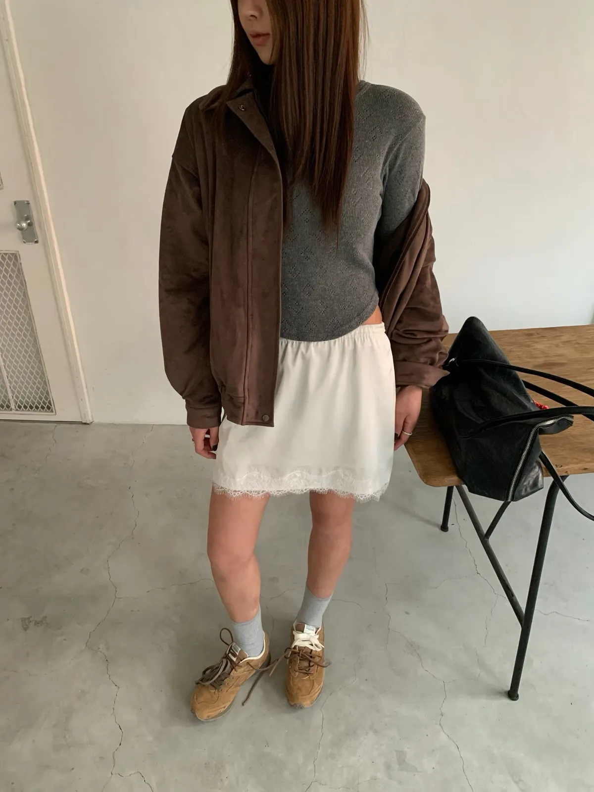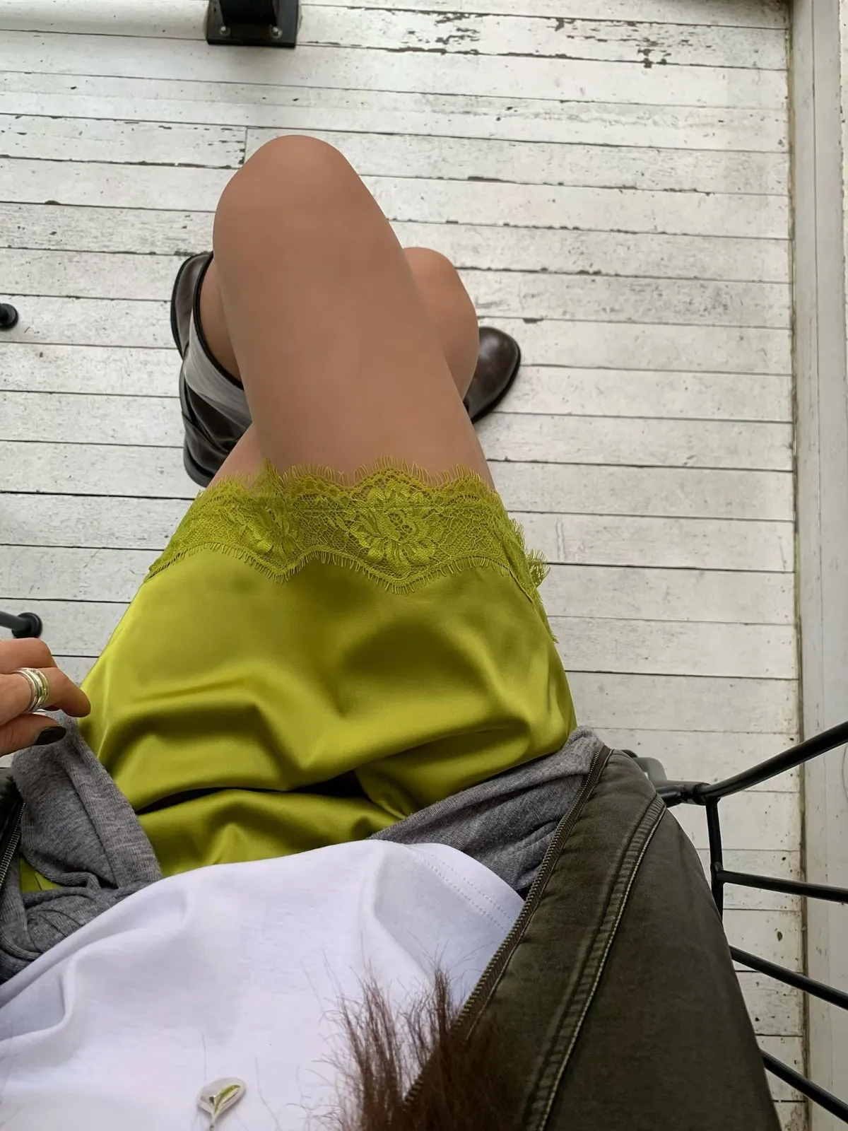 25JB23 緞面拼蕾絲鬆緊腰短裙 2色