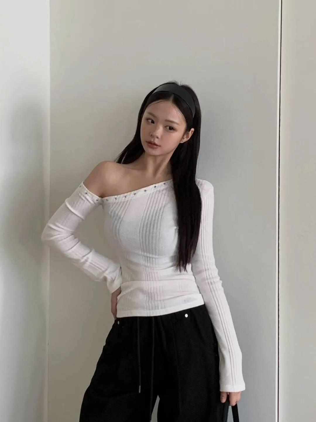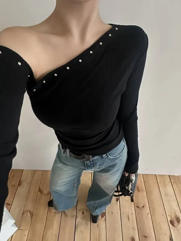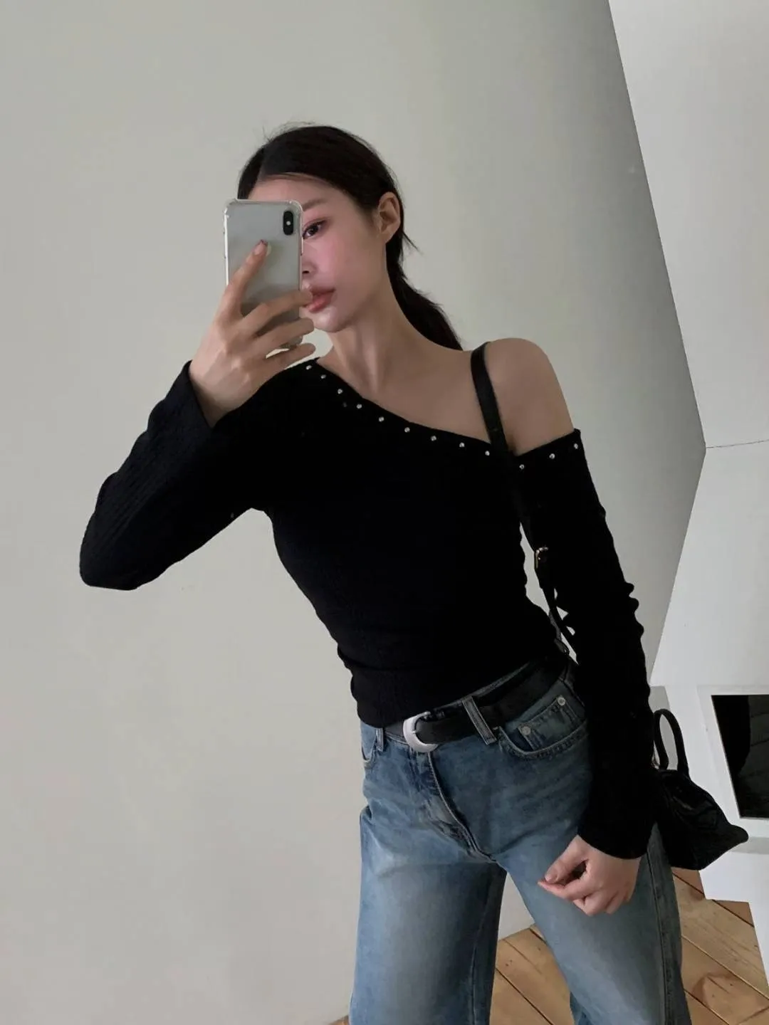 25JD07 鉚釘扣不對稱斜領上衣 3色