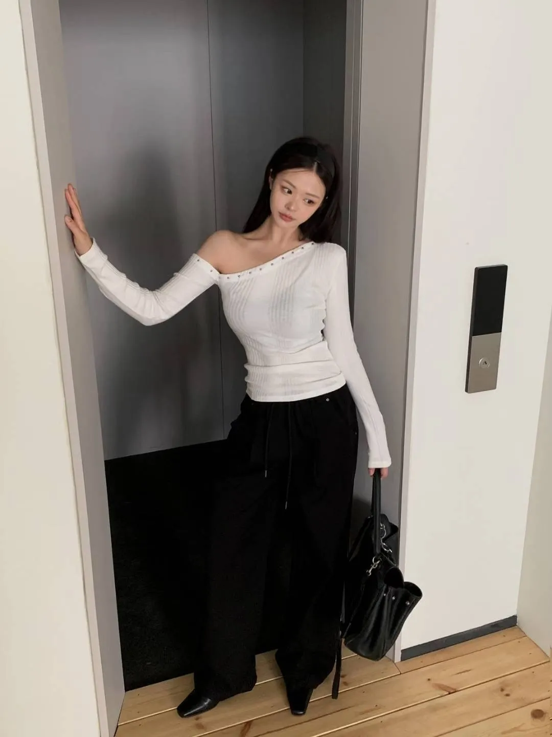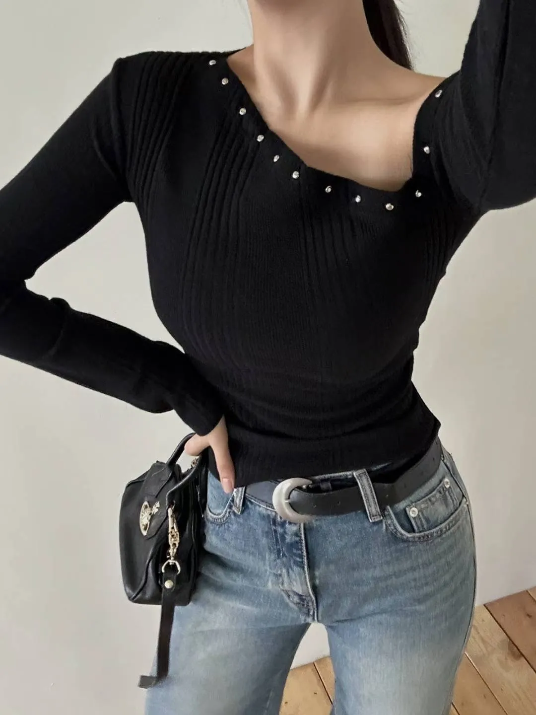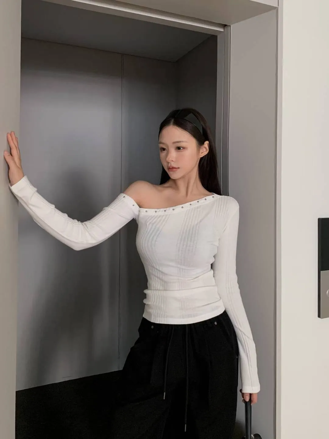 25JD07 鉚釘扣不對稱斜領上衣 3色
