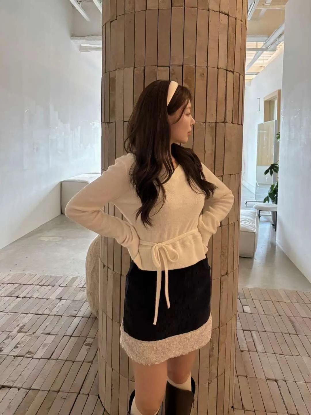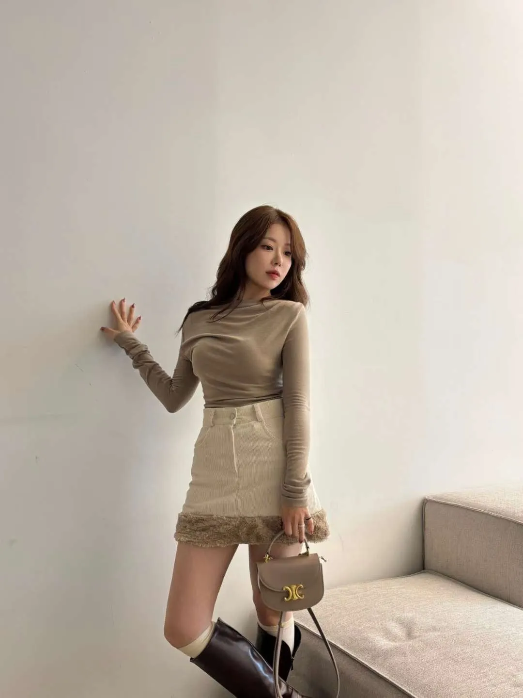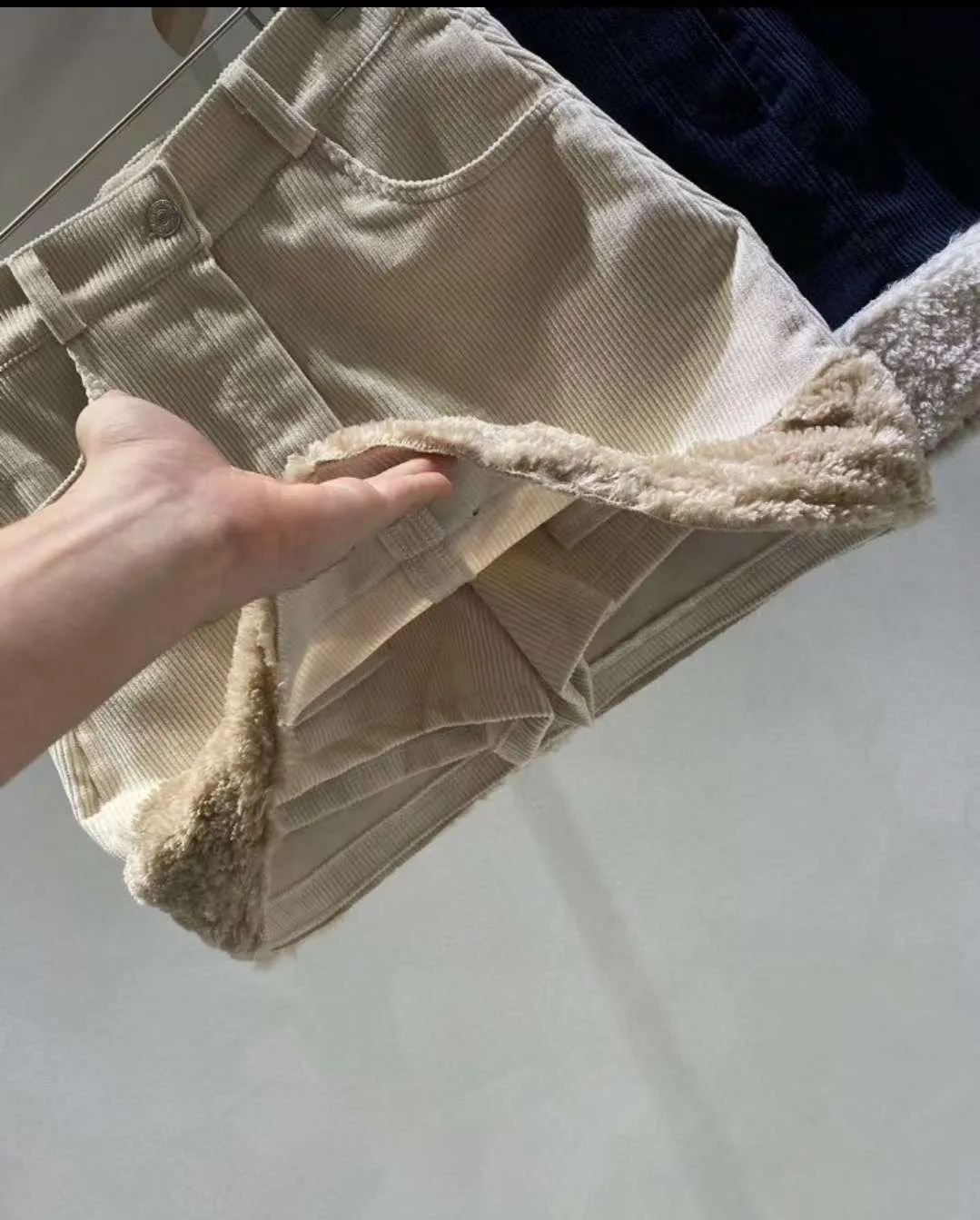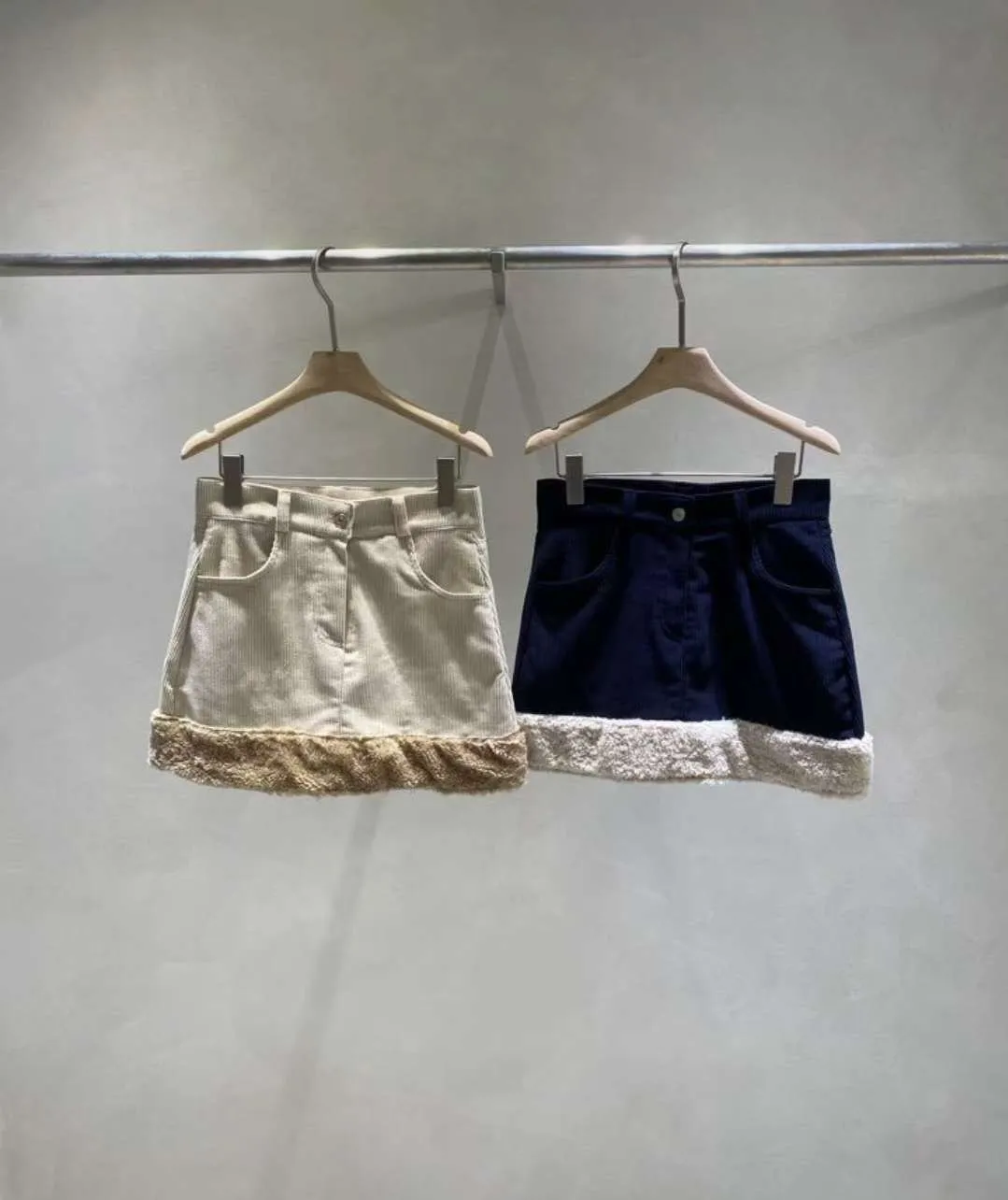 25JE07 燈芯絨拼QQ毛高腰短褲裙 2色 SM