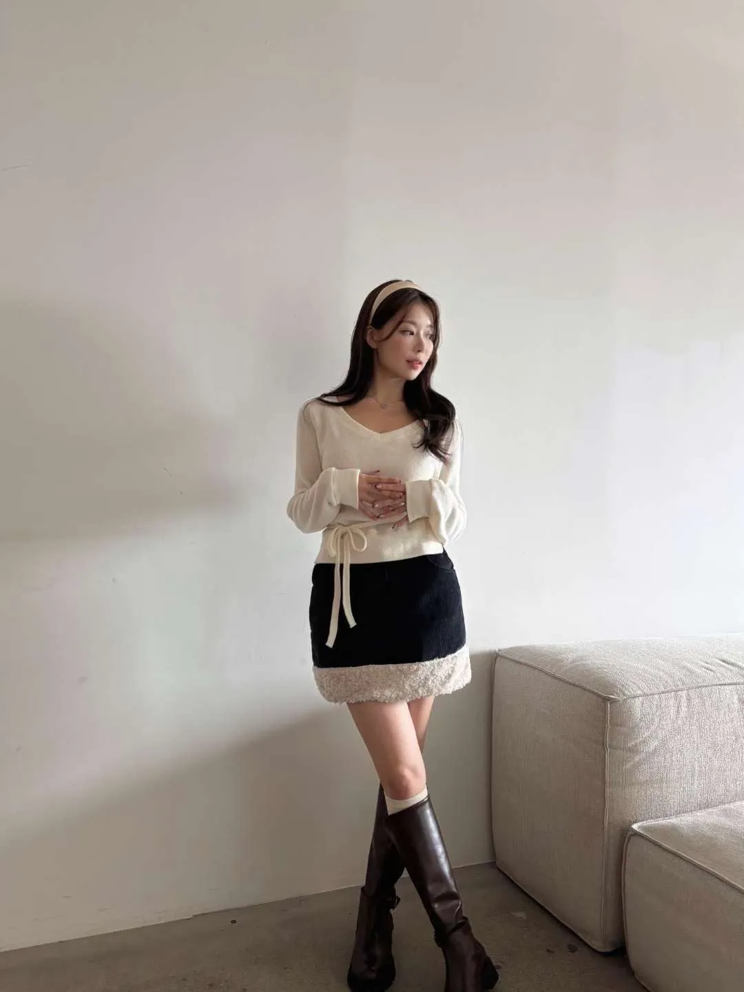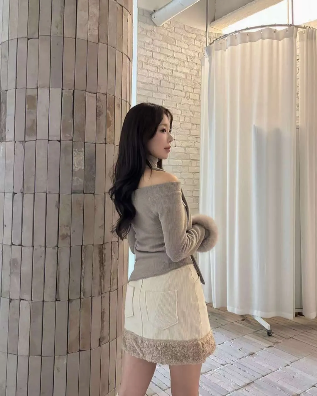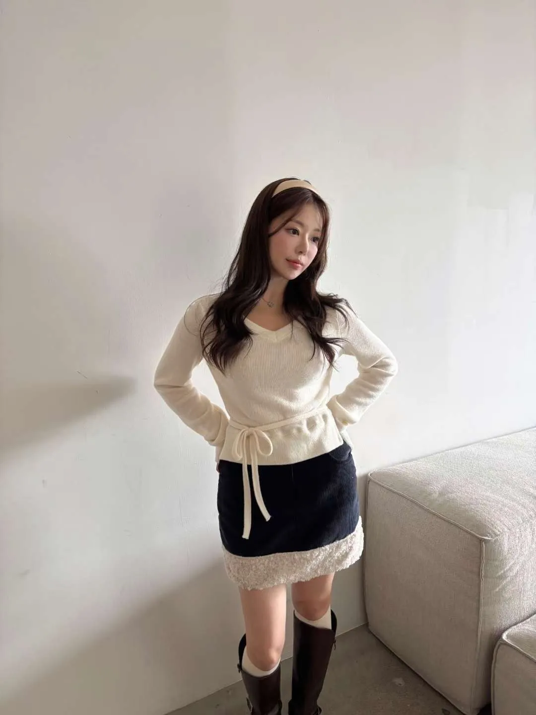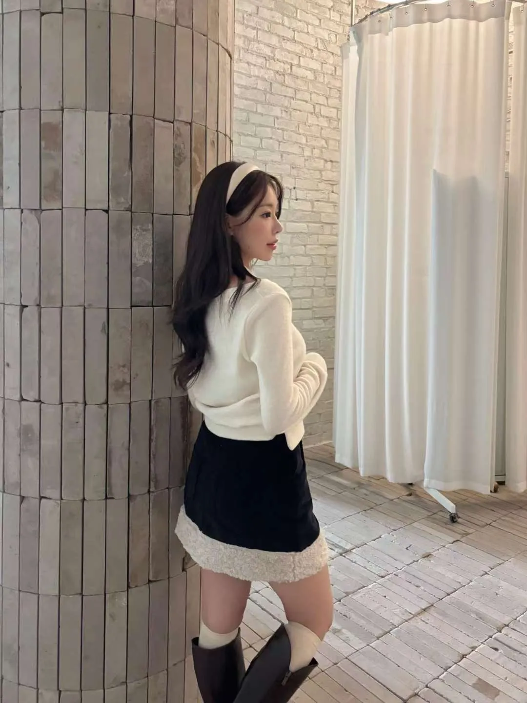 25JE07 燈芯絨拼QQ毛高腰短褲裙 2色 SM