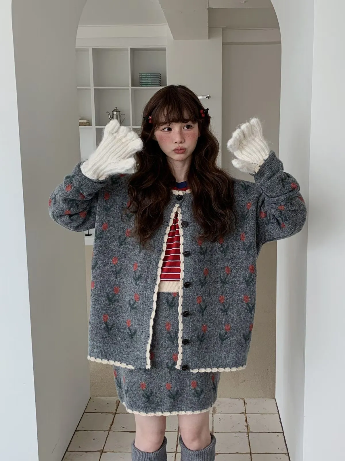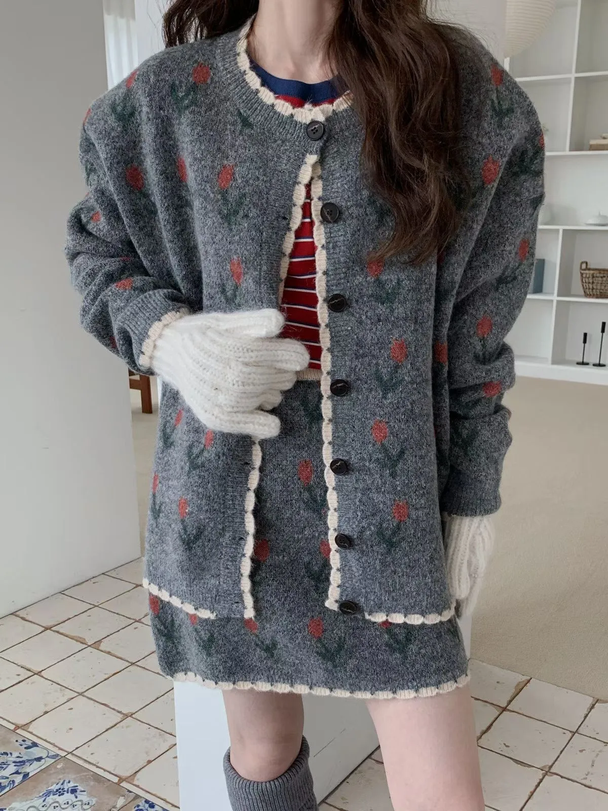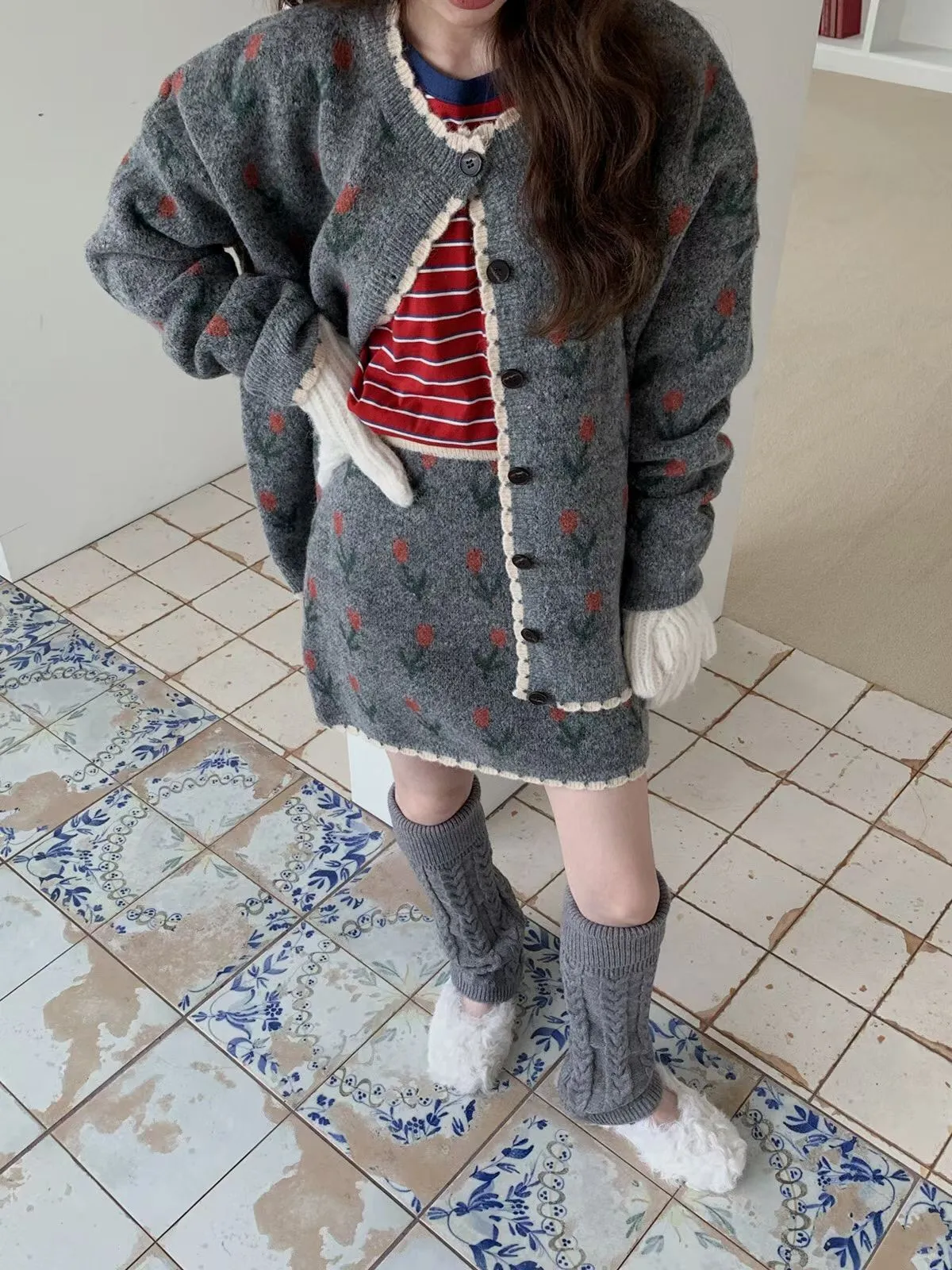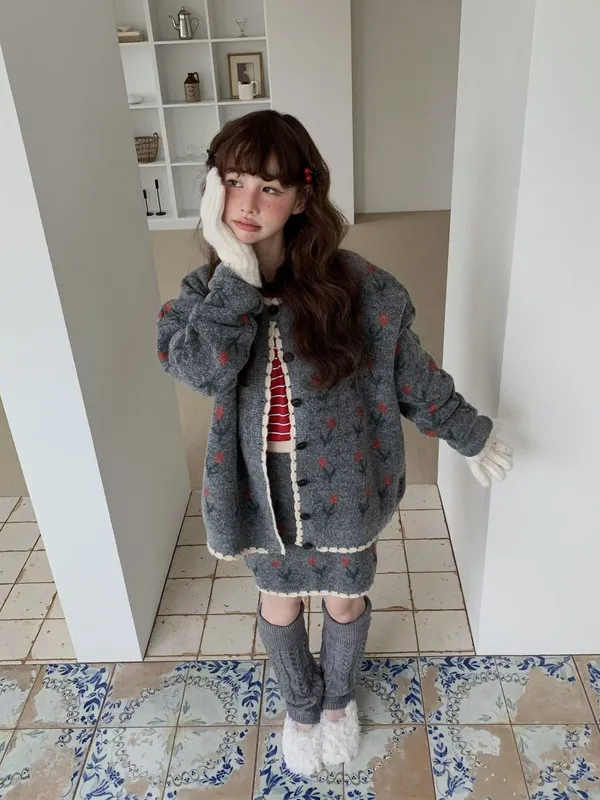 25JH08 羊毛針織鬱金香罩衫+短裙 SET