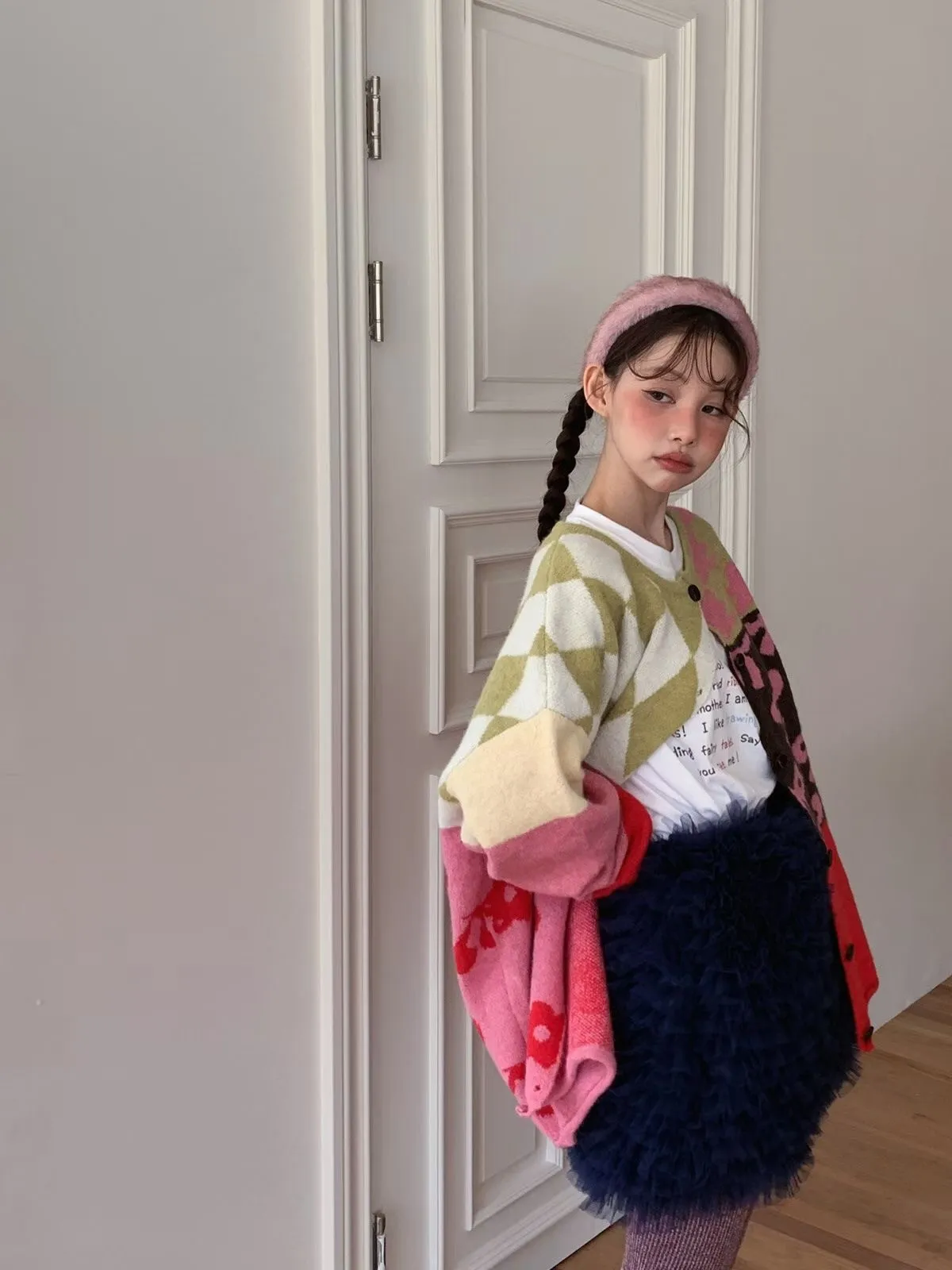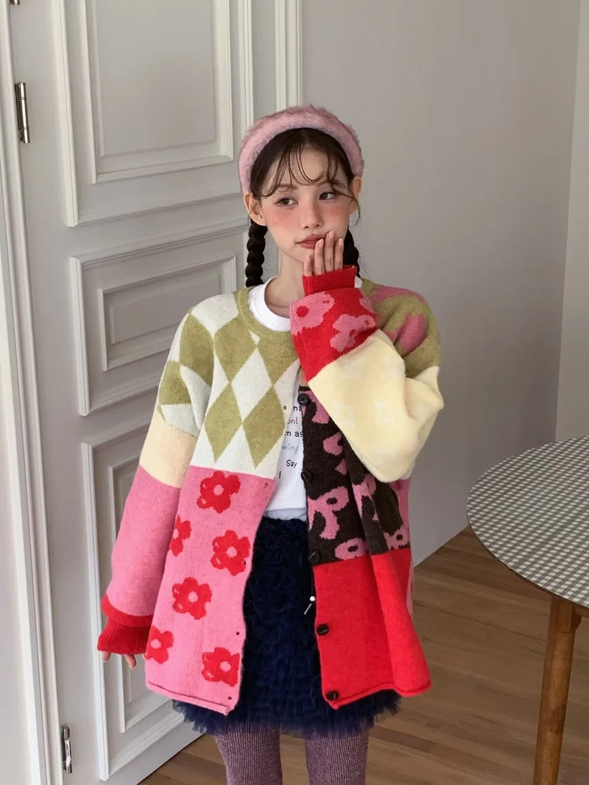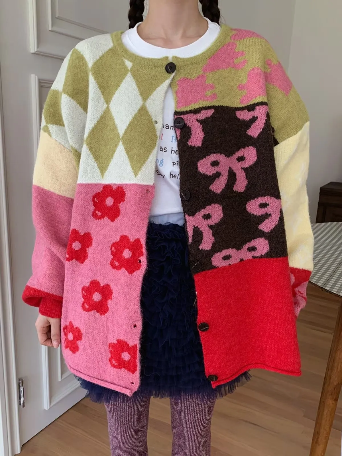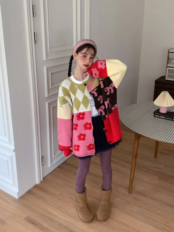 25JH31 多色拼接圖案羊毛針織中長版外罩