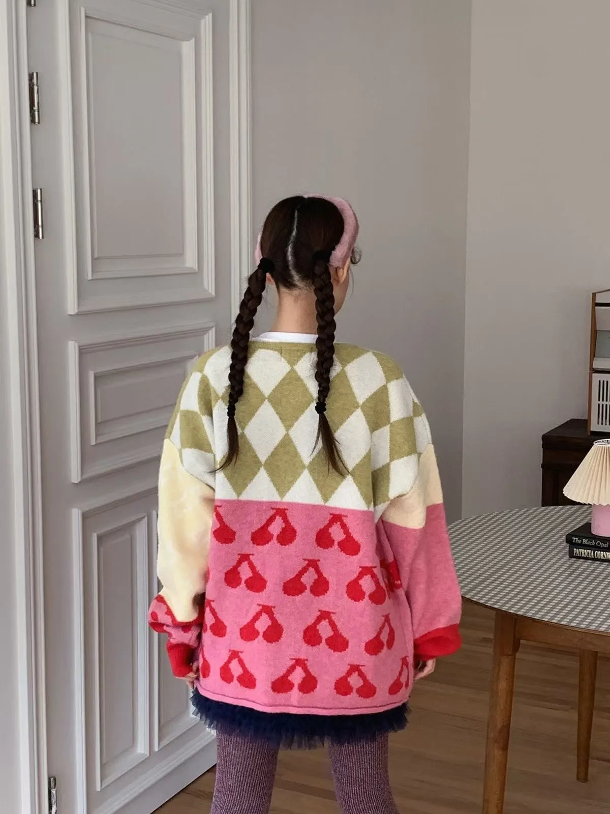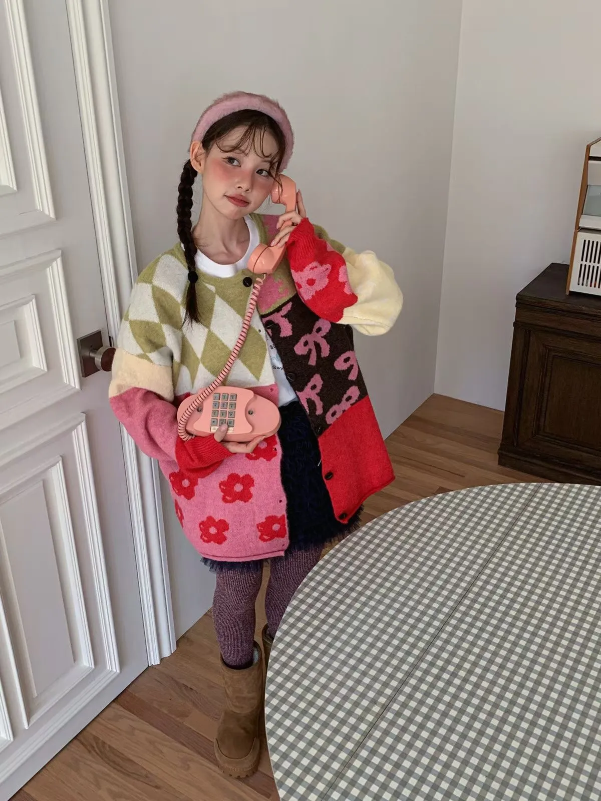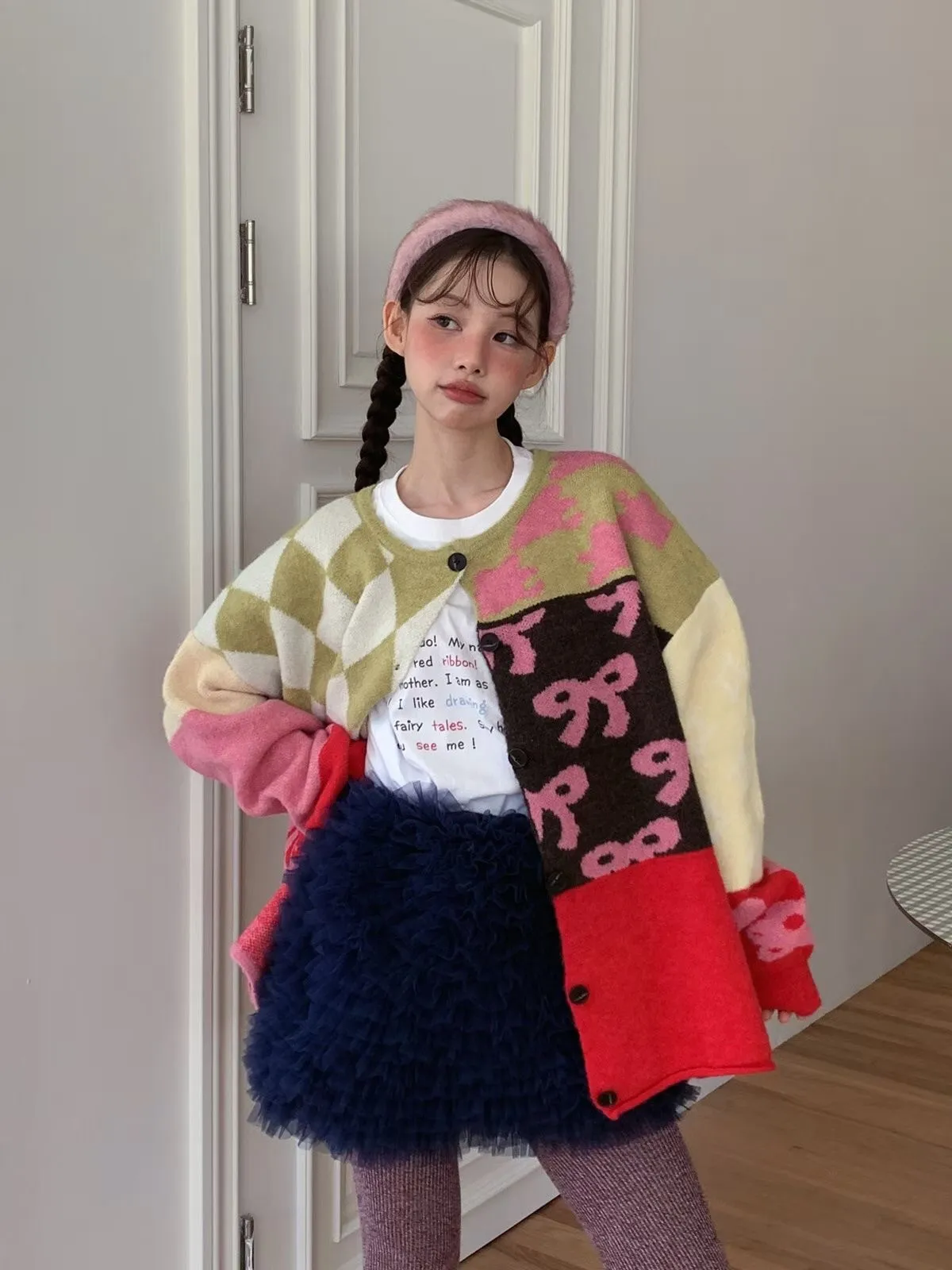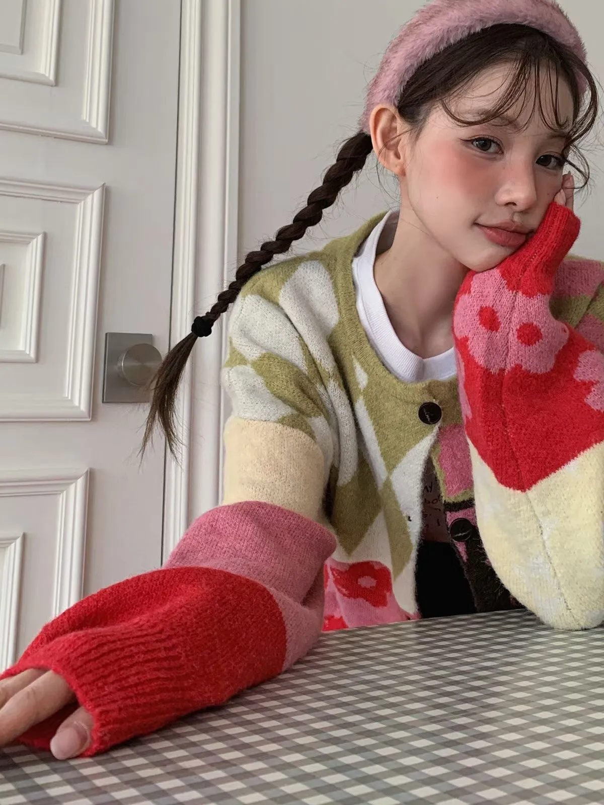 25JH31 多色拼接圖案羊毛針織中長版外罩