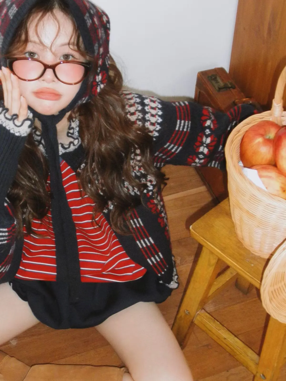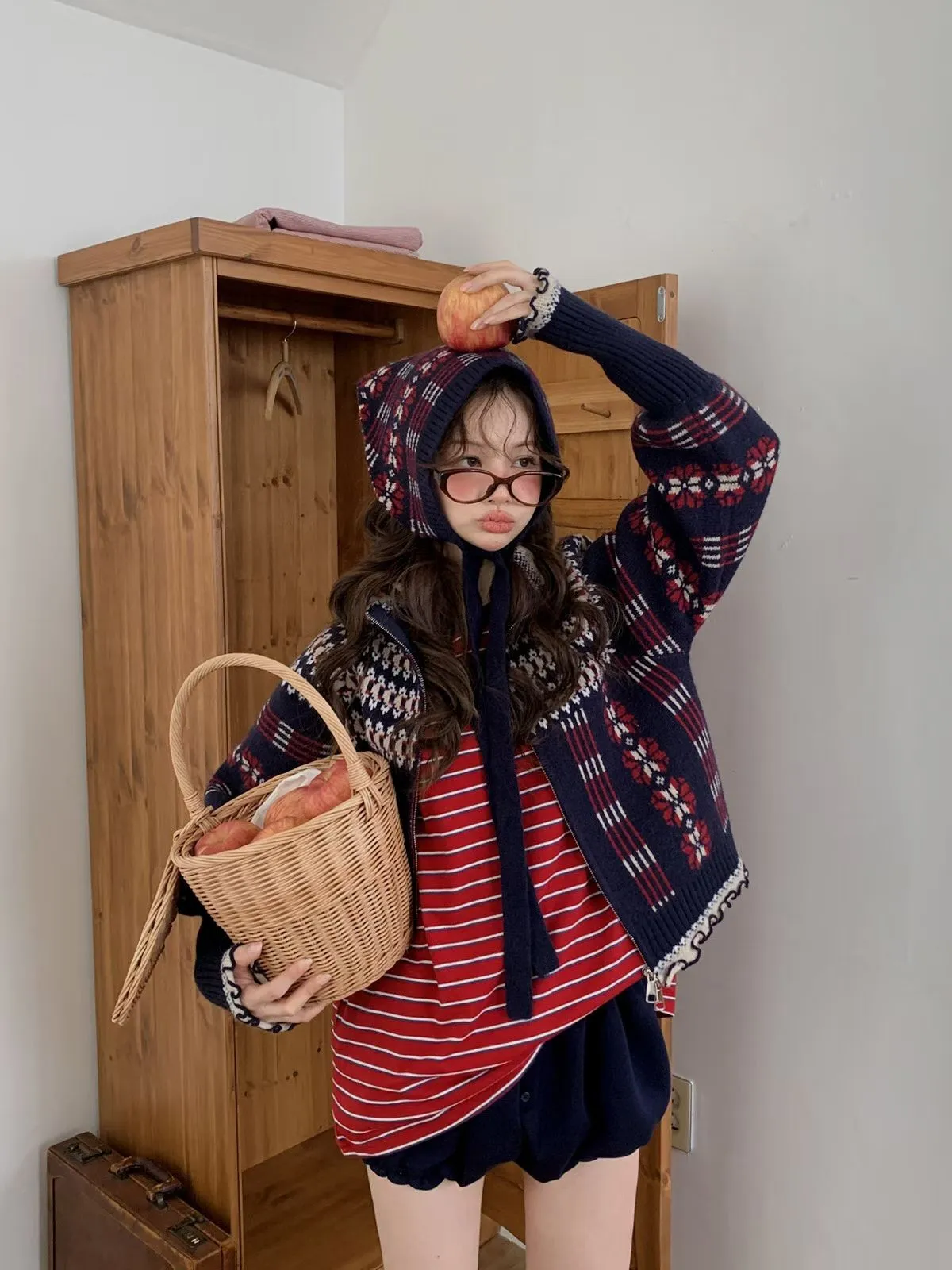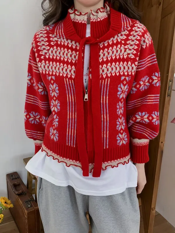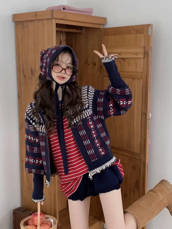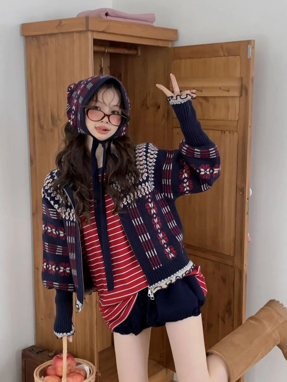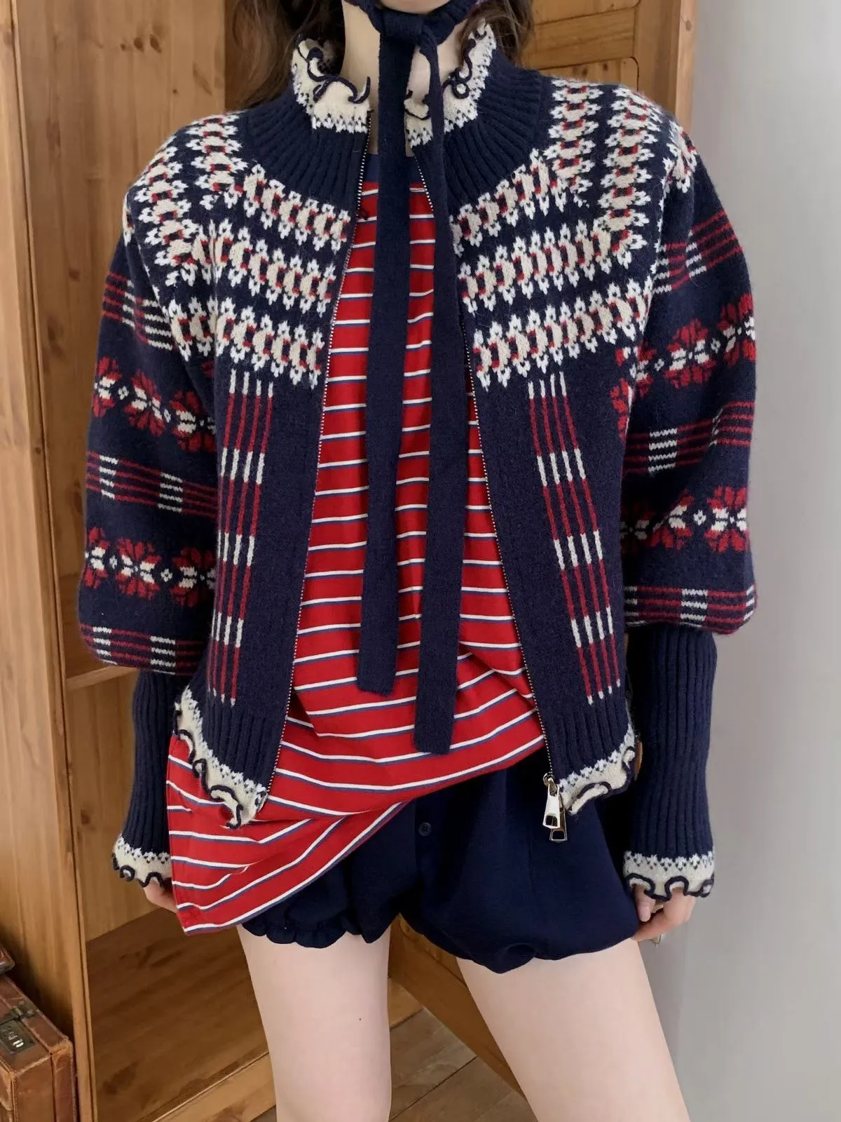 25JH36 碎彩花針織羊毛雙拉鏈毛衣外套+三角綁帶 set 2色