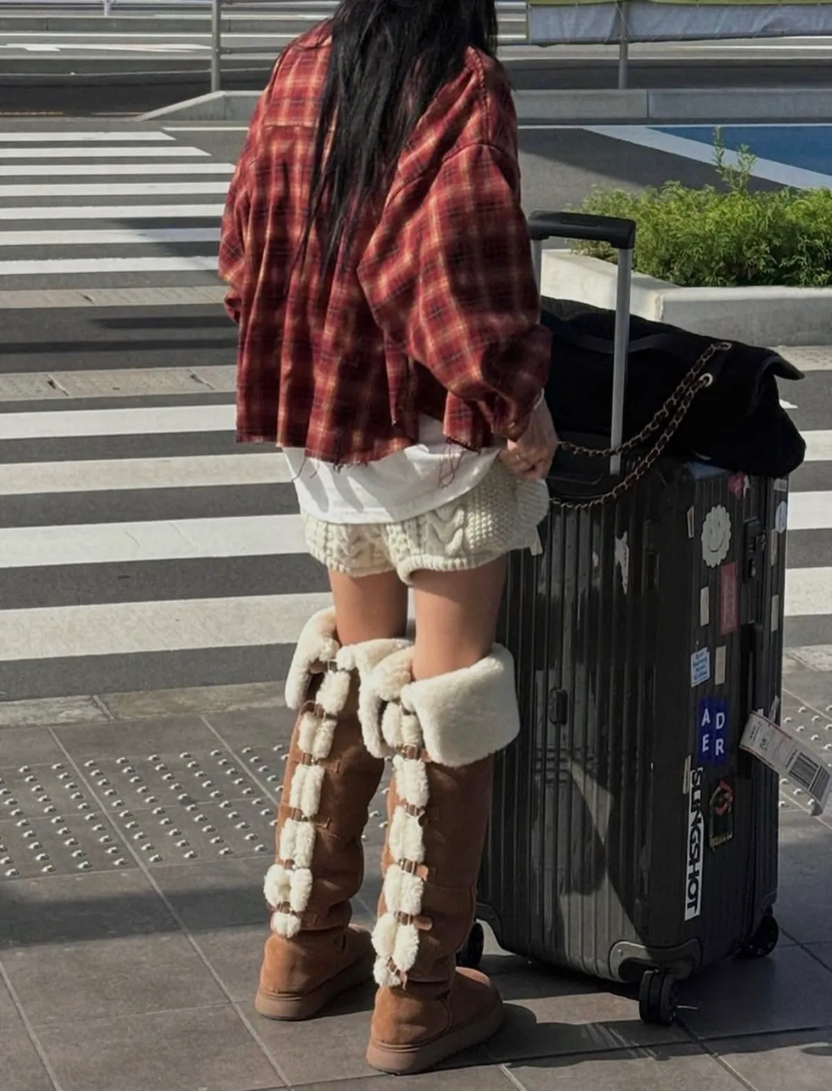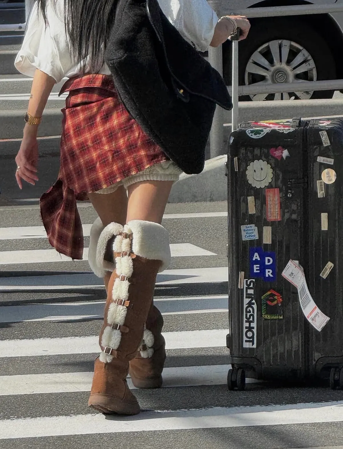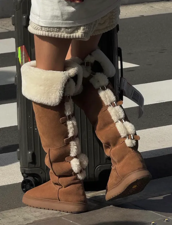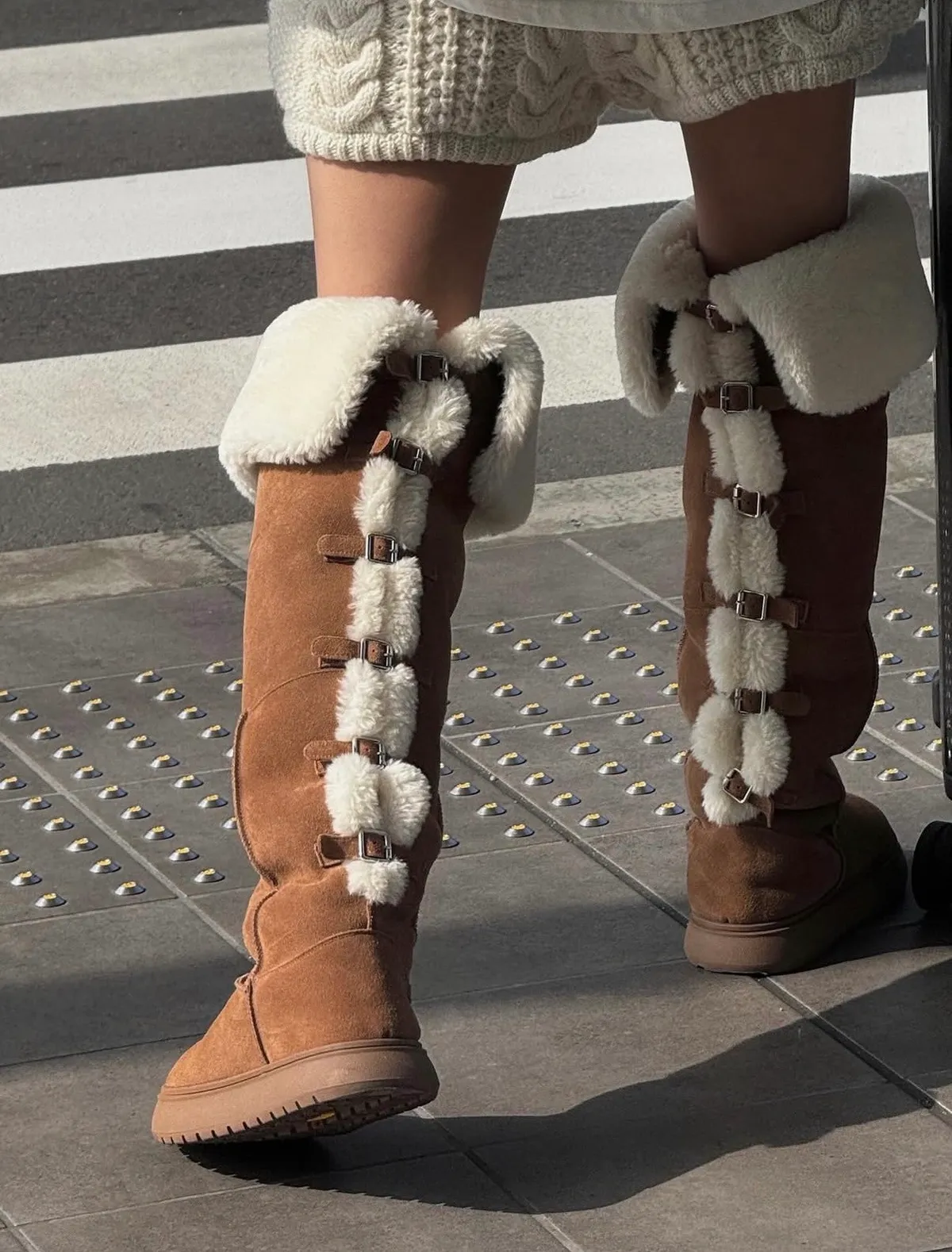 25JI16 真皮)牛麂皮羊羔毛過膝可反摺雪靴 SML