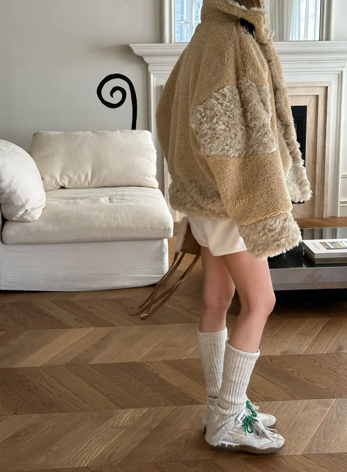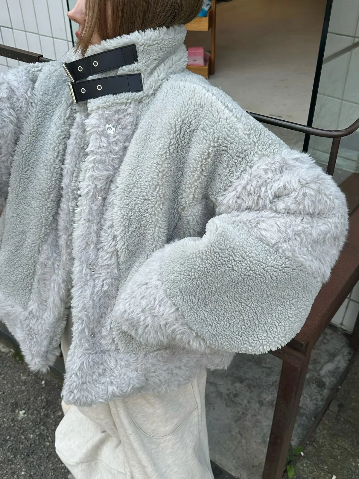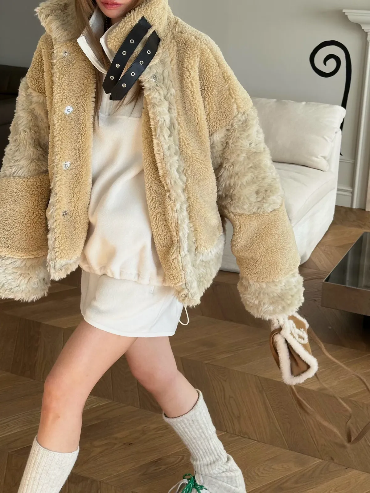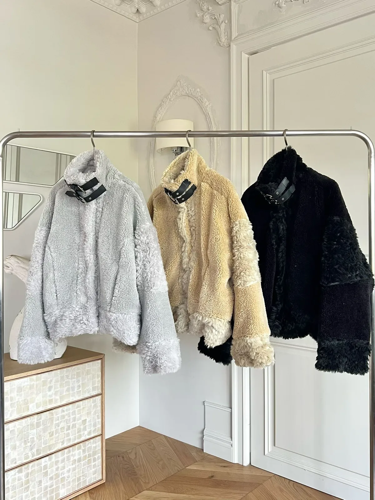 25JK13 拼接毛毛內夾棉騎士扣外套 3色