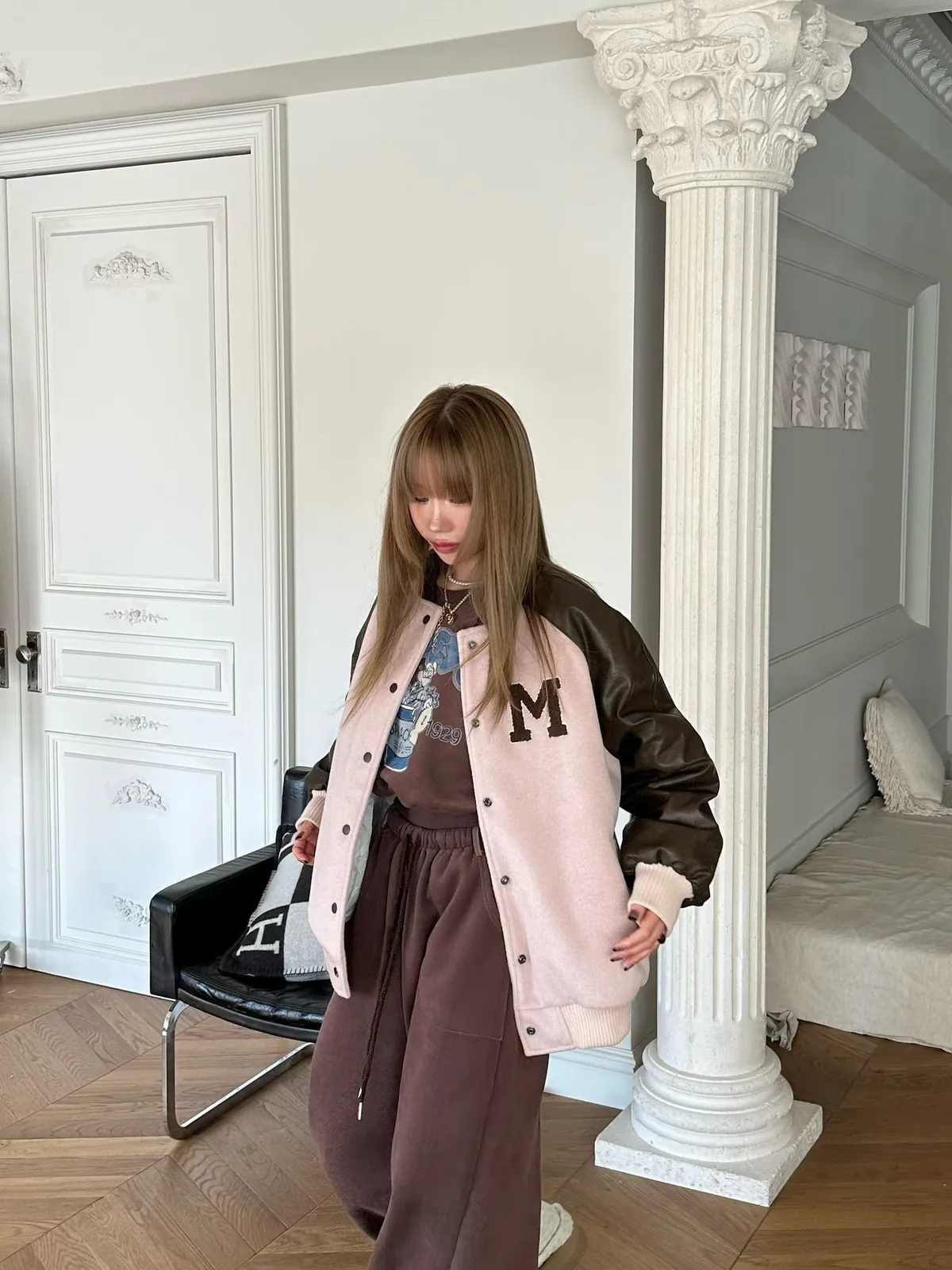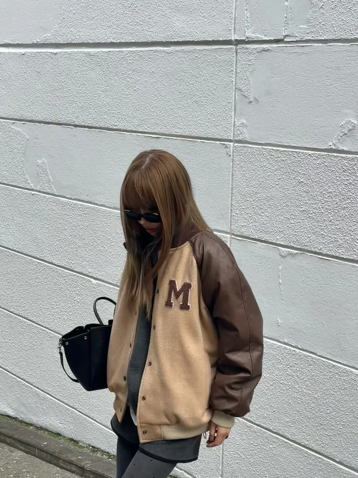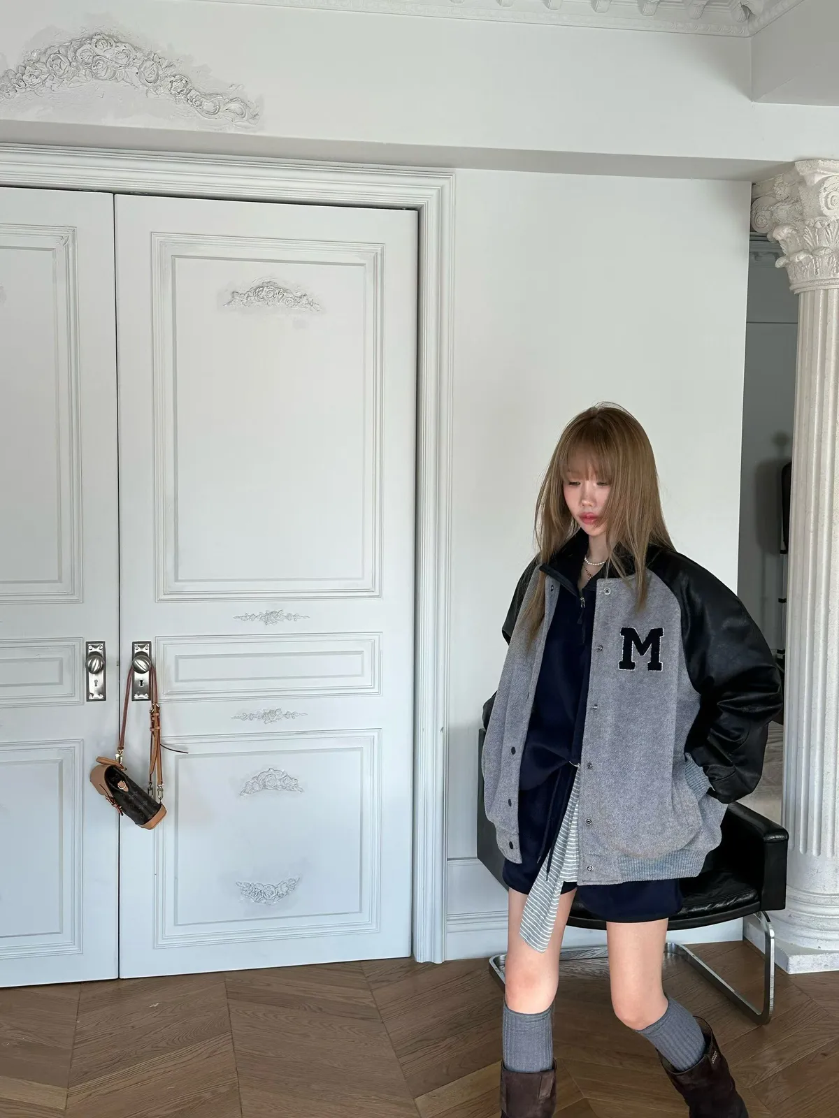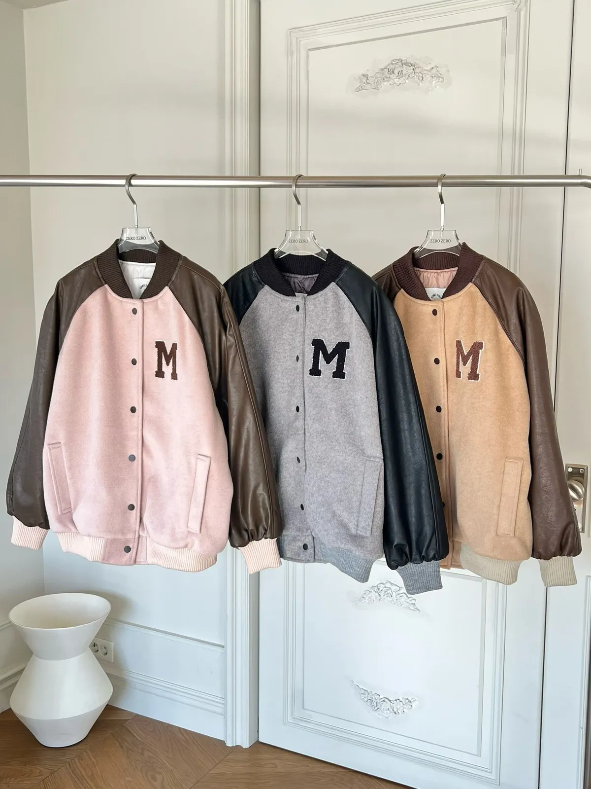 25JK17 羊毛M字拼皮袖棒球外套 3色