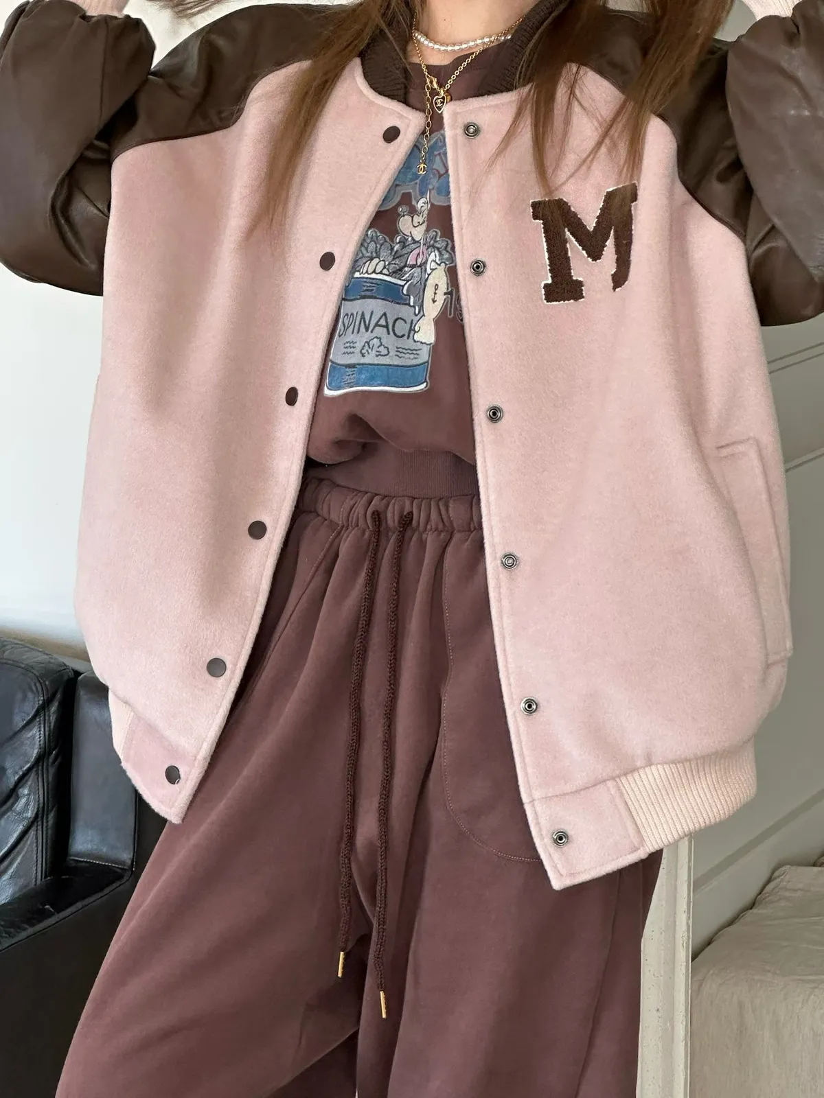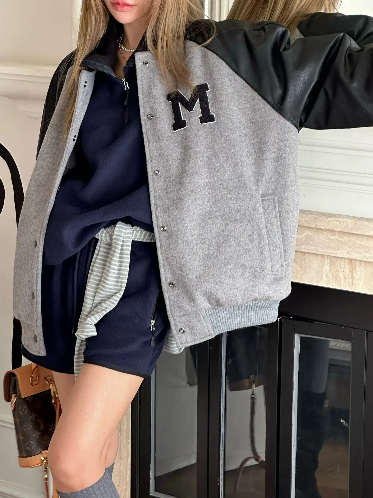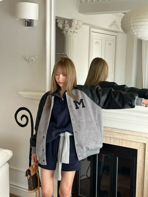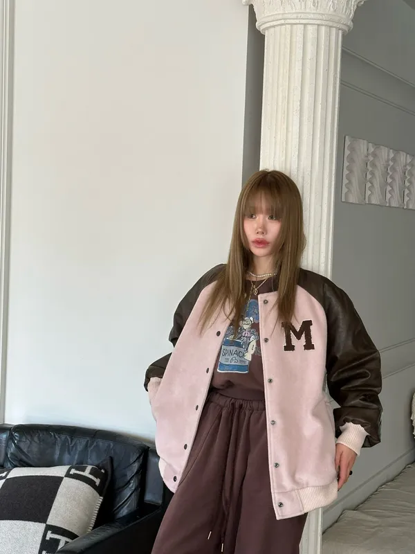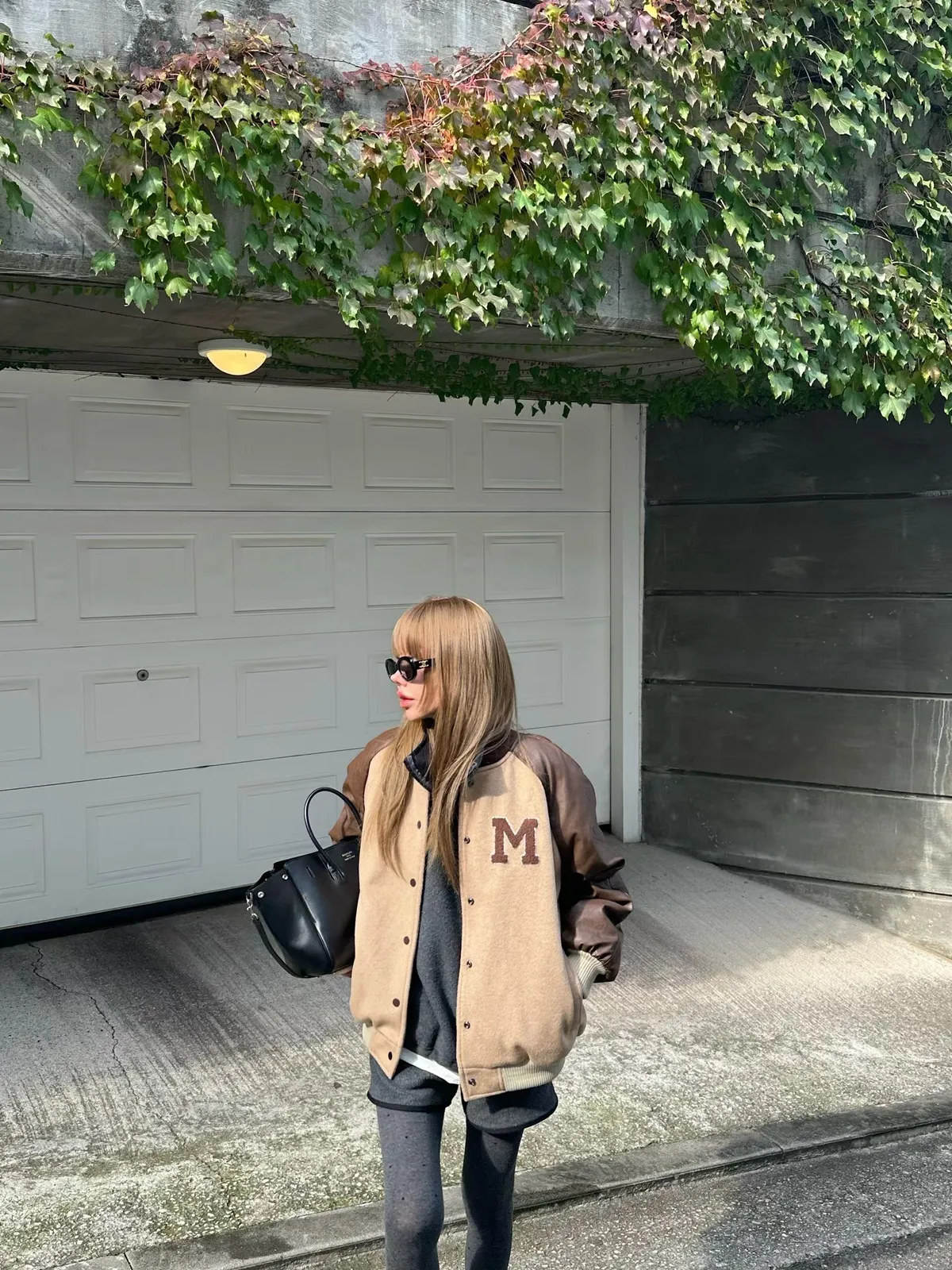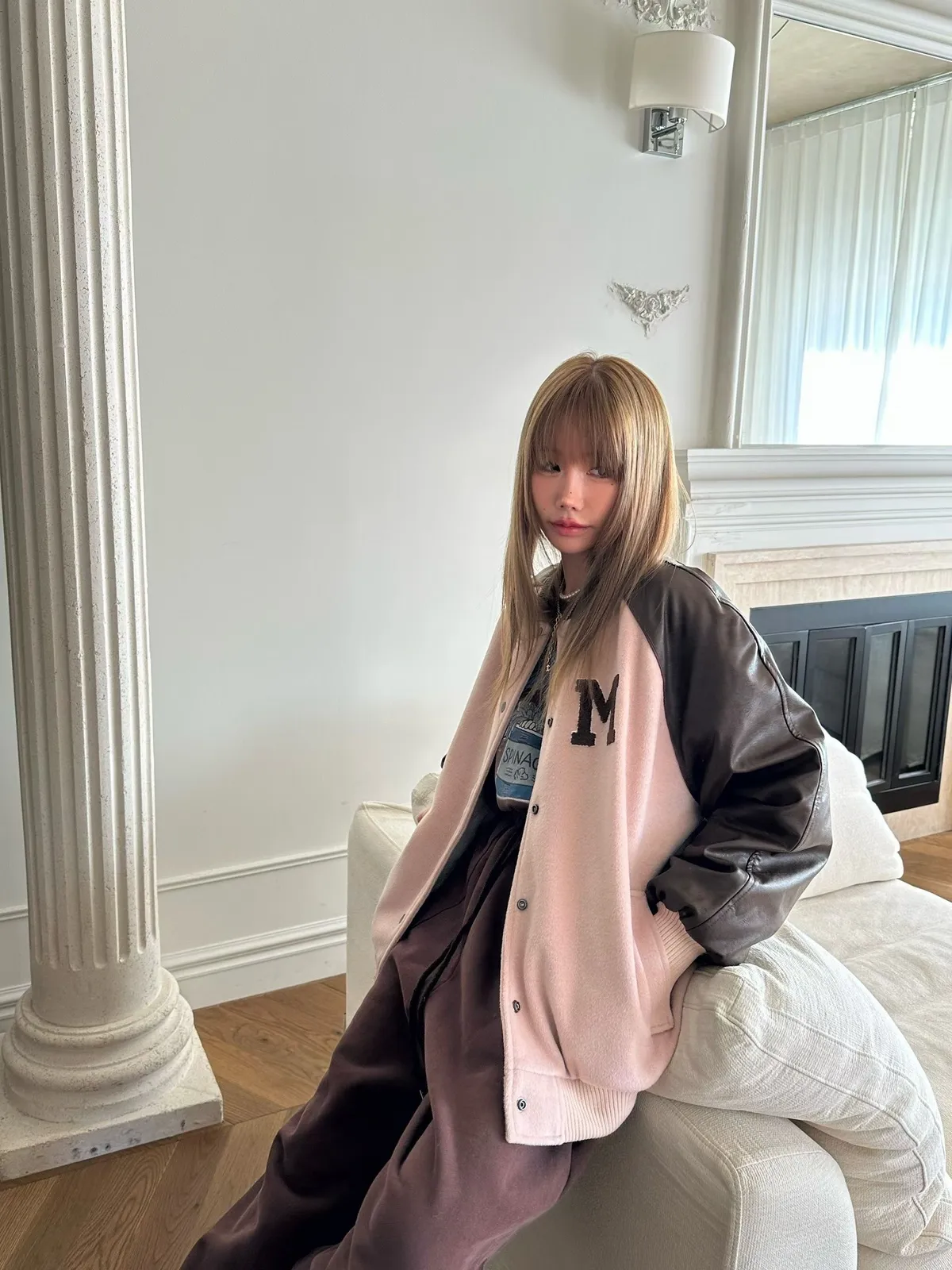 25JK17 羊毛M字拼皮袖棒球外套 3色
