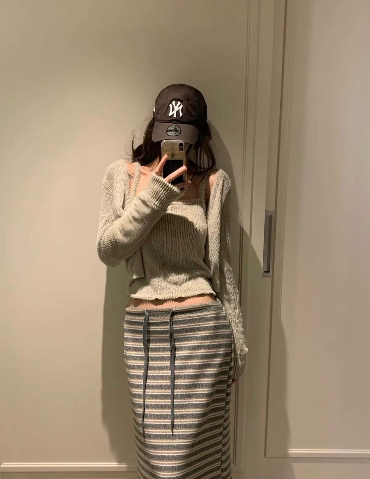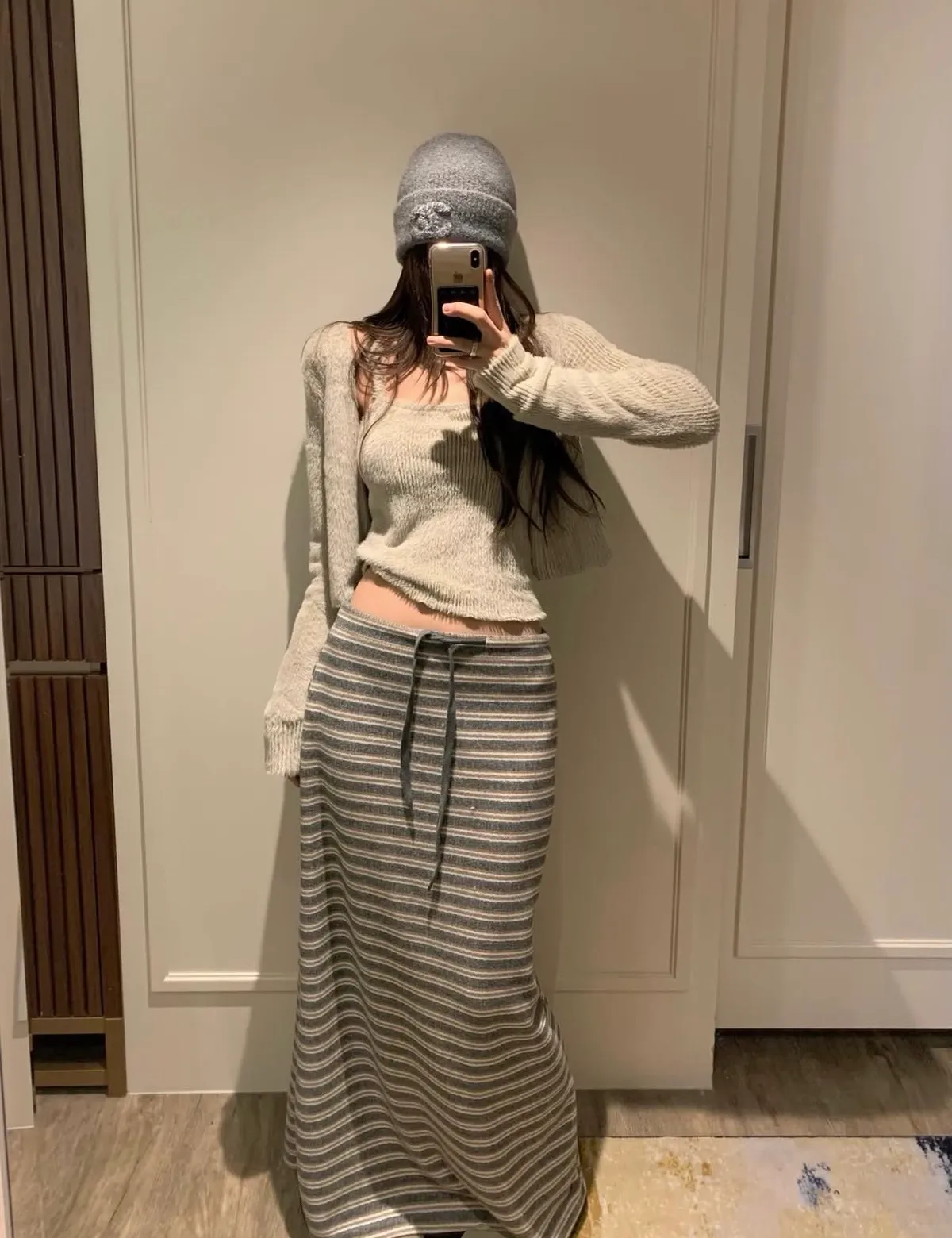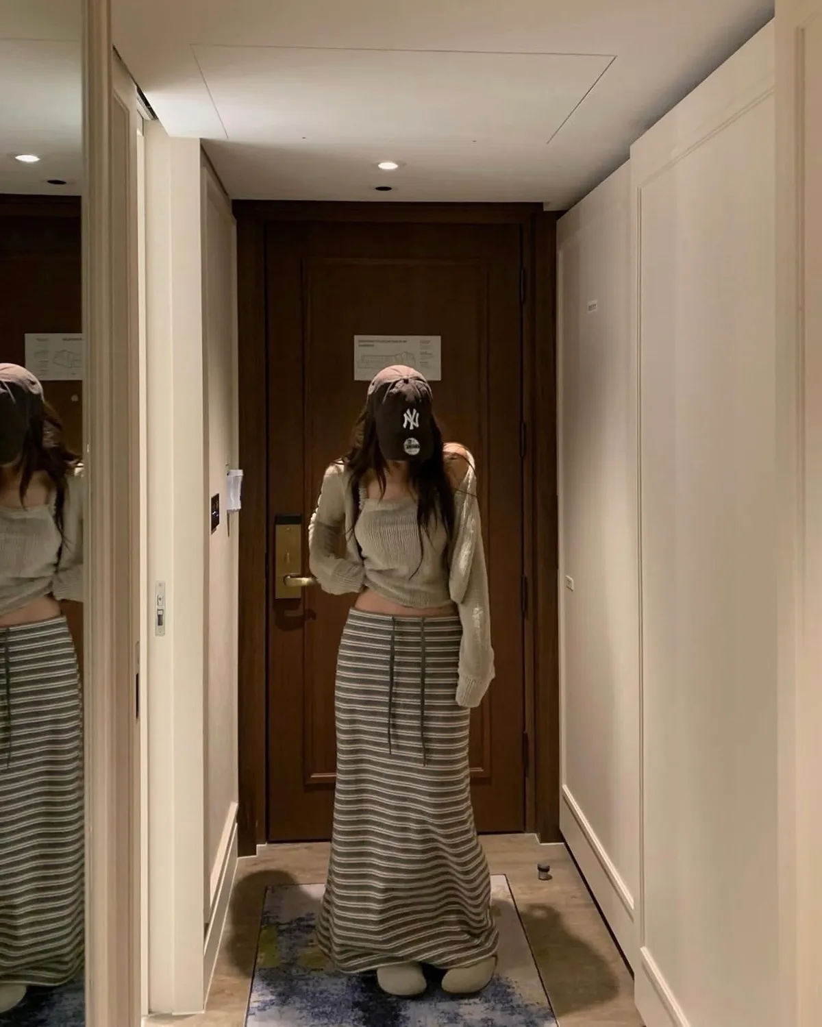 25JL16 絨料撞色條紋中低腰長裙 3色