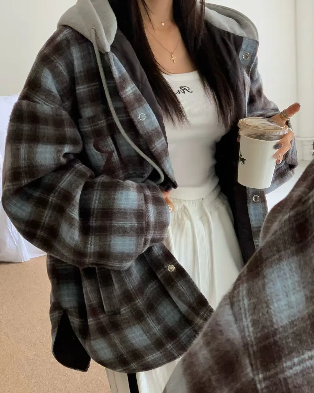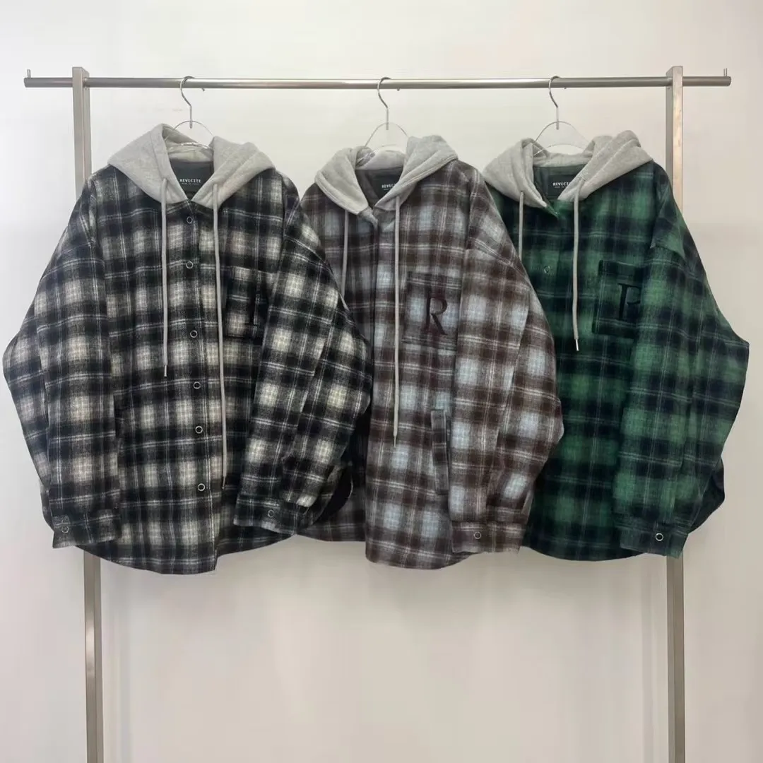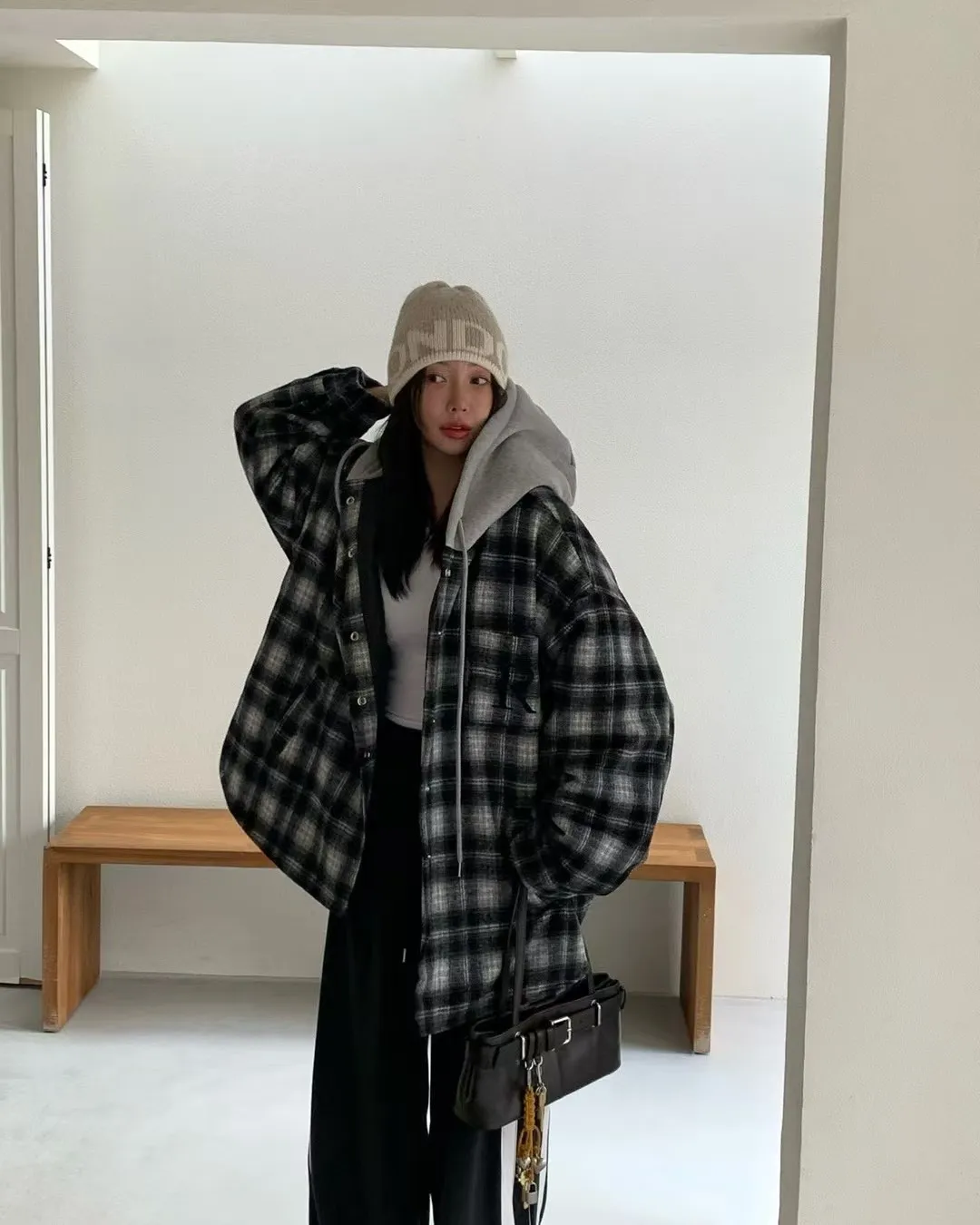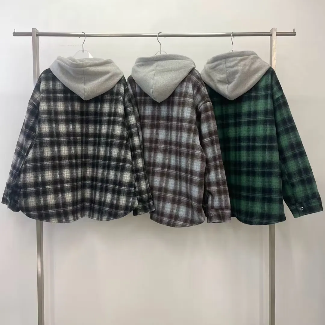 25JM16 羊毛格紋夾棉連帽襯衫外套 3色