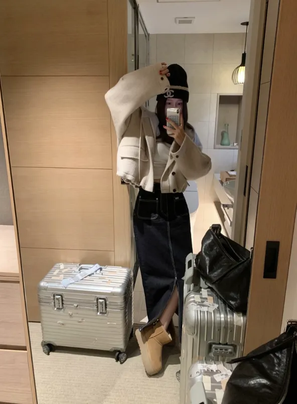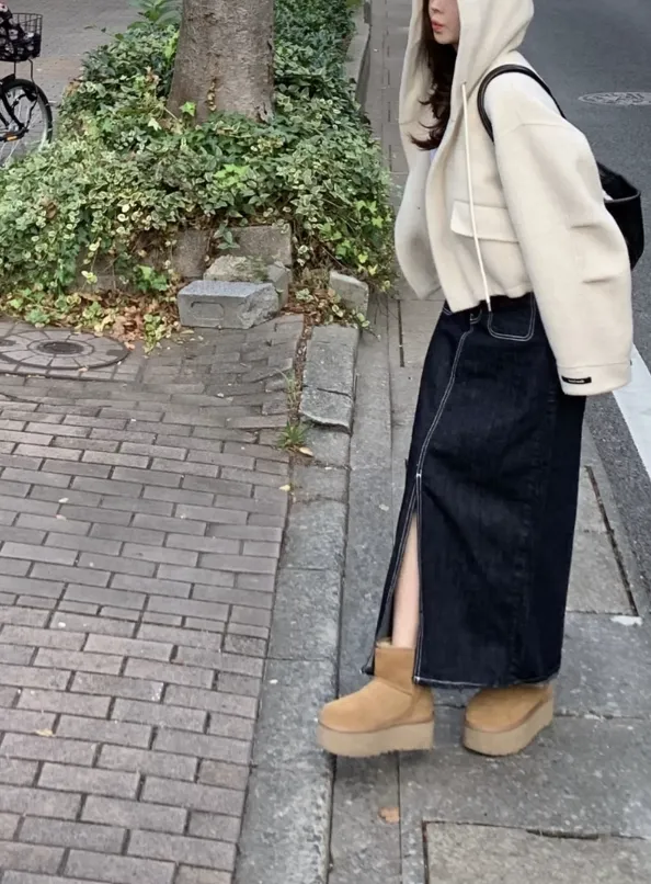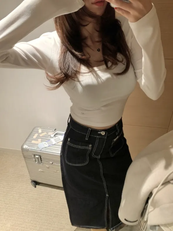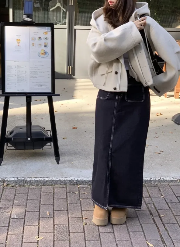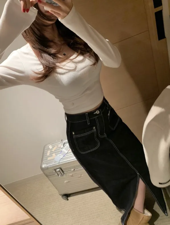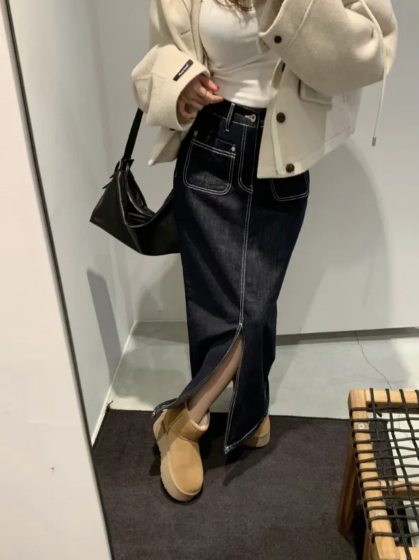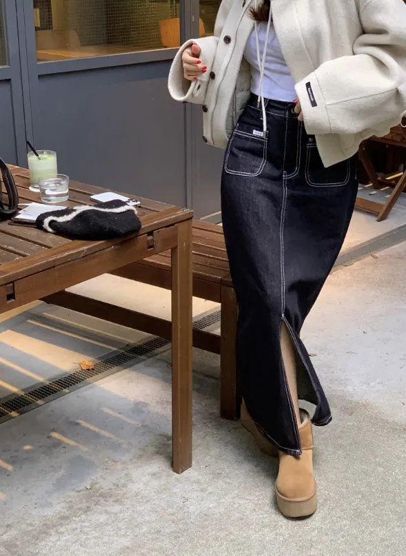25JS25 高腰原色明線前開岔牛仔長裙 SML