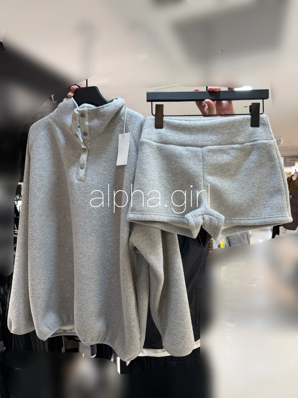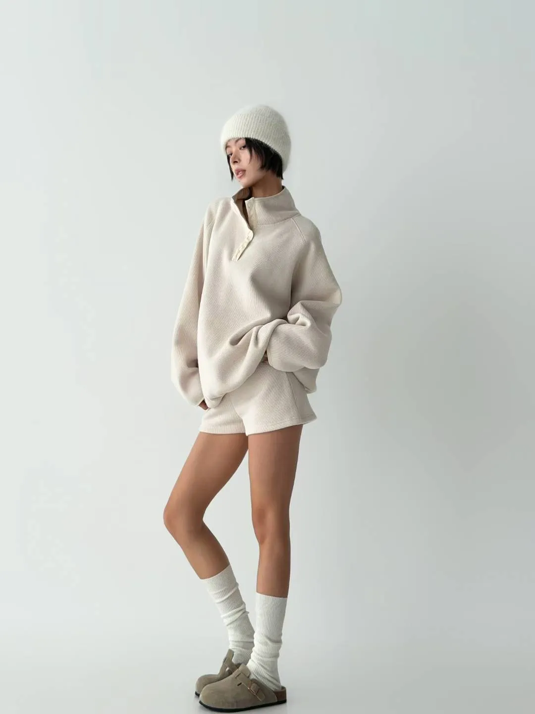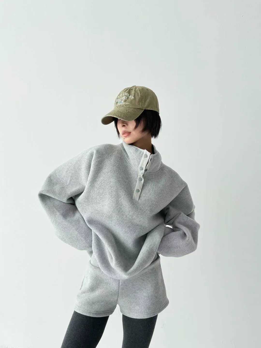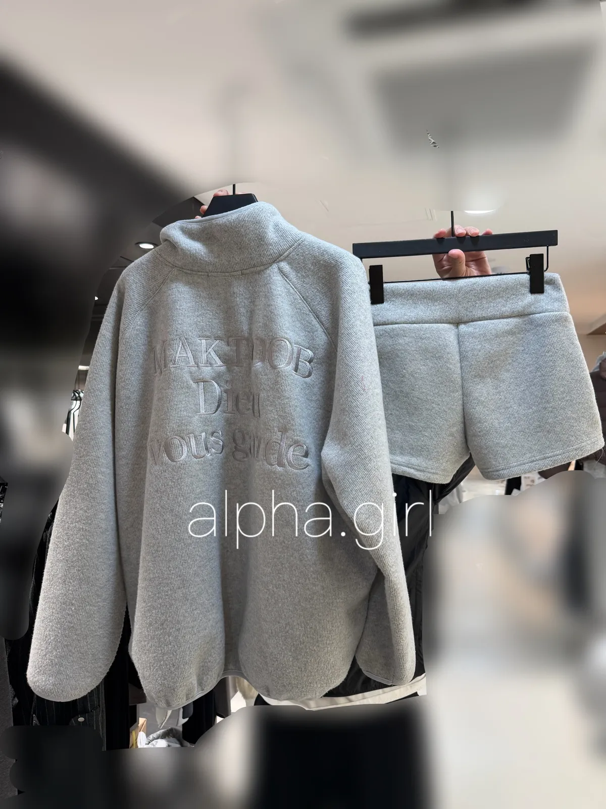 25JS35 後電繡立領中長版加絨大學T+絨小短褲 2色
