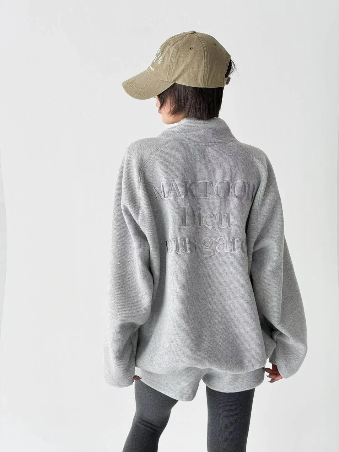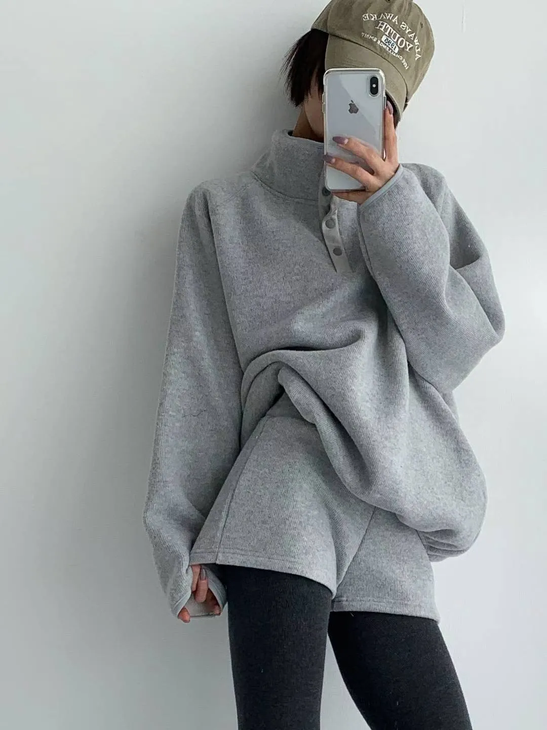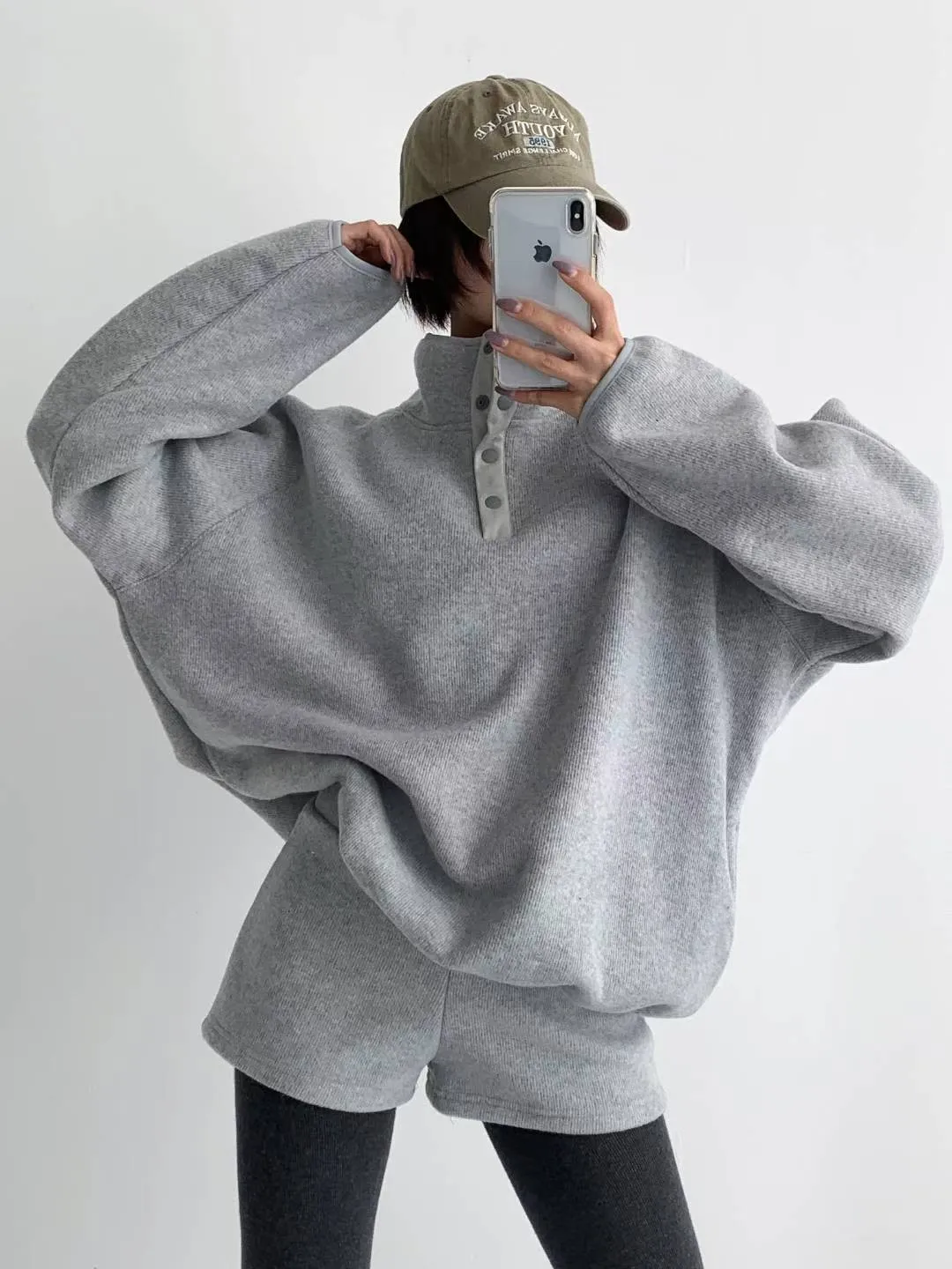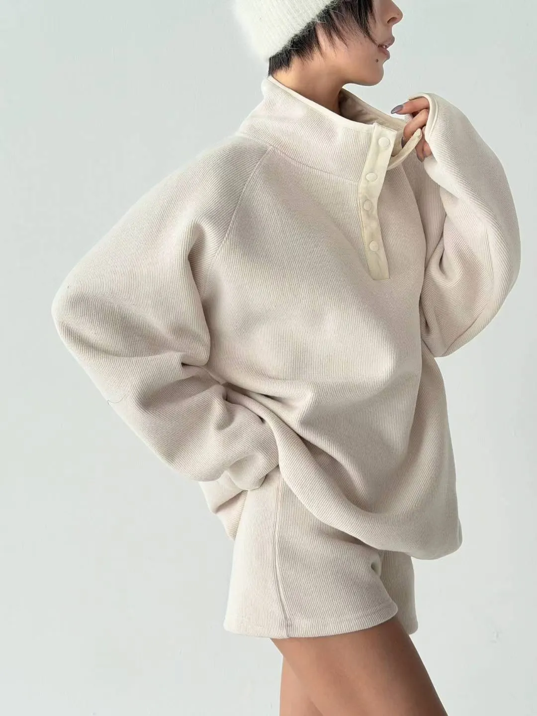 25JS35 後電繡立領中長版加絨大學T+絨小短褲 2色