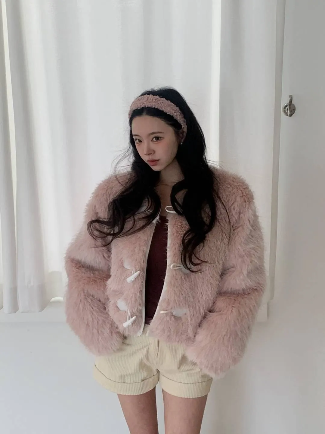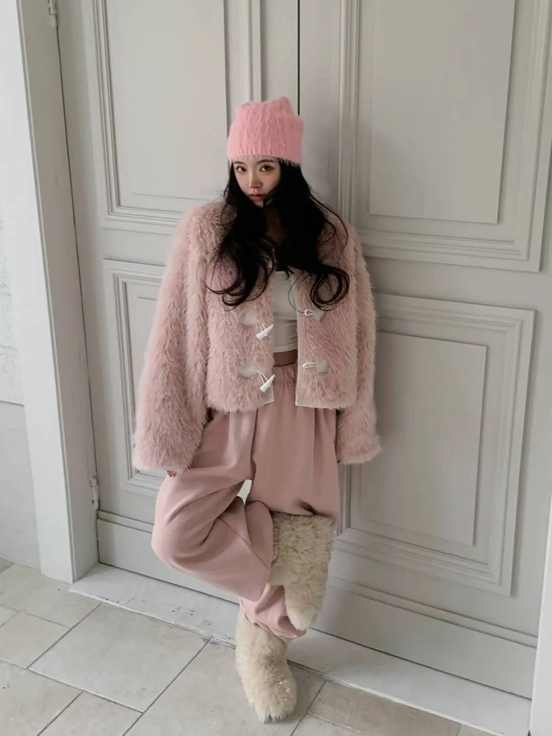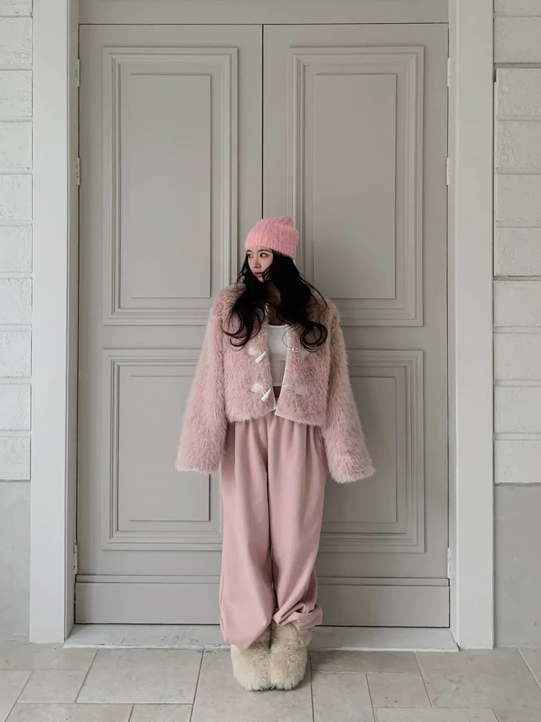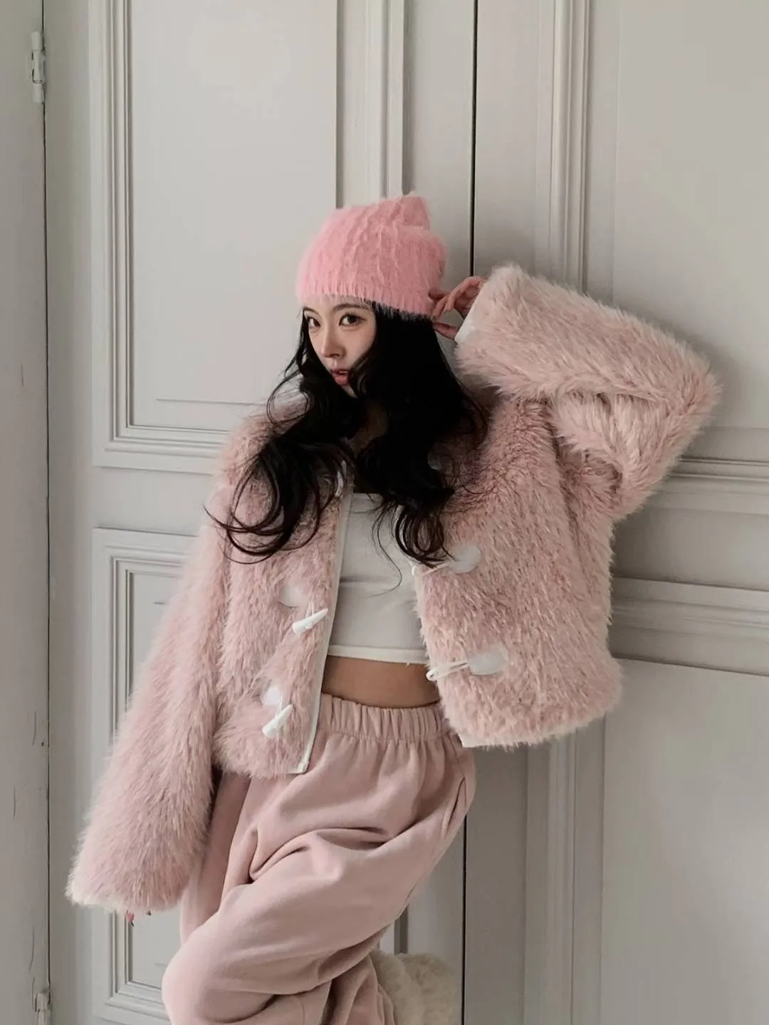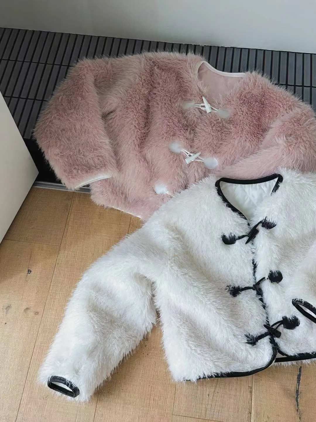 25LA05 長毛毛菱紋夾棉牛角扣外套 2色
