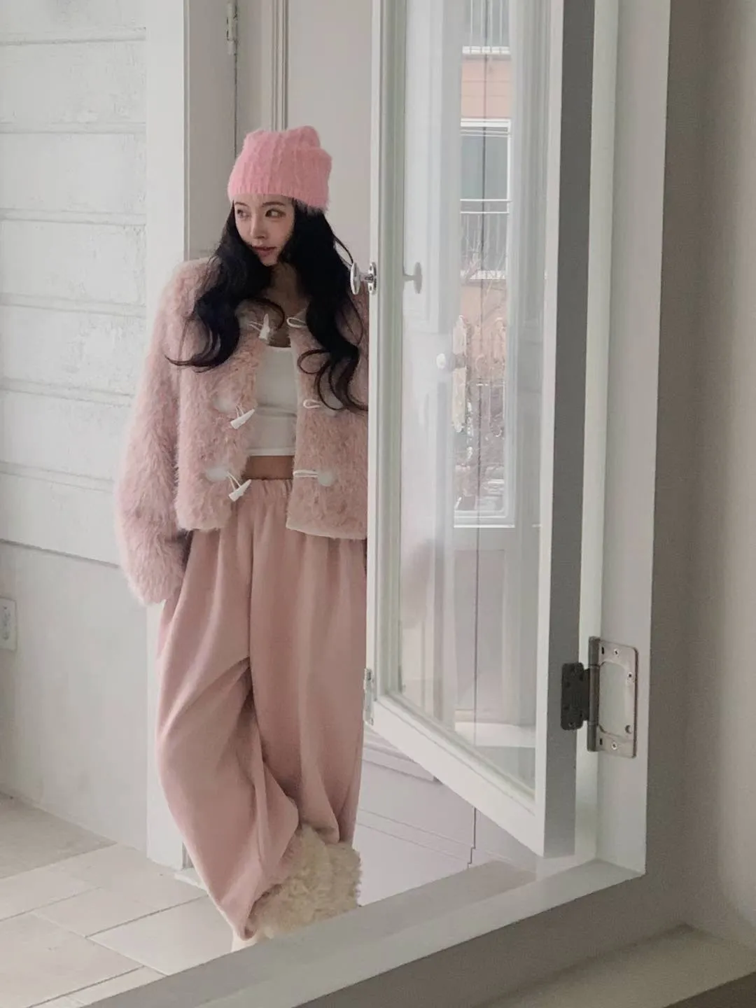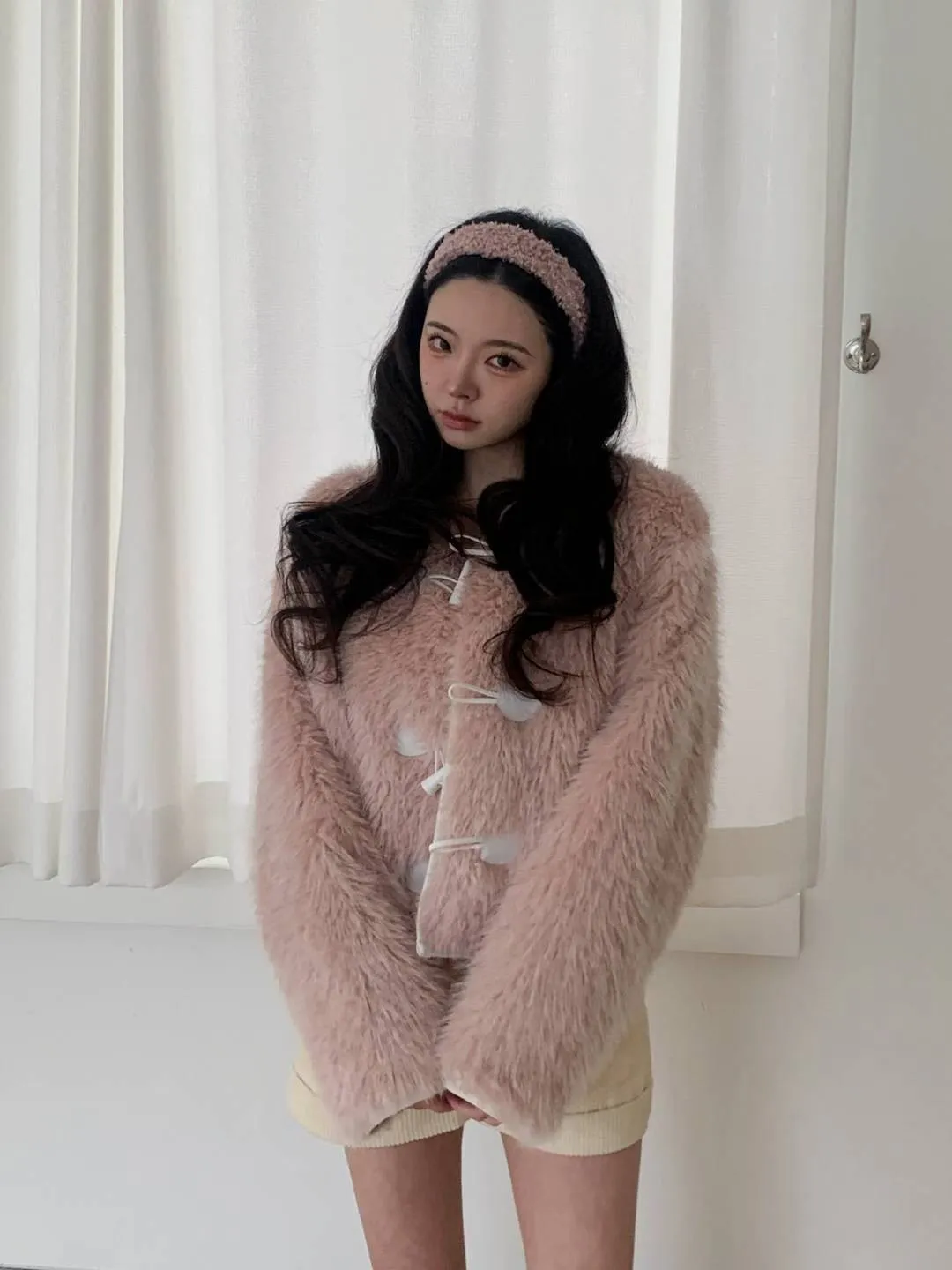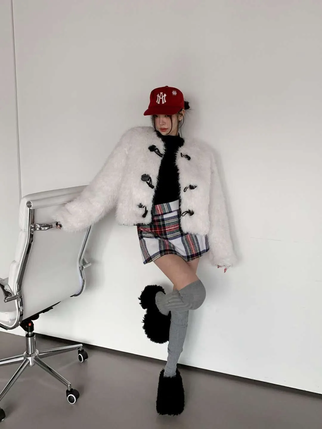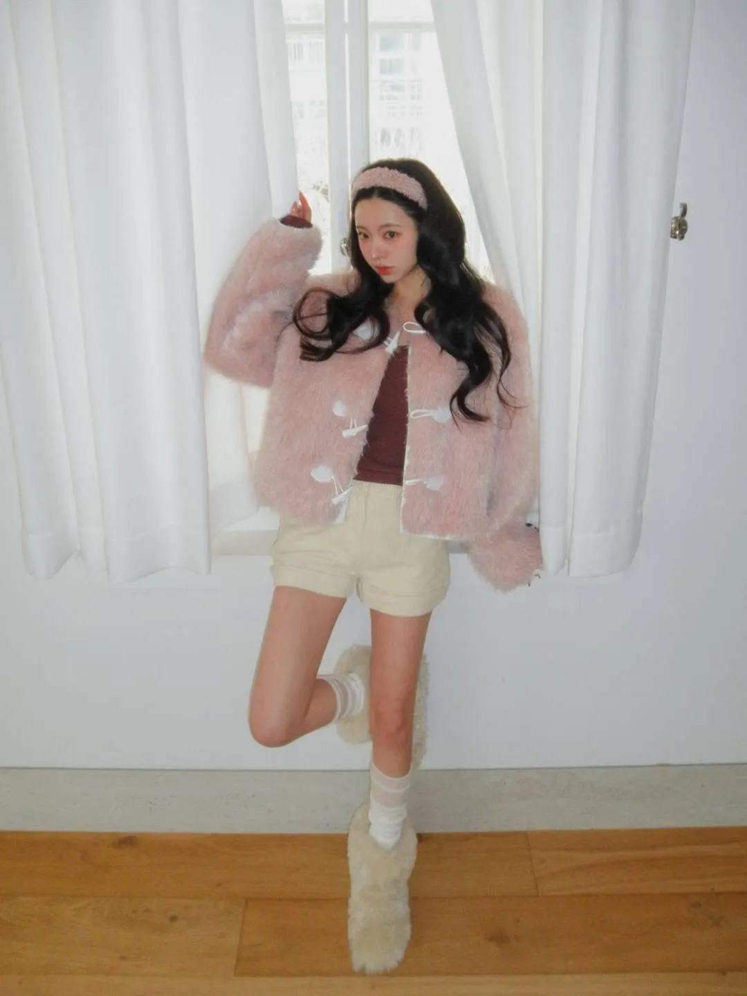 25LA05 長毛毛菱紋夾棉牛角扣外套 2色