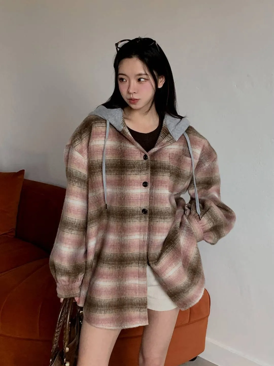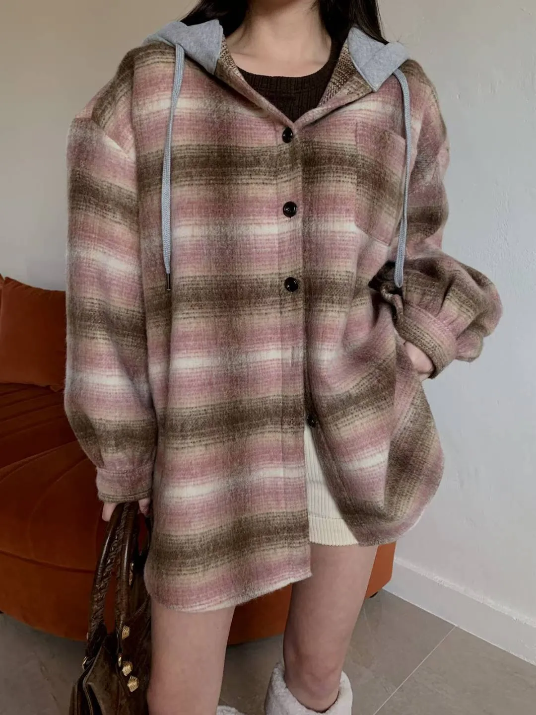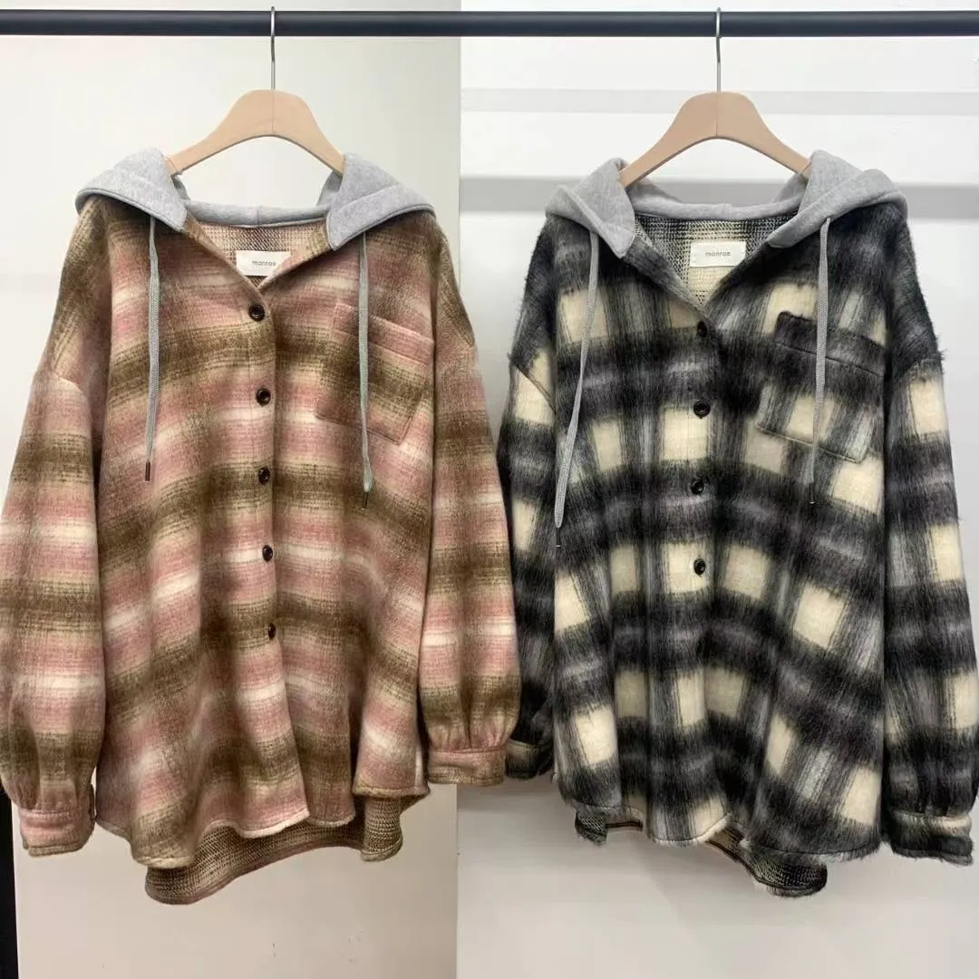25LA07 羊毛50%連帽格紋襯衫外套 2色