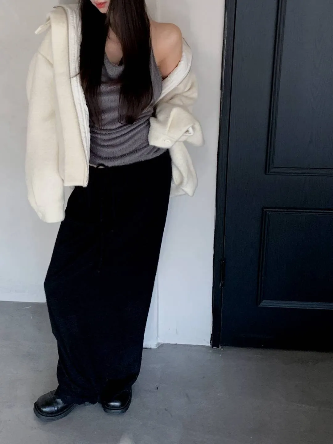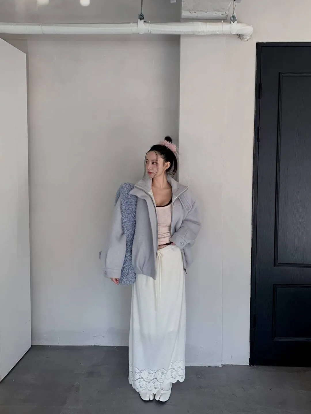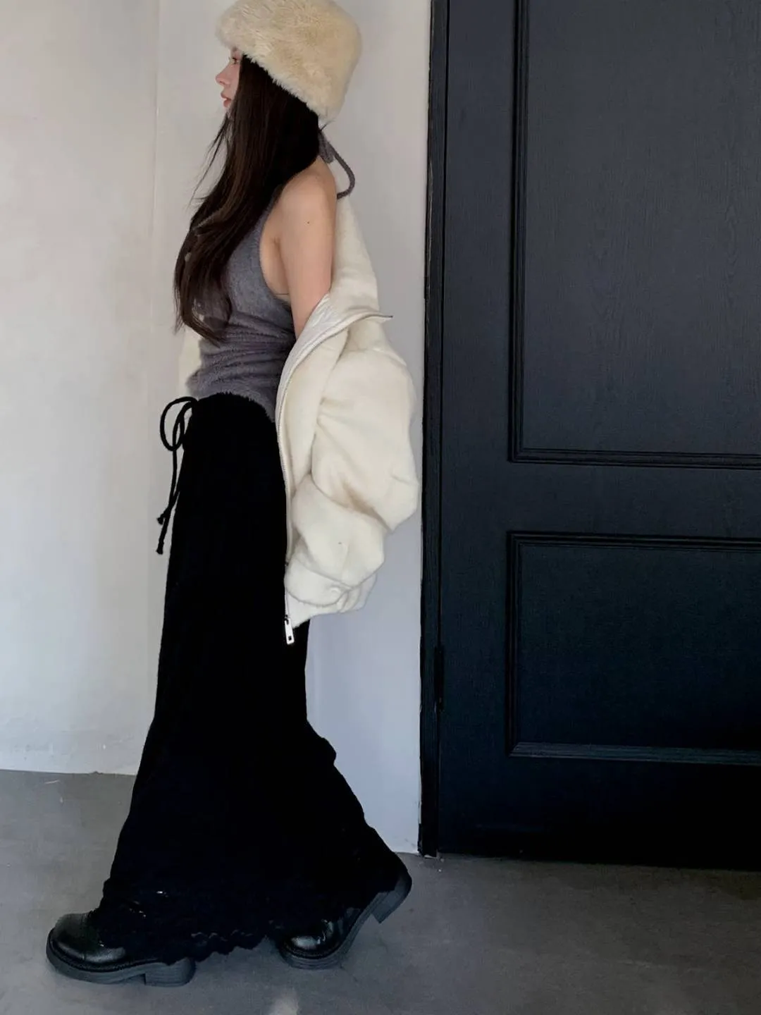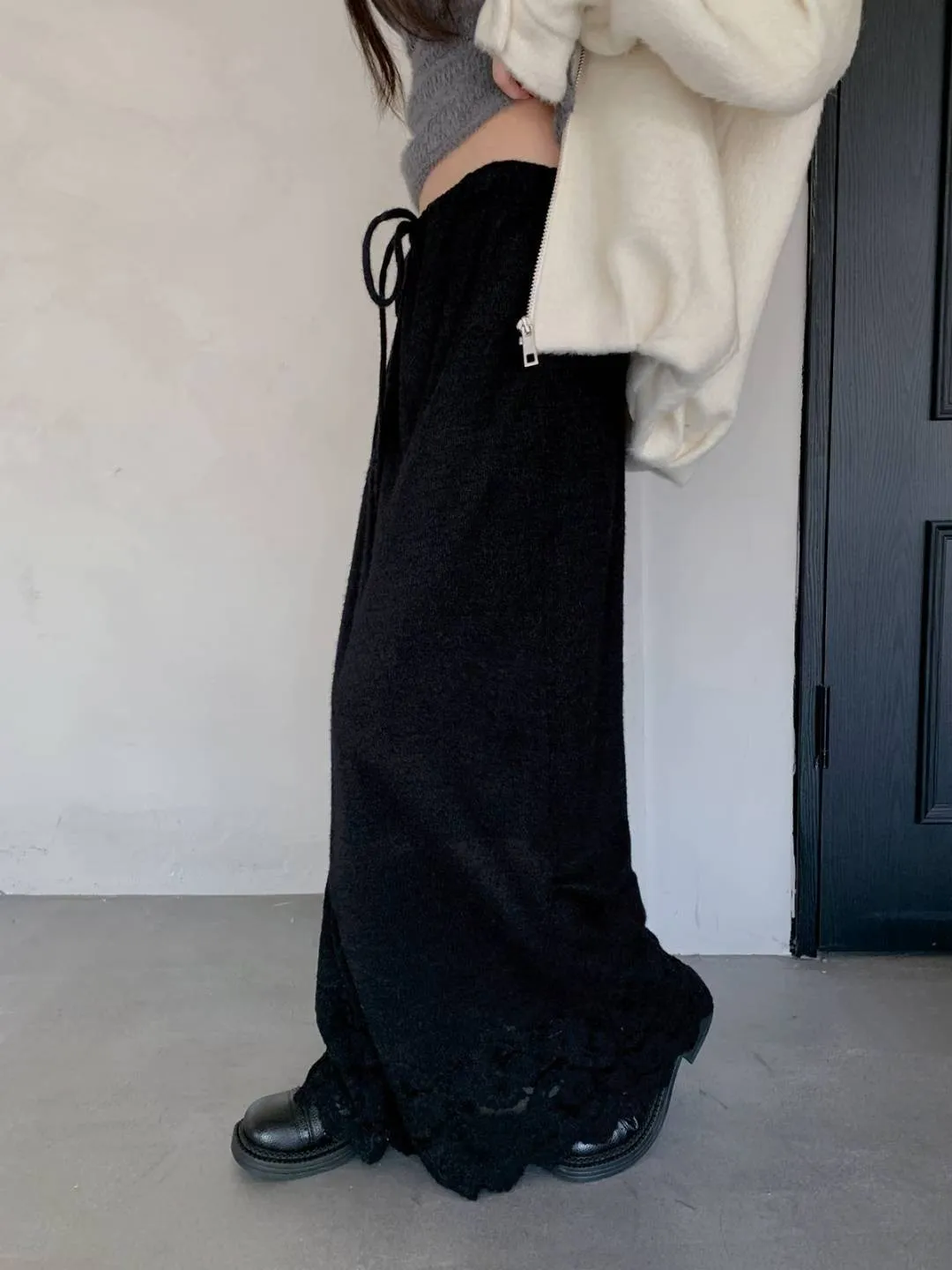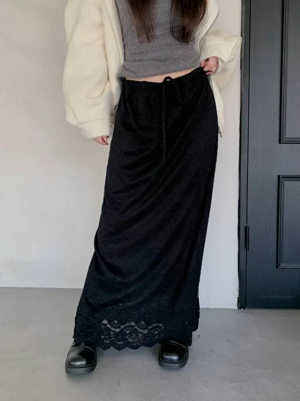 25LA10 絨料下擺蕾絲腰綁半身長裙 2色